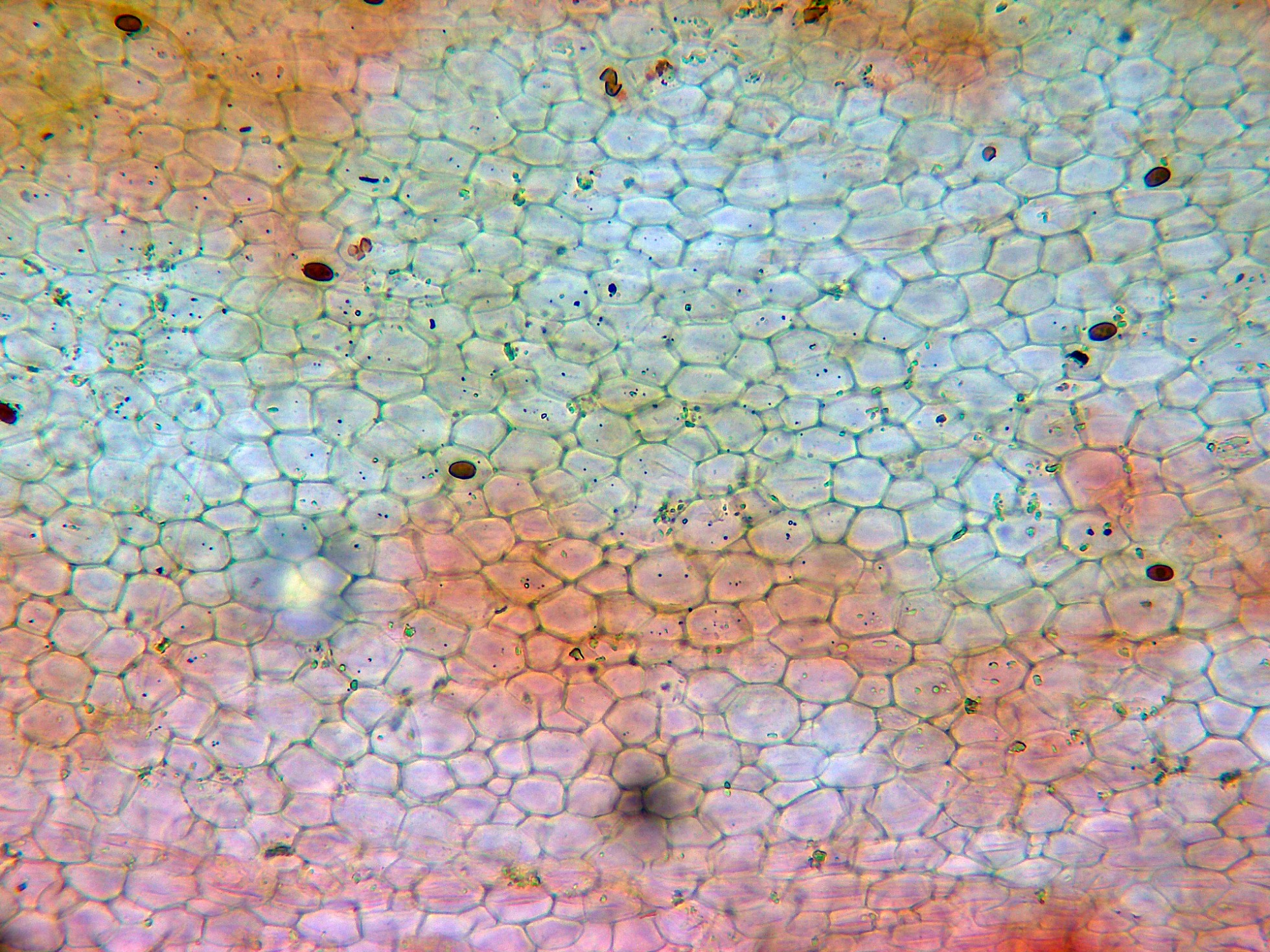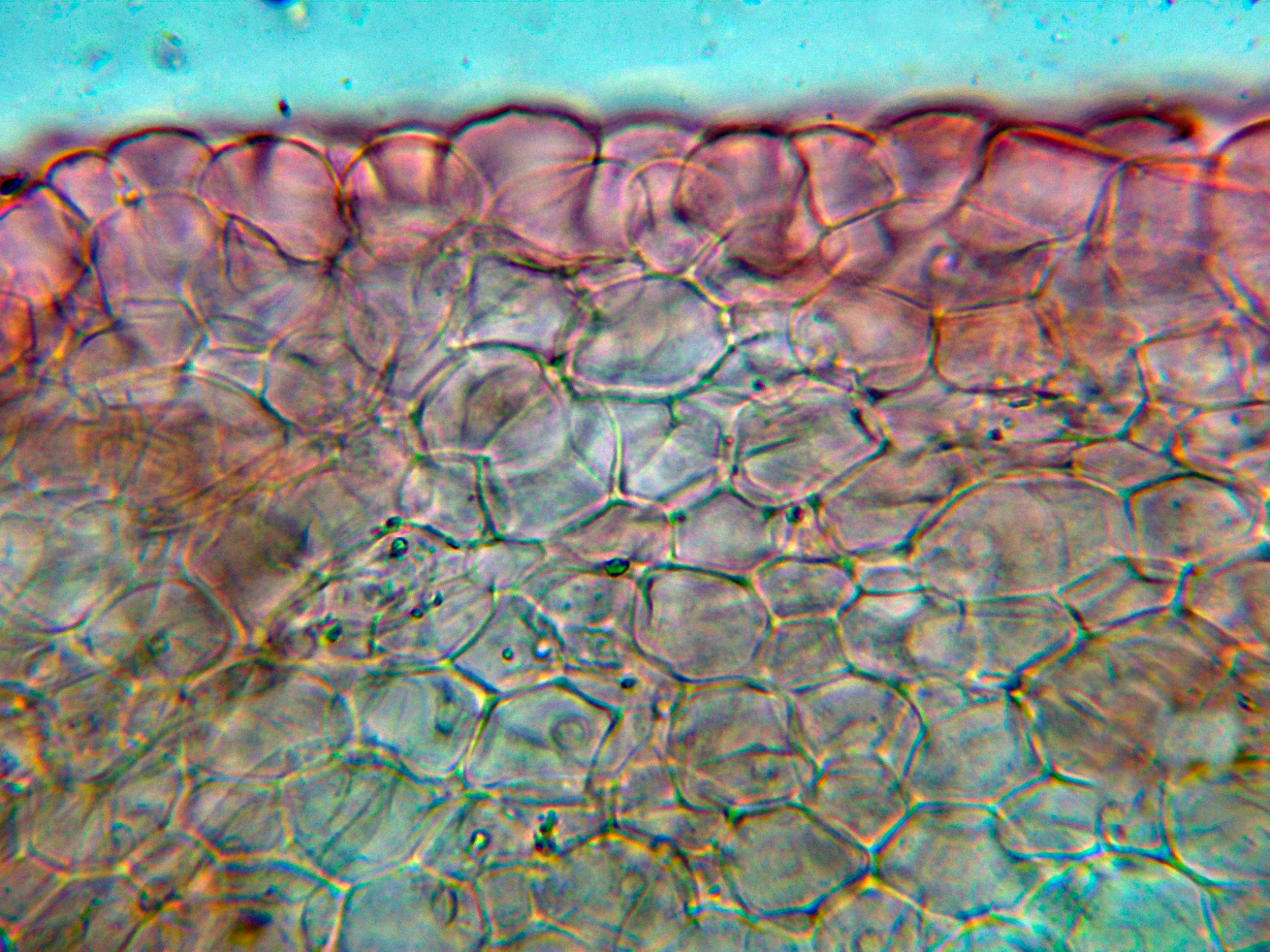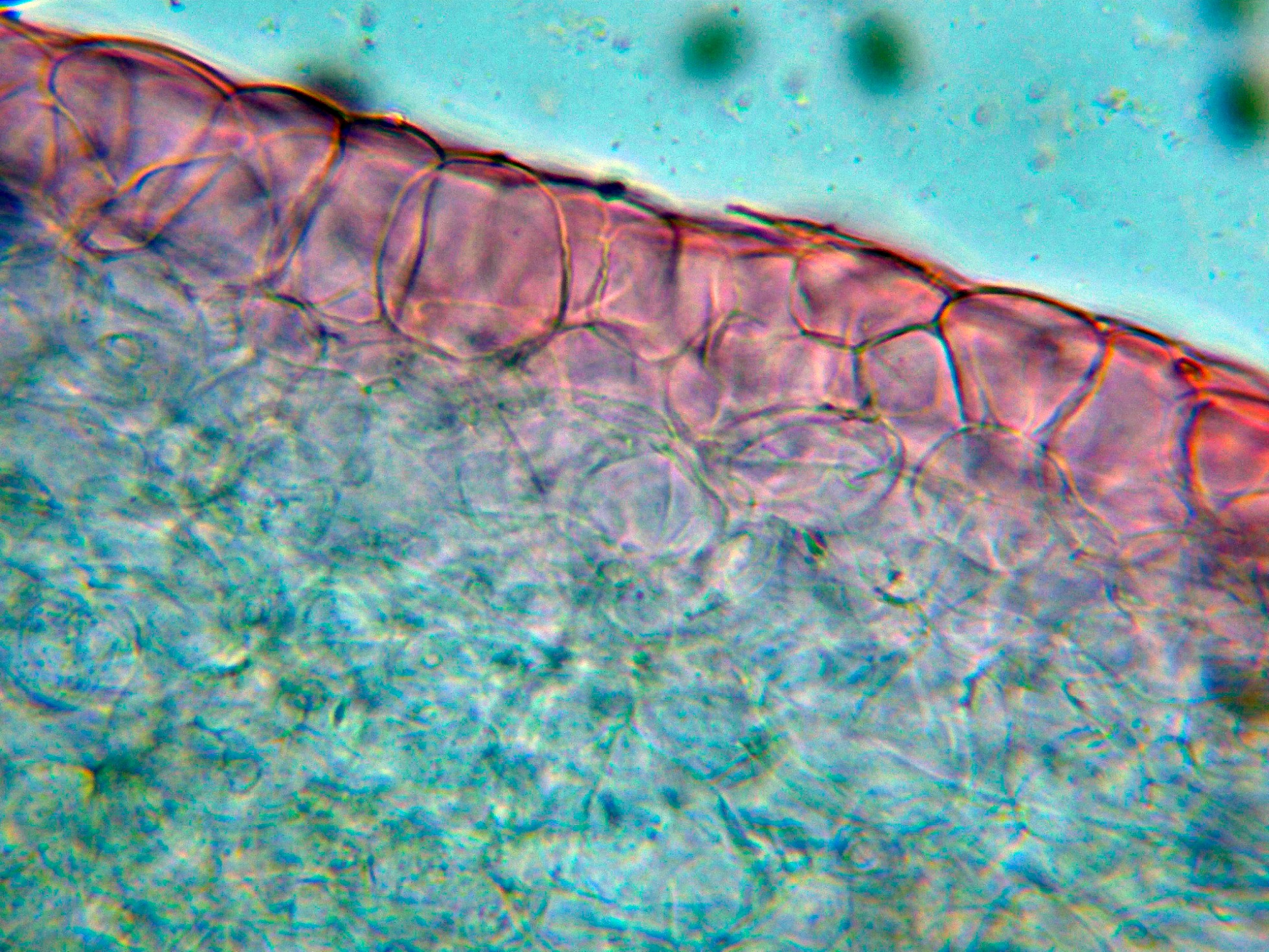 Pileipellis celulósica con hifas globosas, una sección de la pileipellis a 400 aumentos en Rojo Congo diluído: