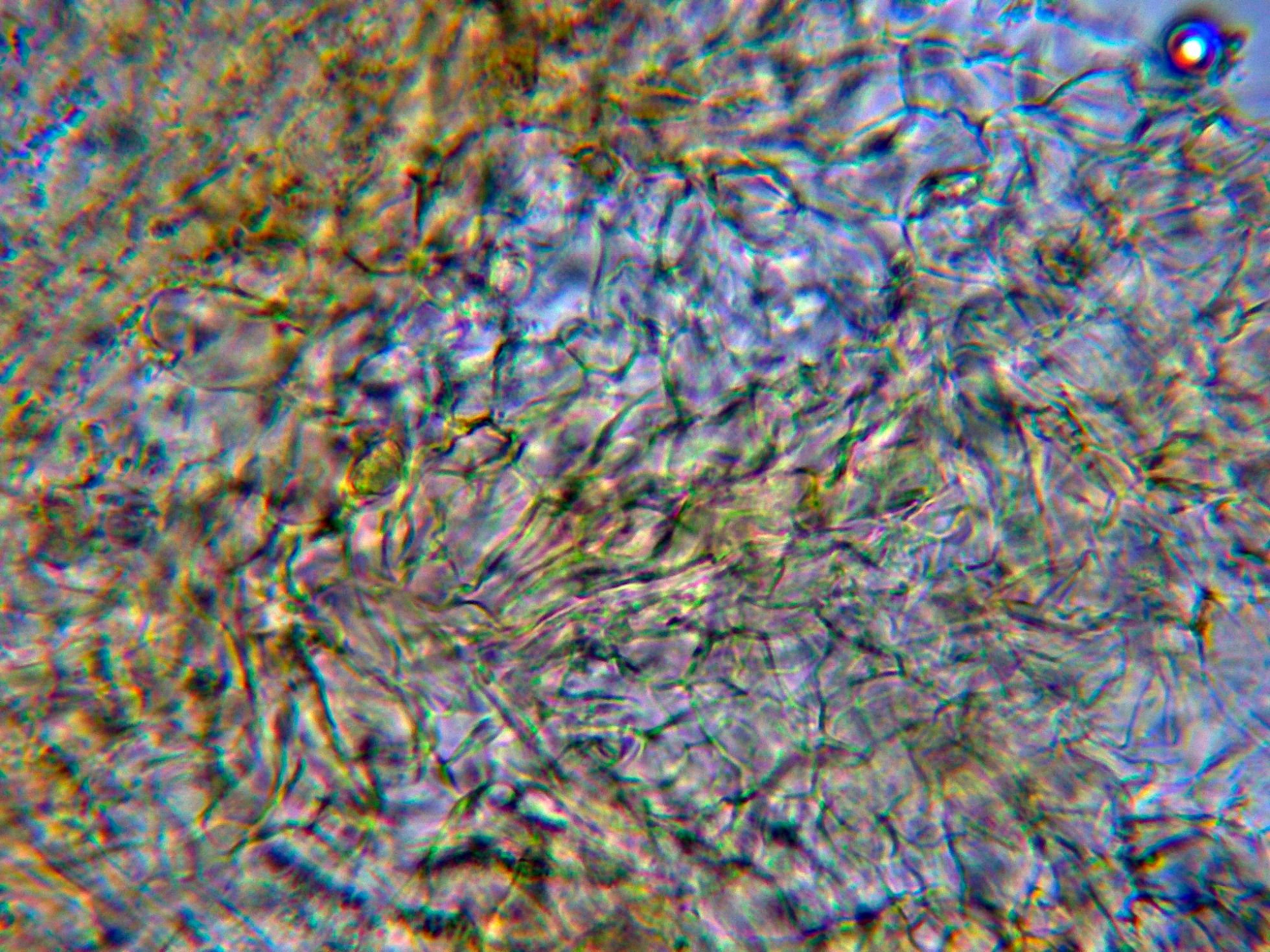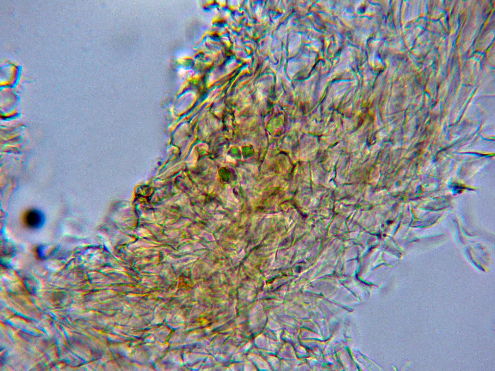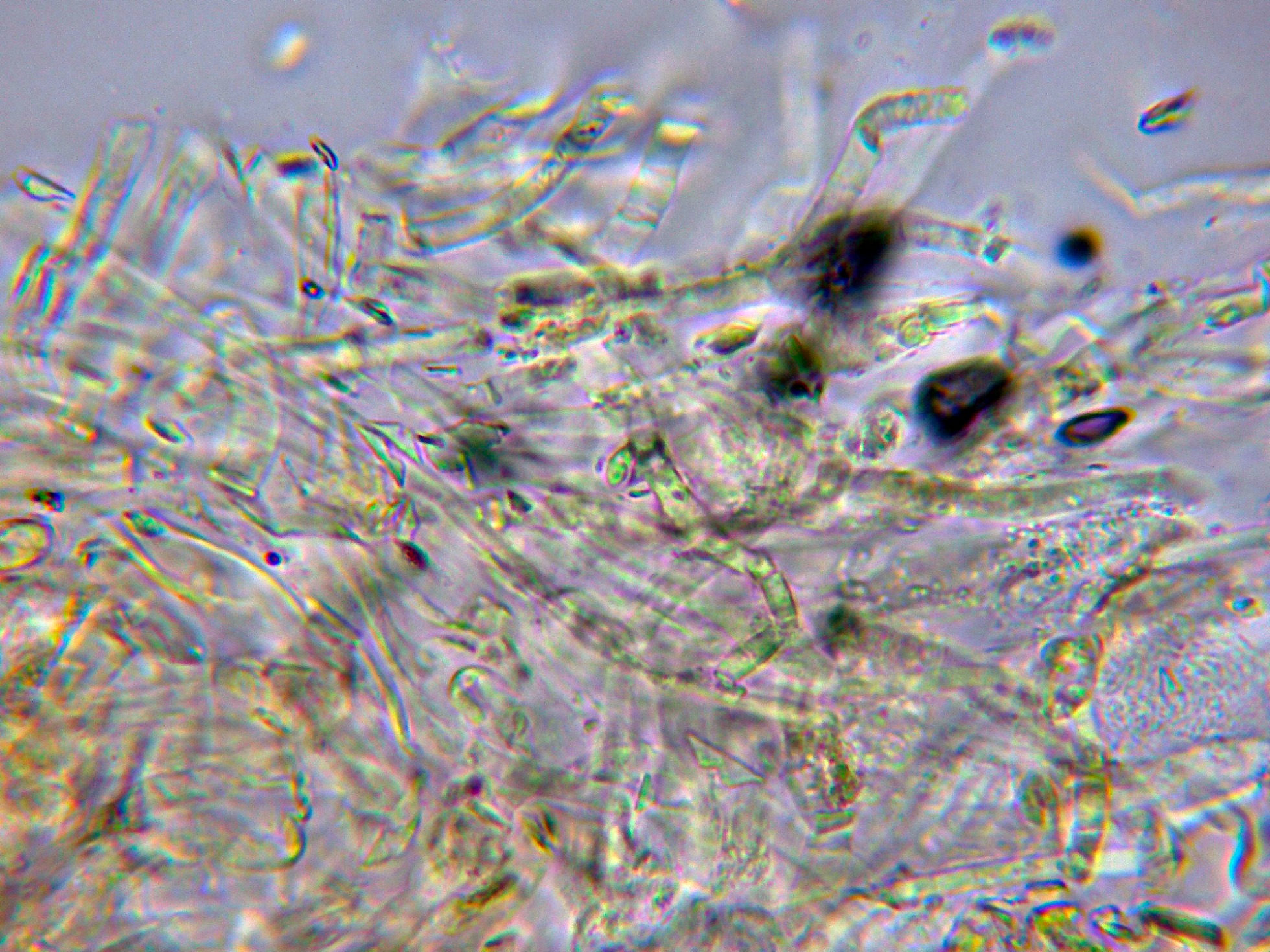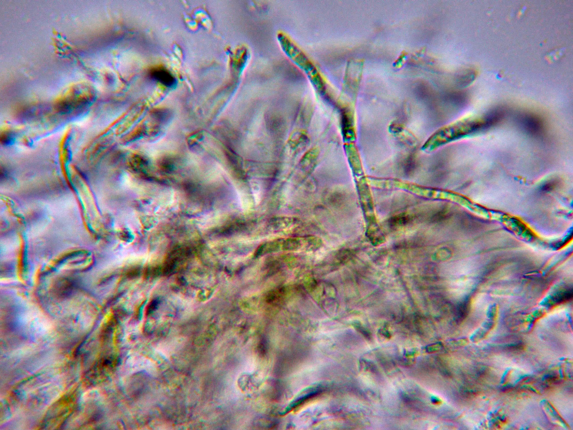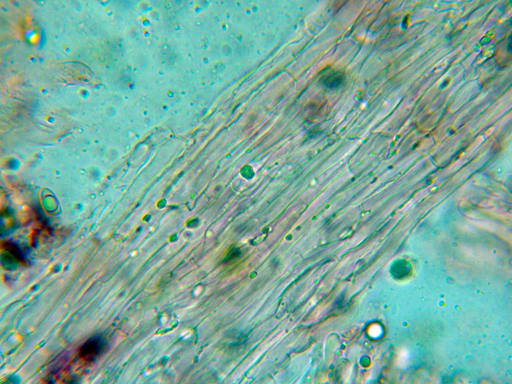 Por debajo de esta capa ya otras hifas más anchas y compactadas con pigmento amarillento en su interior: