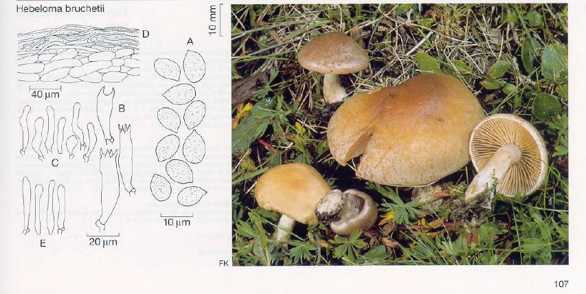 Observaciones: Determinación hecha siguiendo las Claves de "Les Champignons de Suisse", que con presencia de cortina, esporas entre elipsoides y ovoides, como hábitat preferente en zonas alpinas, con sombrero marrón ocráceo y esporas de 8-19 x 5,2-6,5 µm., conducen al Hebeloma bruchetii, dejo un pantallazo del mismo autor con la micro: