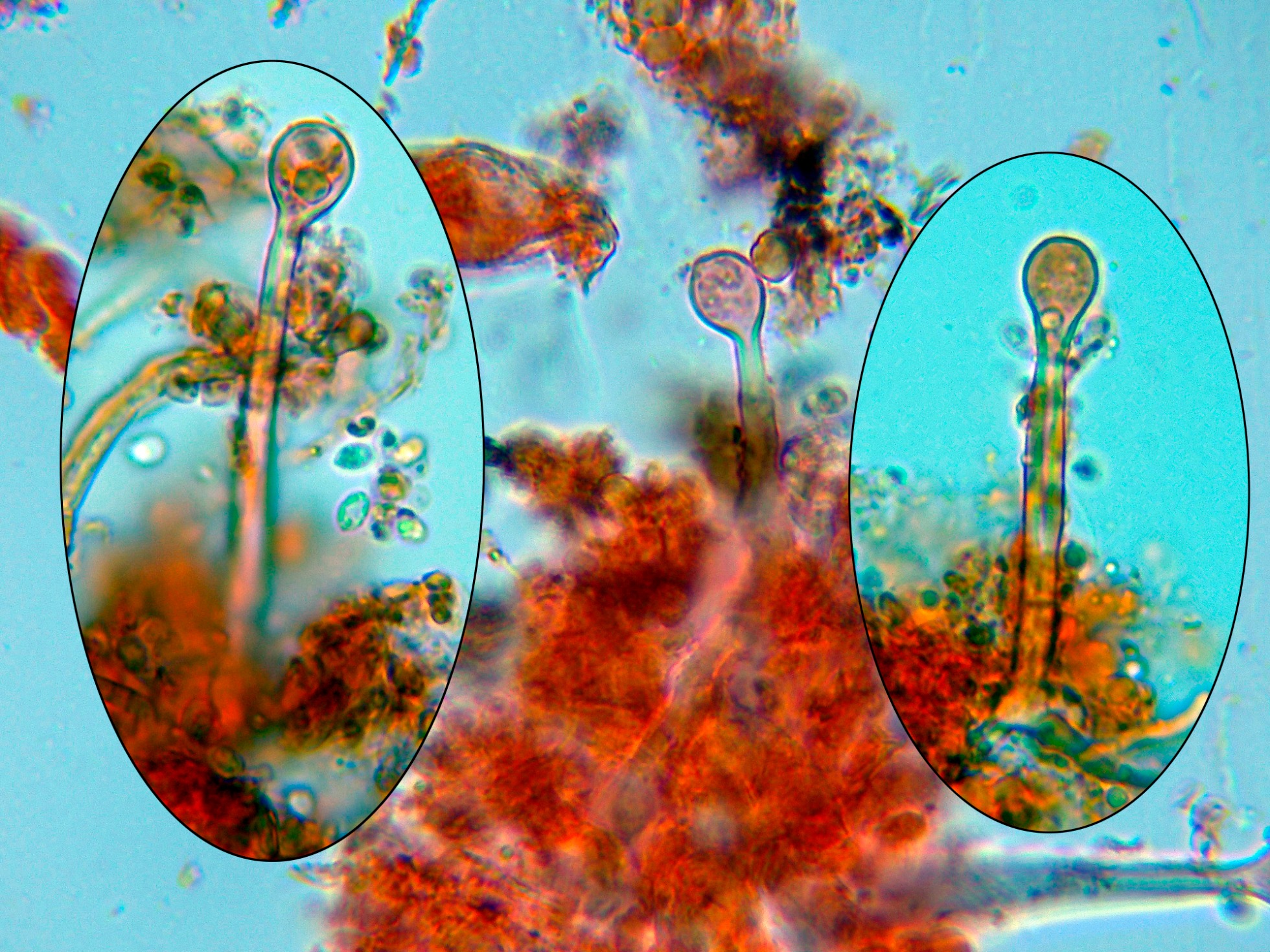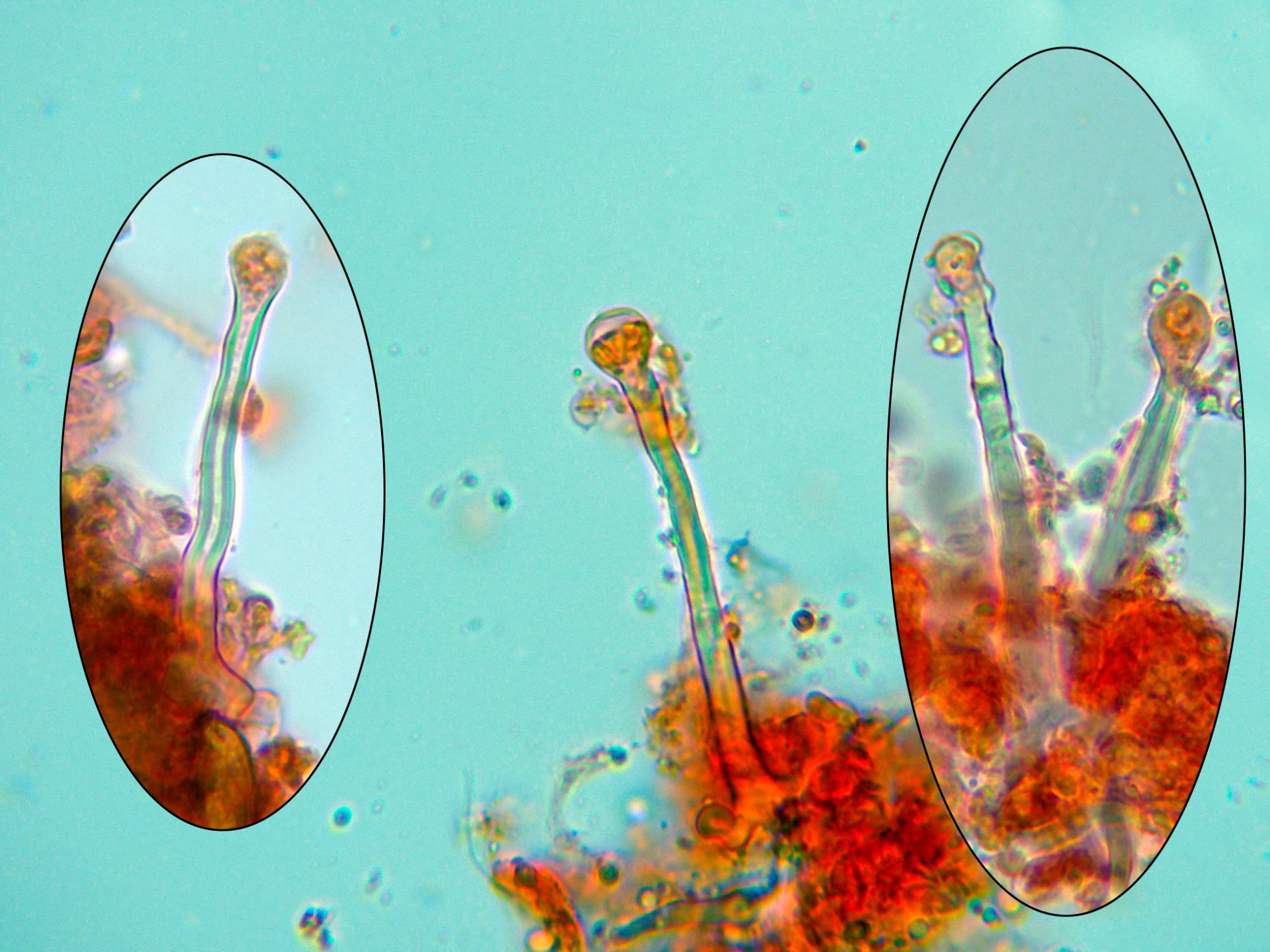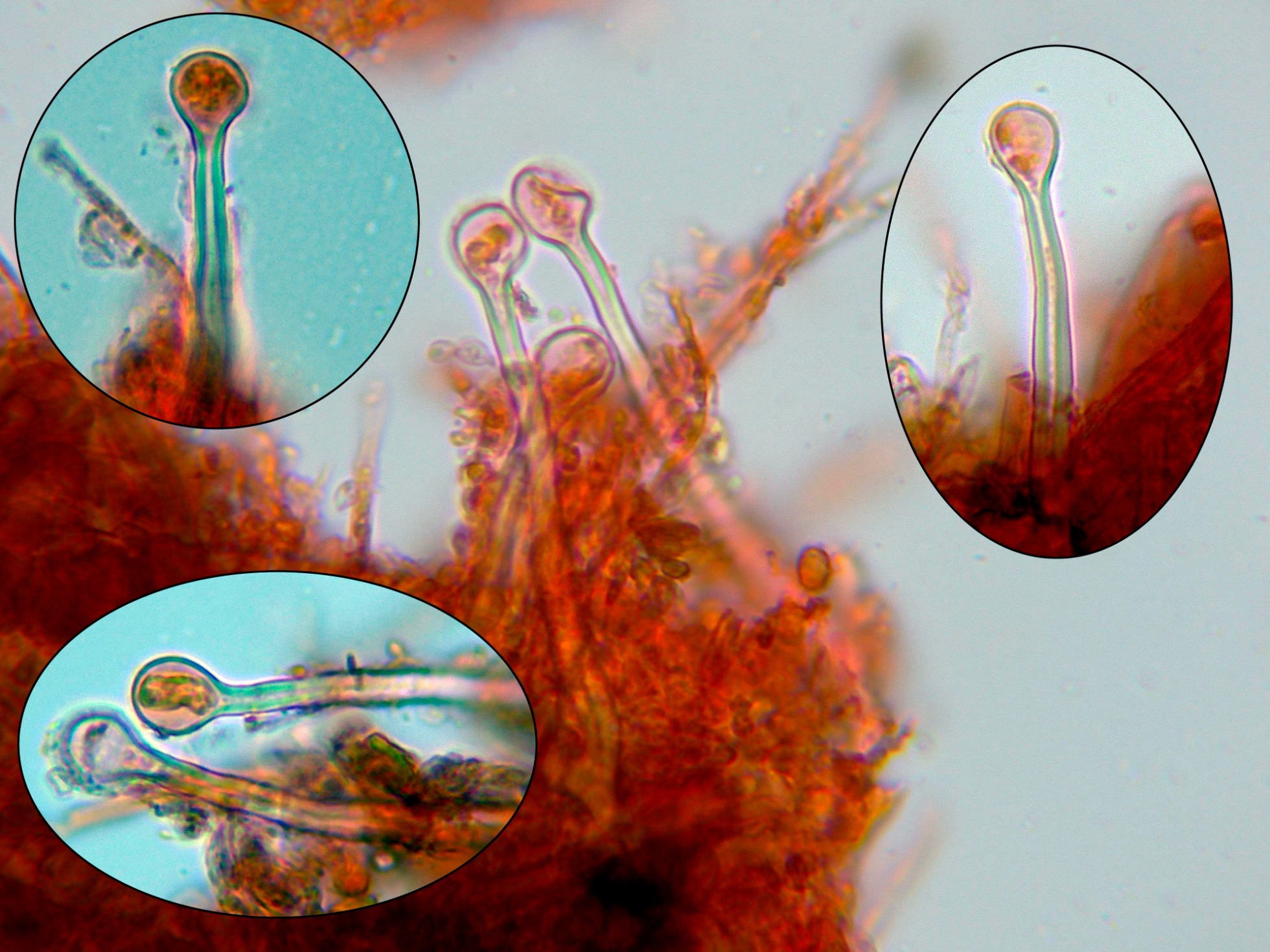 Numerosos liocistidios de pared gruesa con terminaciones globosas, en muchos casos cubiertas por una sustancia grumosa que se disuelve en KOH: