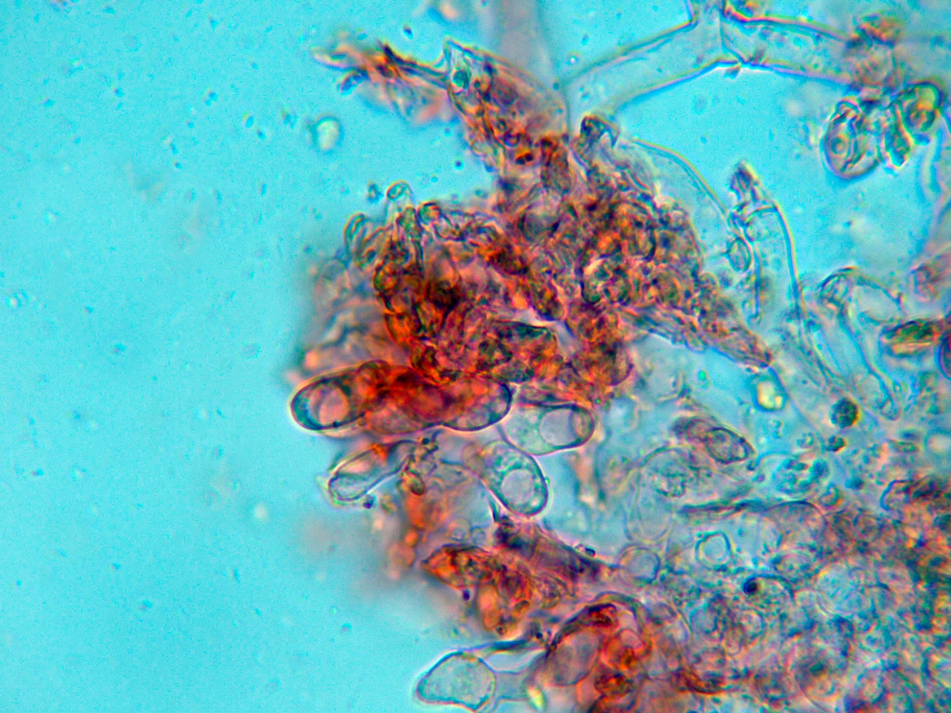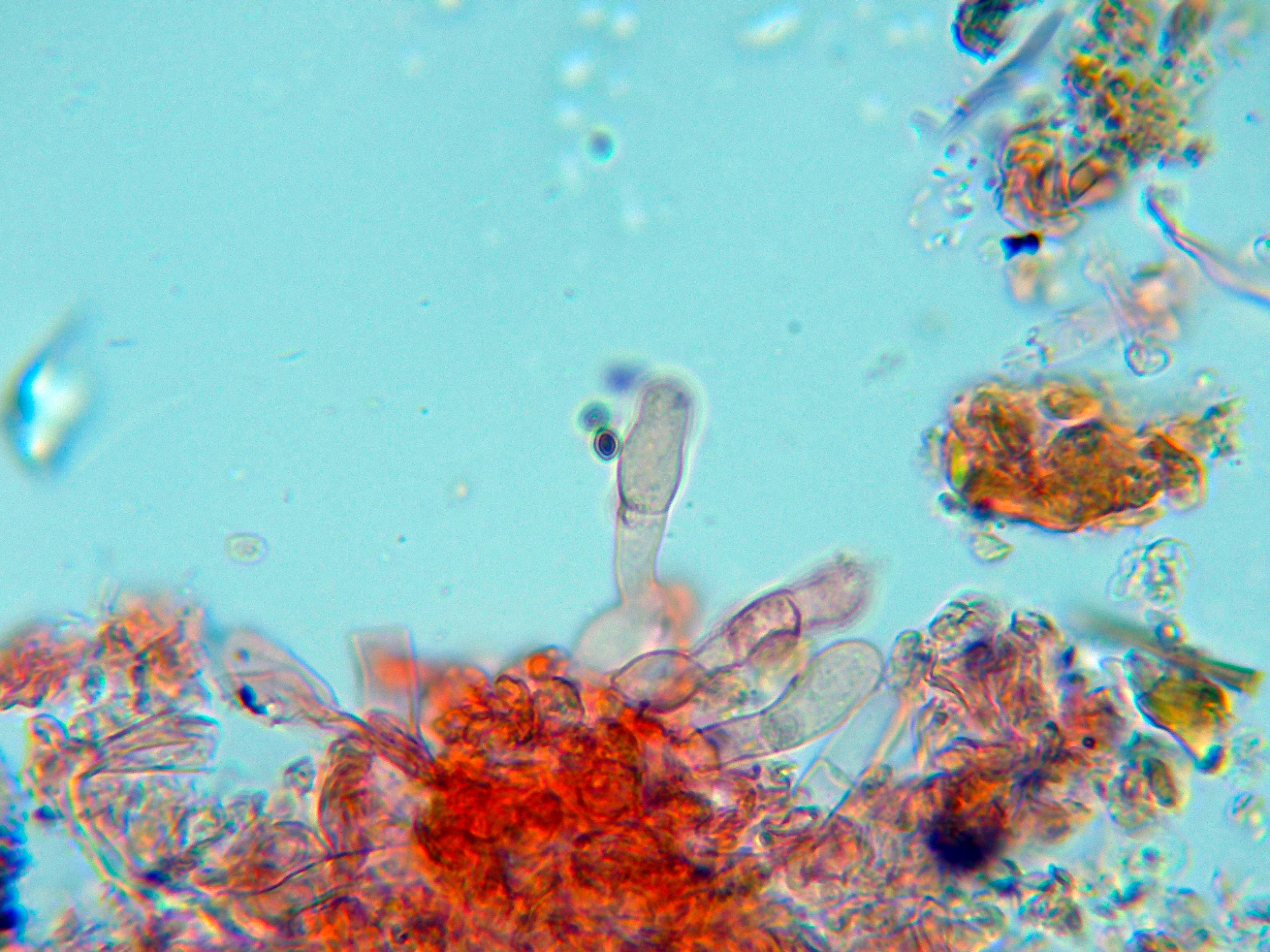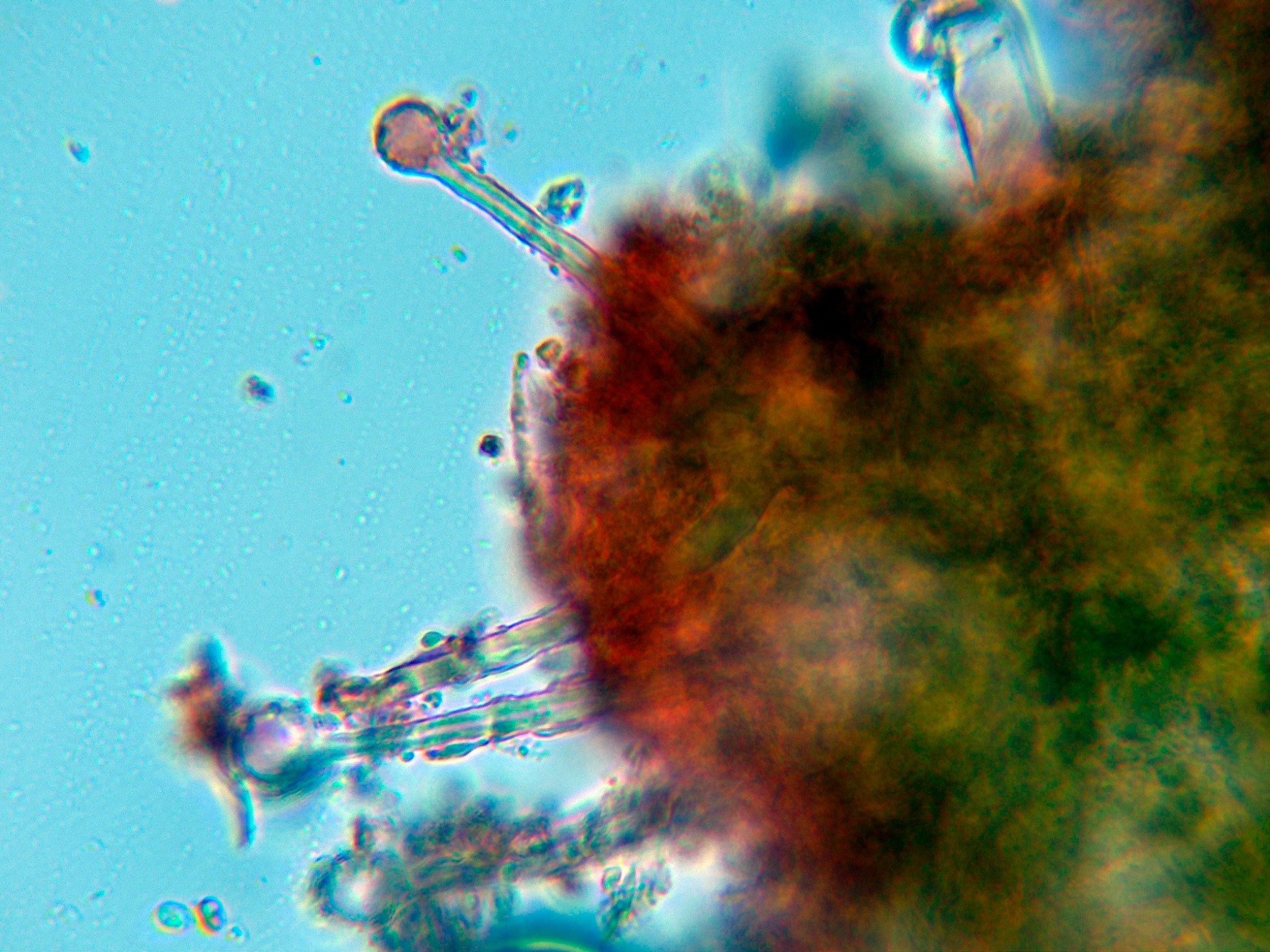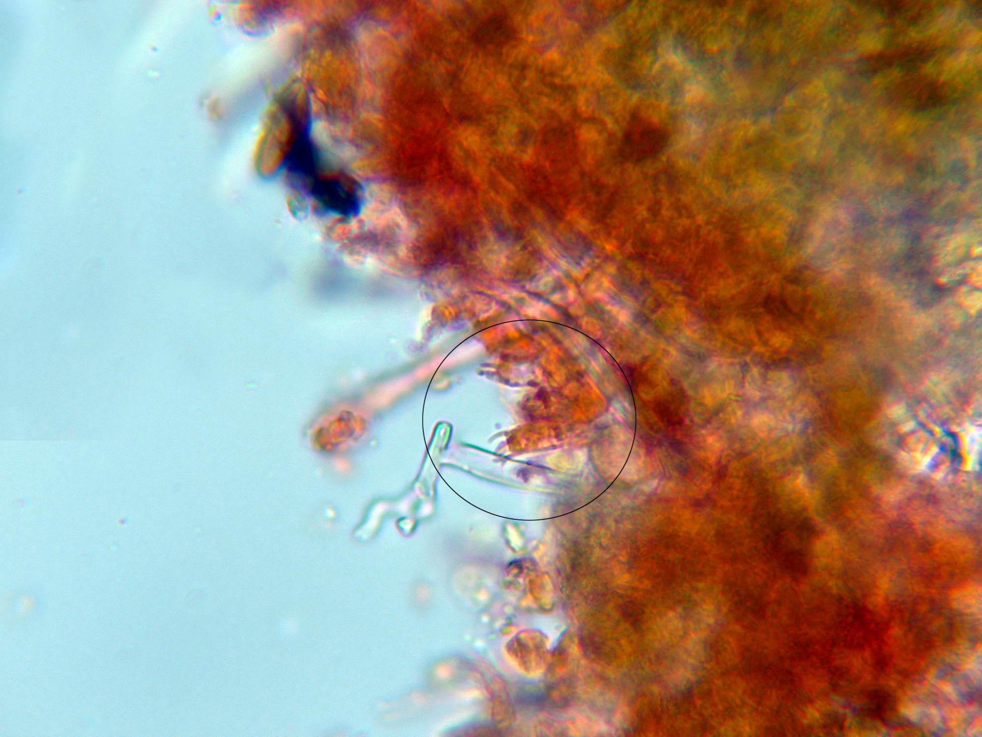 Numerosos liocistidios de pared gruesa con terminaciones globosas, en muchos casos cubiertas por una sustancia grumosa que se disuelve en KOH:
