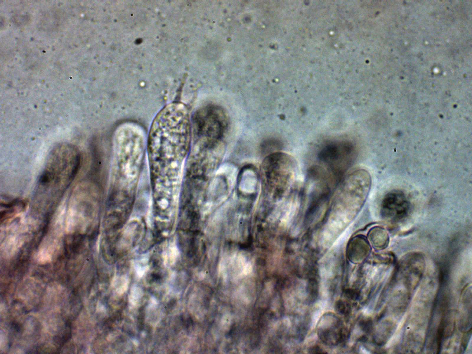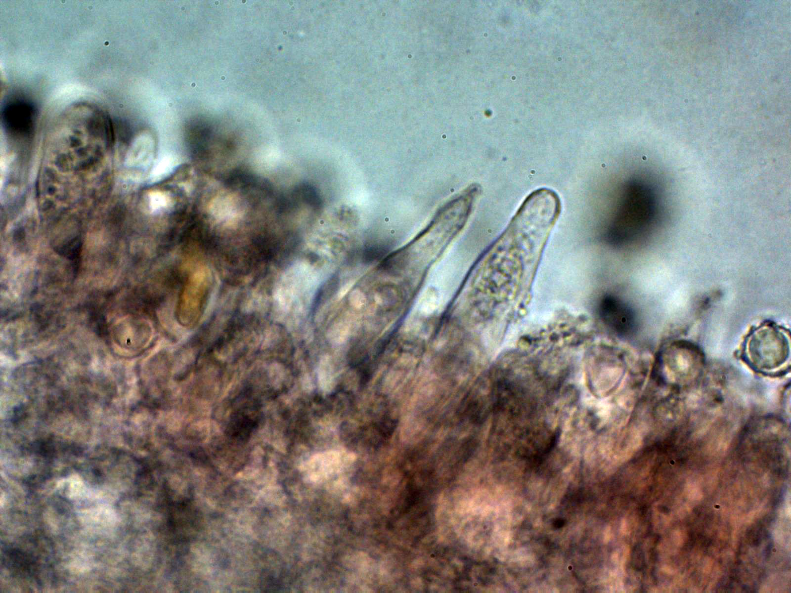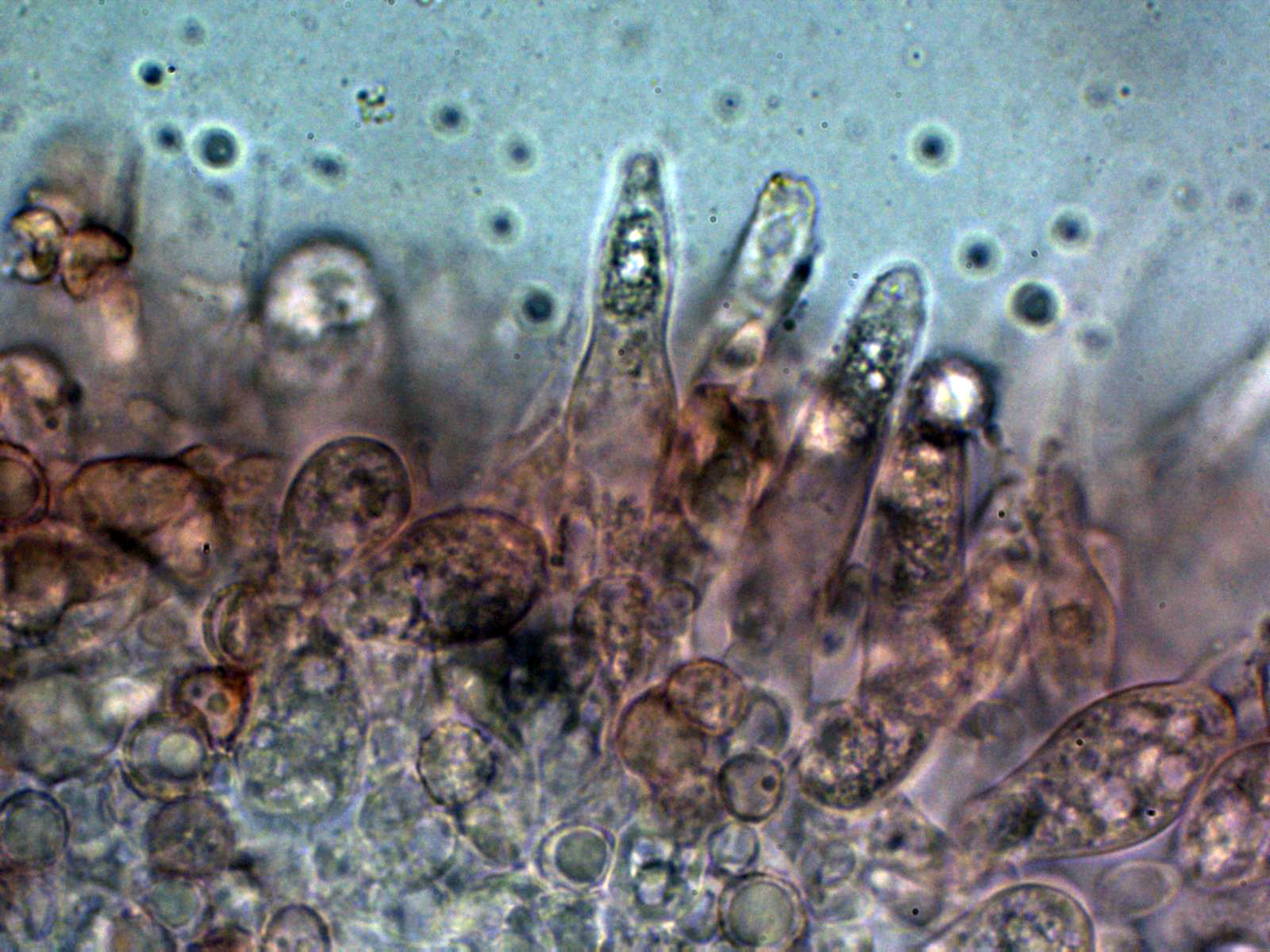 Pleurocistidios dispersos entre lanceolados y fusiformes, algunos ensanchados en su base: