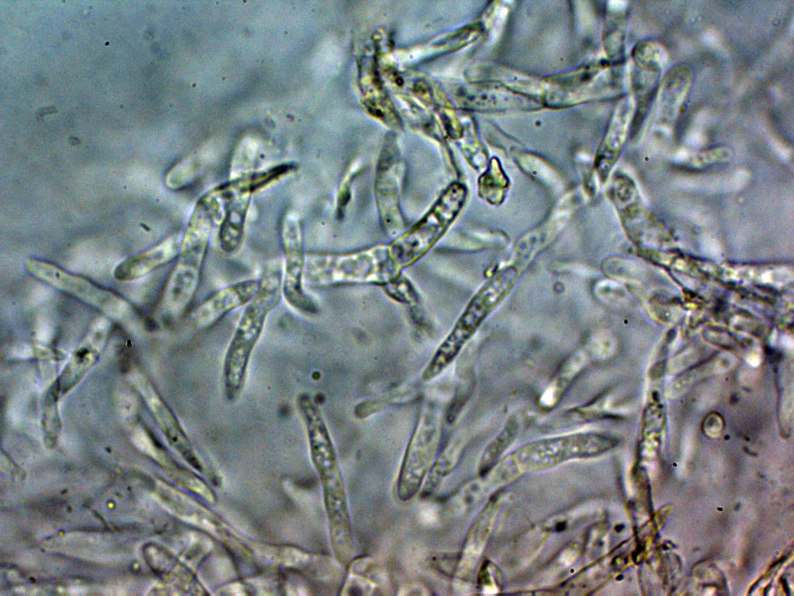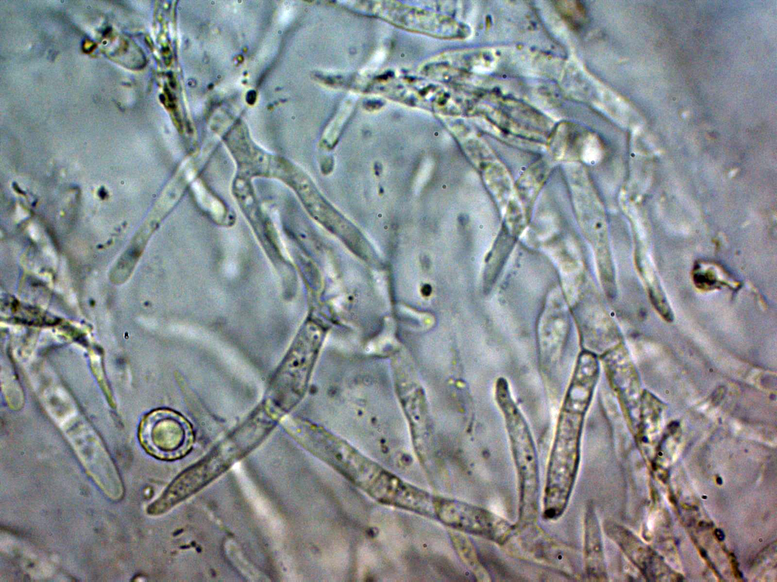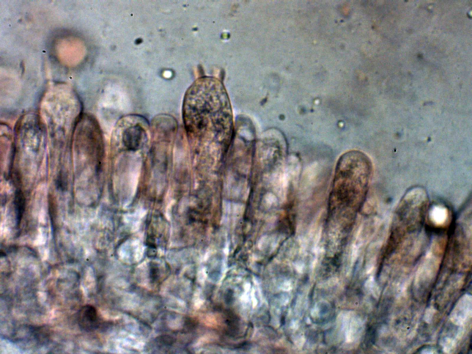 Pleurocistidios dispersos entre lanceolados y fusiformes, algunos ensanchados en su base: