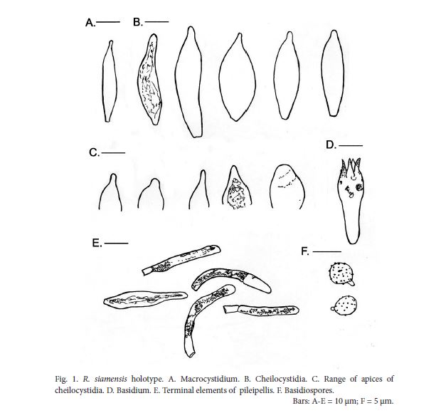 Observaciones: Dado el hábitat (directamente sobre la arena del suelo), mis dos primeras opciones fueron las de la Russula arenaria o la Russula arenicola, la poca información que he podido encontrar de ambas las circunscriben en zonas templadas (no en climas tropicales) y además sus características tampoco me encajaban. Teniendo en cuenta el hábitat (bajo Senna siamea) mi opción era la Russula siamensis, en este caso todos los elementos parecían encajar bastante bien, dejo una captura de imágen de la microscopía de la Russula siamensis de Researchgate.