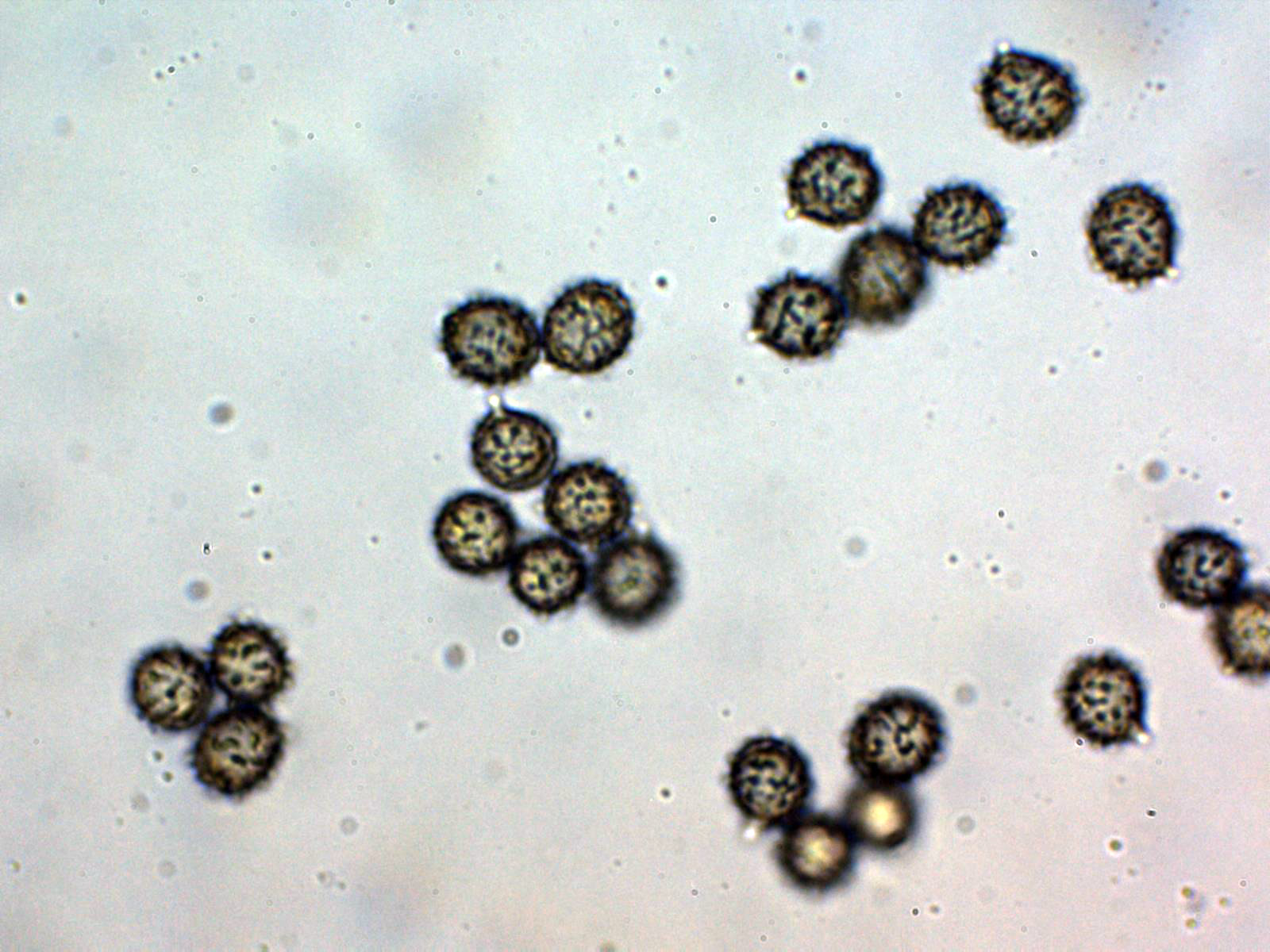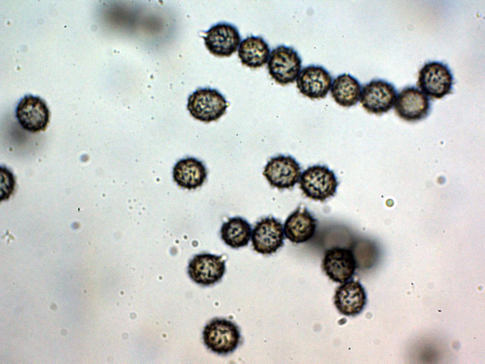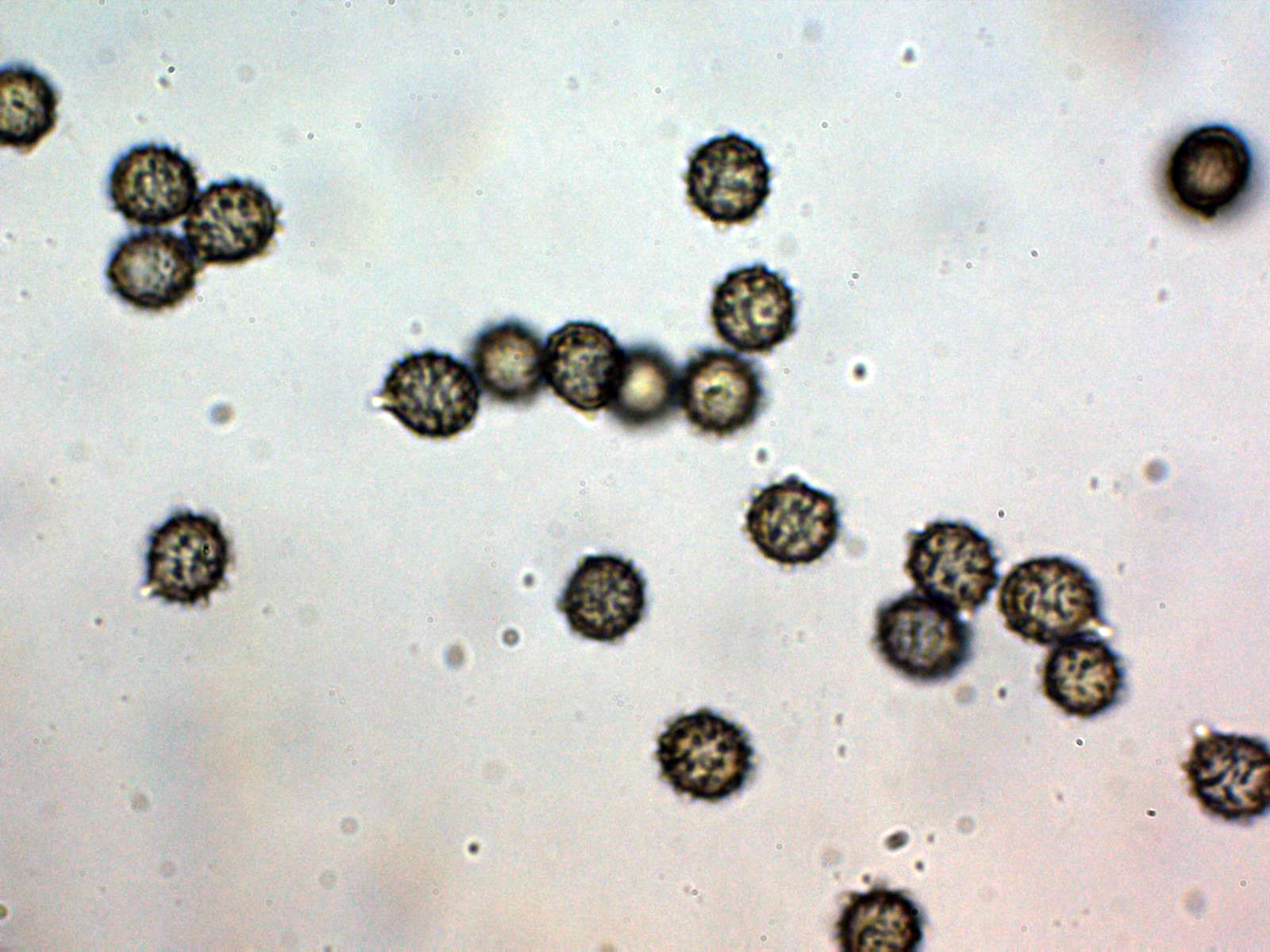 Basidiosporas entre esféricas y ovoides, con una marcada apícula, con notables verrugas que en algunos casos se unen entre sí para formar cortas crestas, pero sin formar en ningun caso retículo, las esporas en Reactivo de Melzer con unas medidas de: