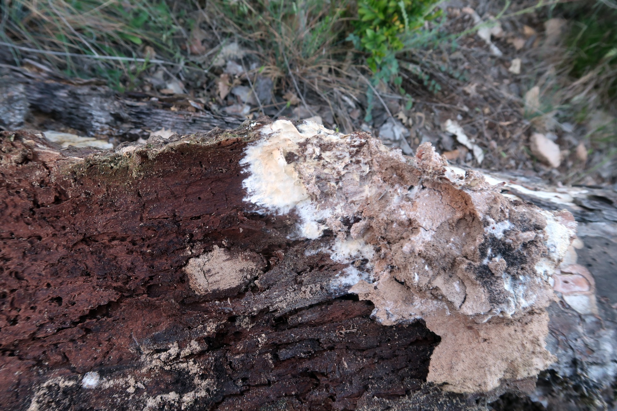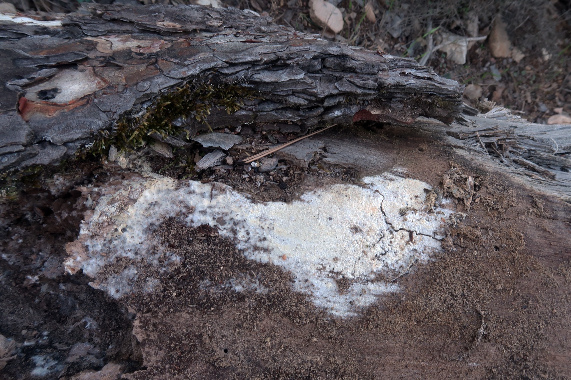 Un Corticial localizado este pasado domingo por debajo de la corteza y sobre la madera de un tronco de Pinus spp., este es uno de los pocos hongos que se dejan ver en estos momentos.