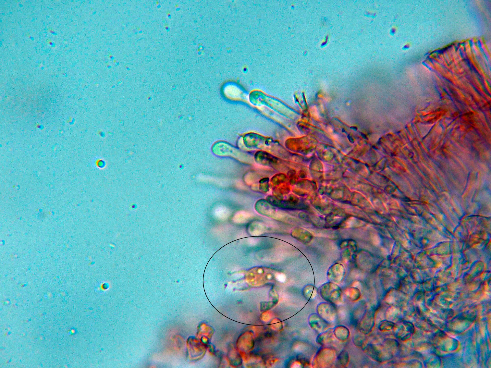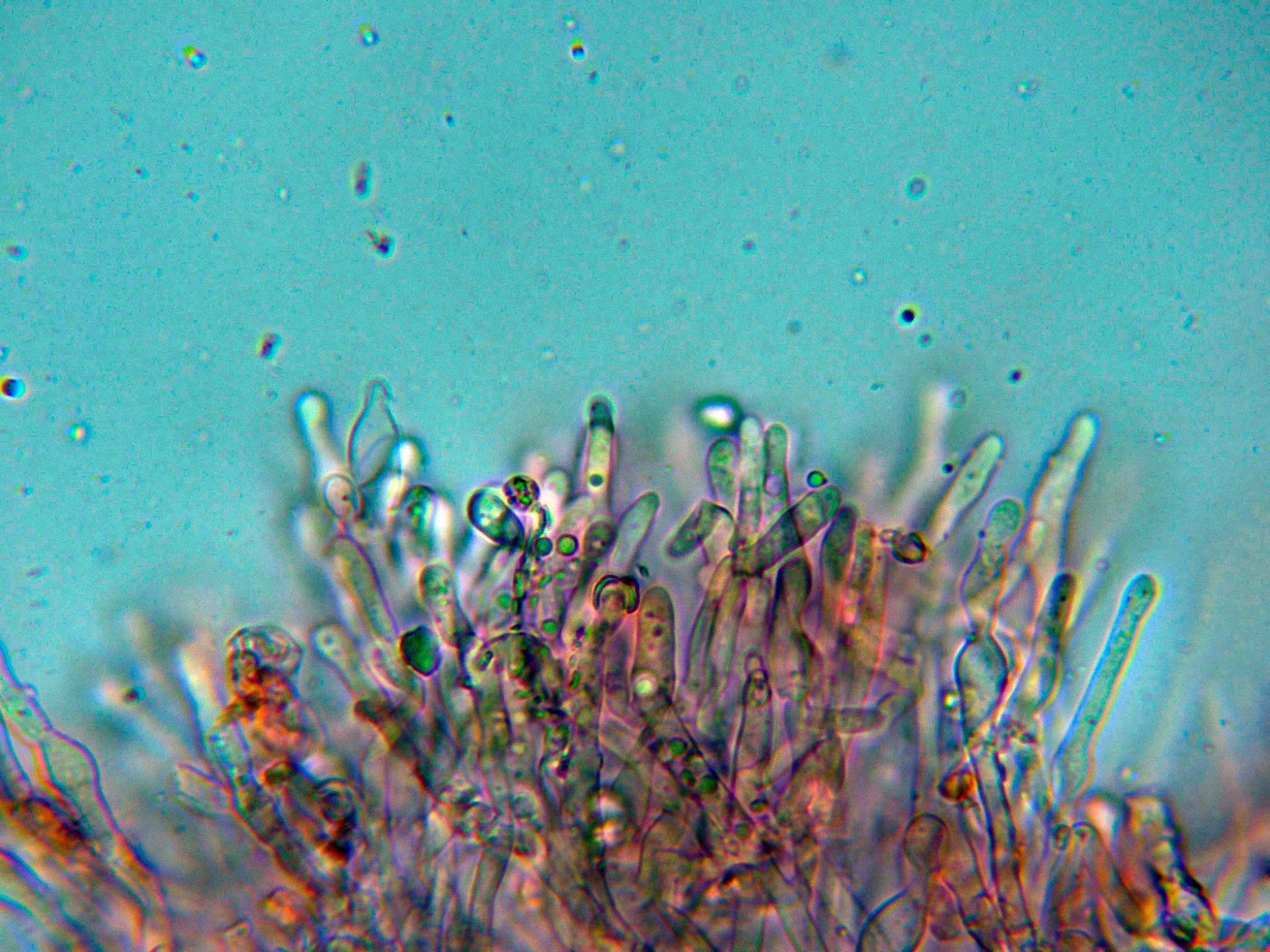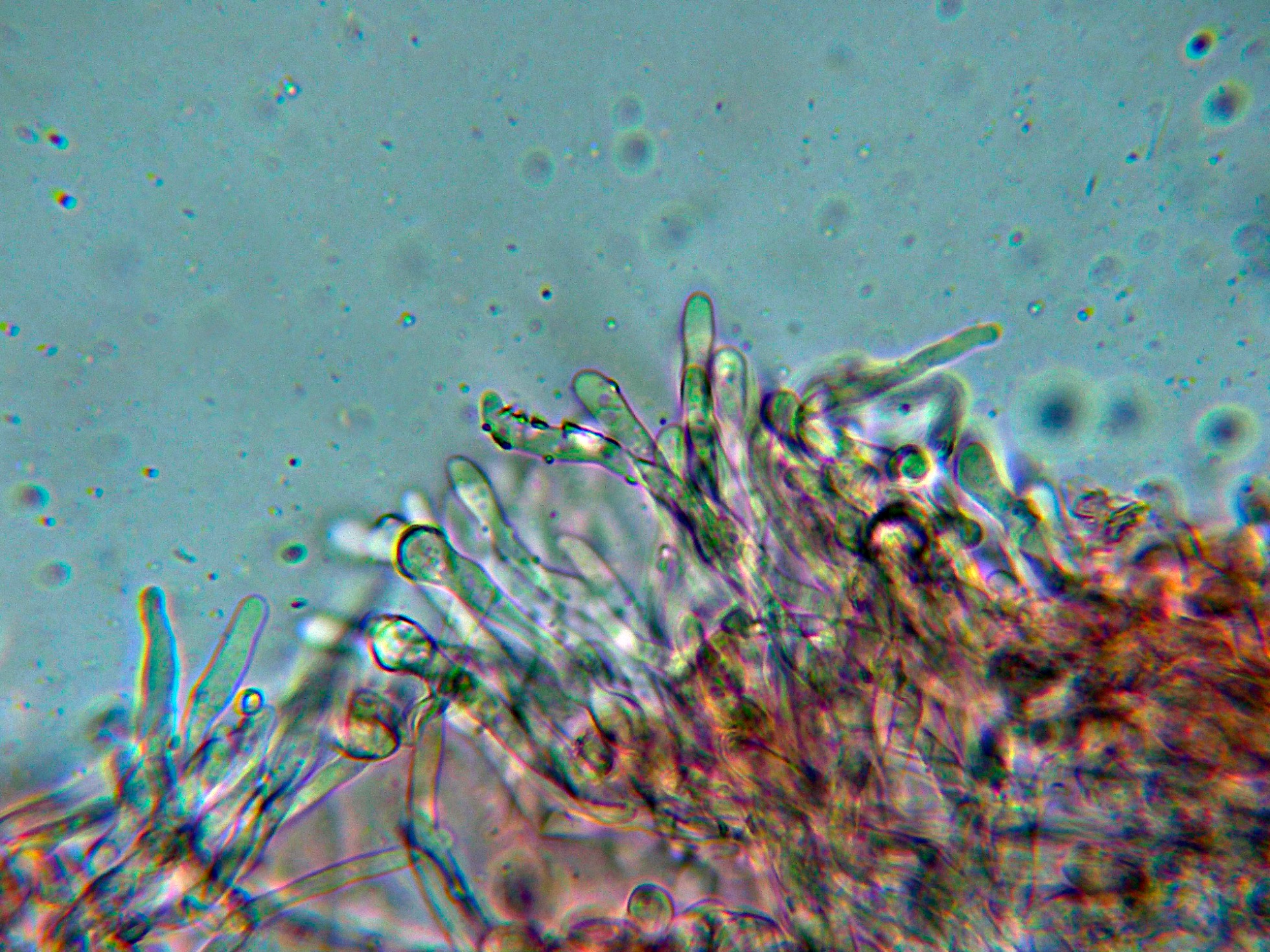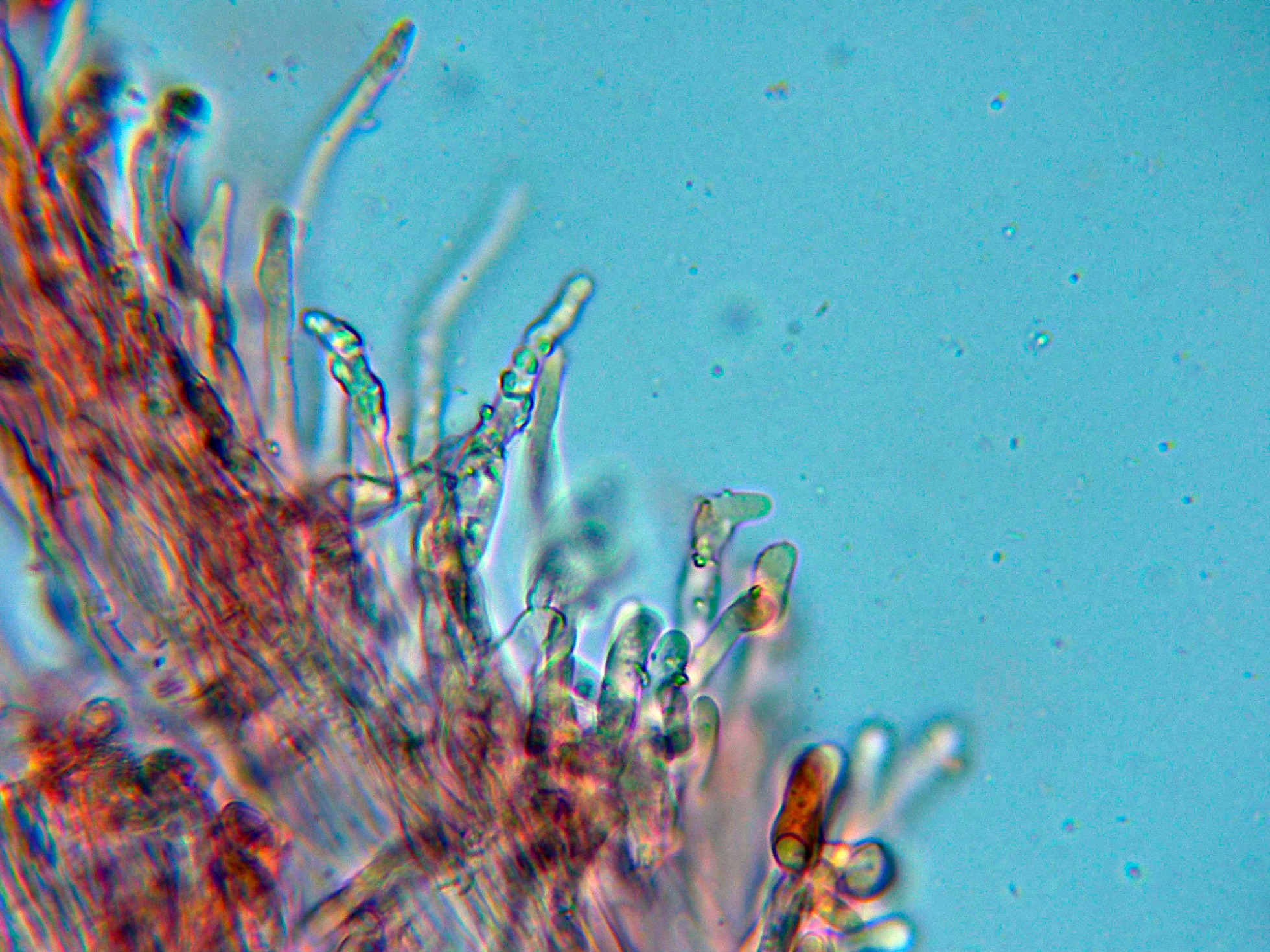 Himenio con dos tipos de cistidios, unos entre capitados y subcapitados, más visibles en reactivo de Melzer y otros entre subulados y aculeados que sobresalen muy por encima del himenio: