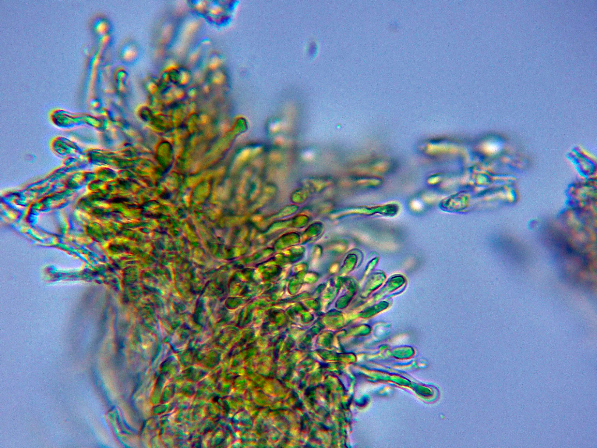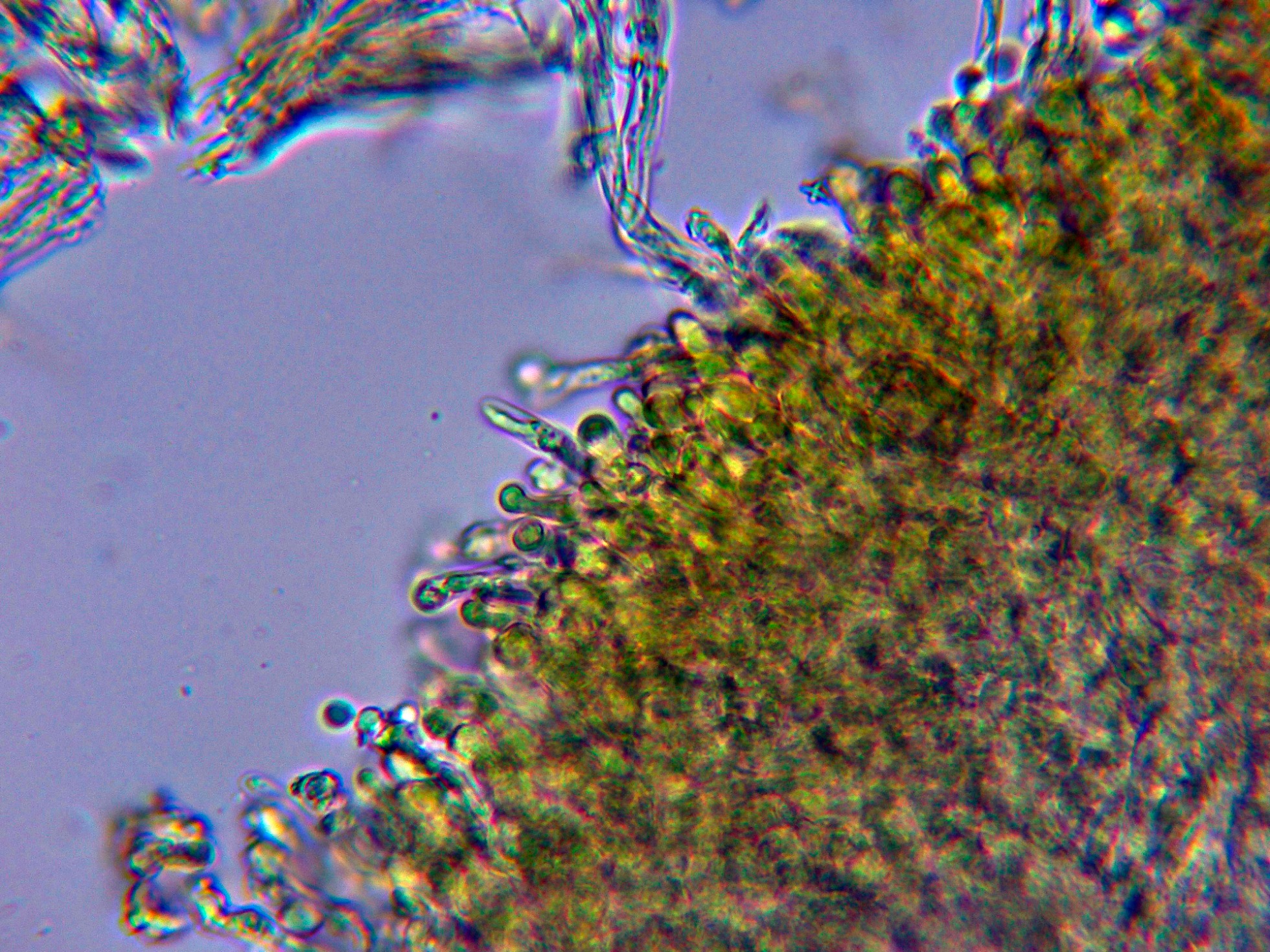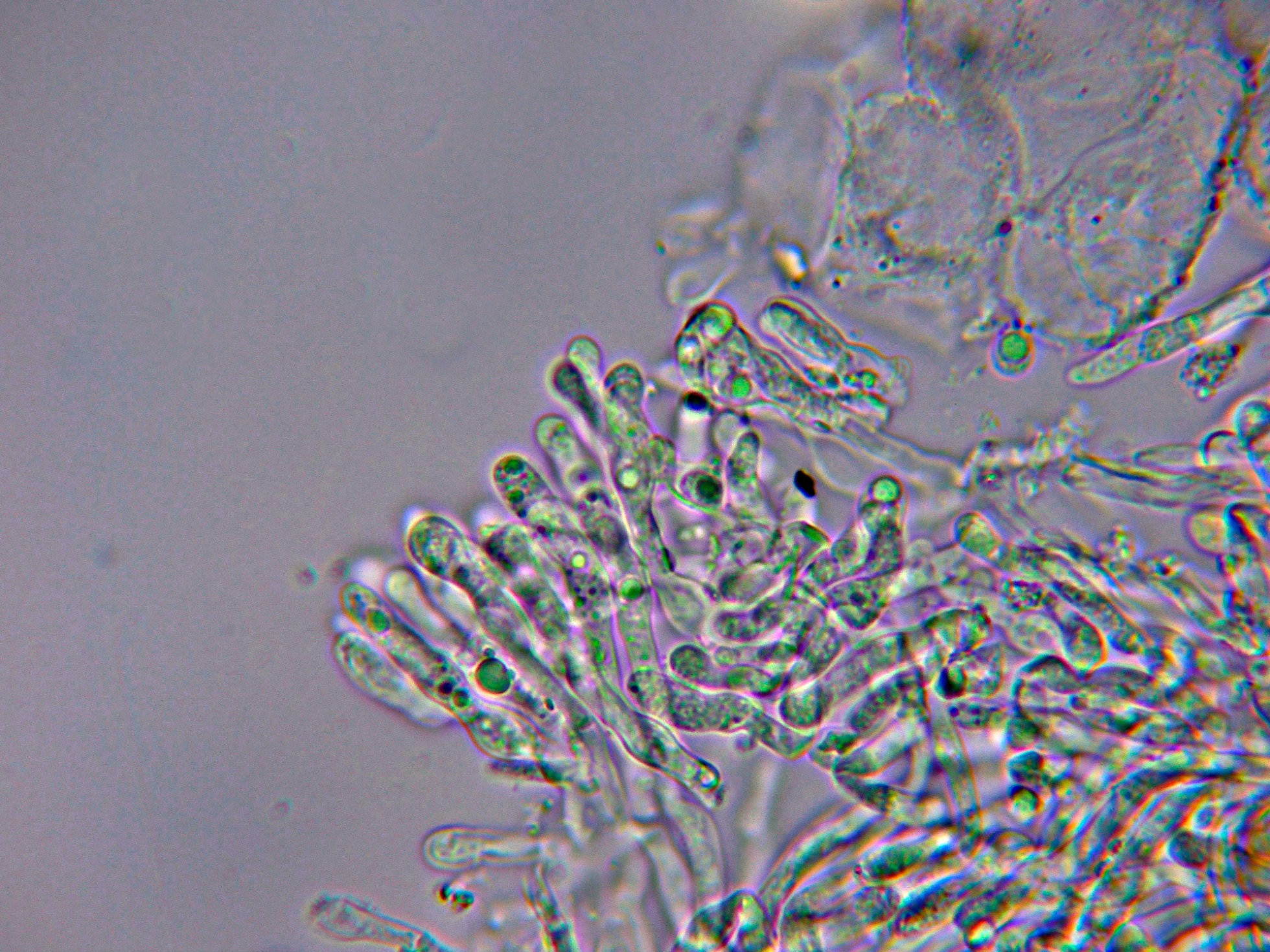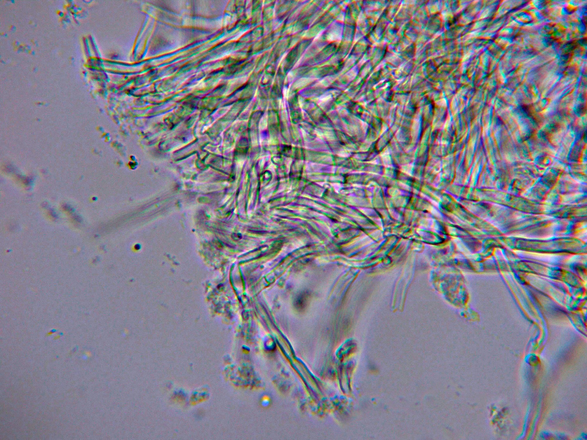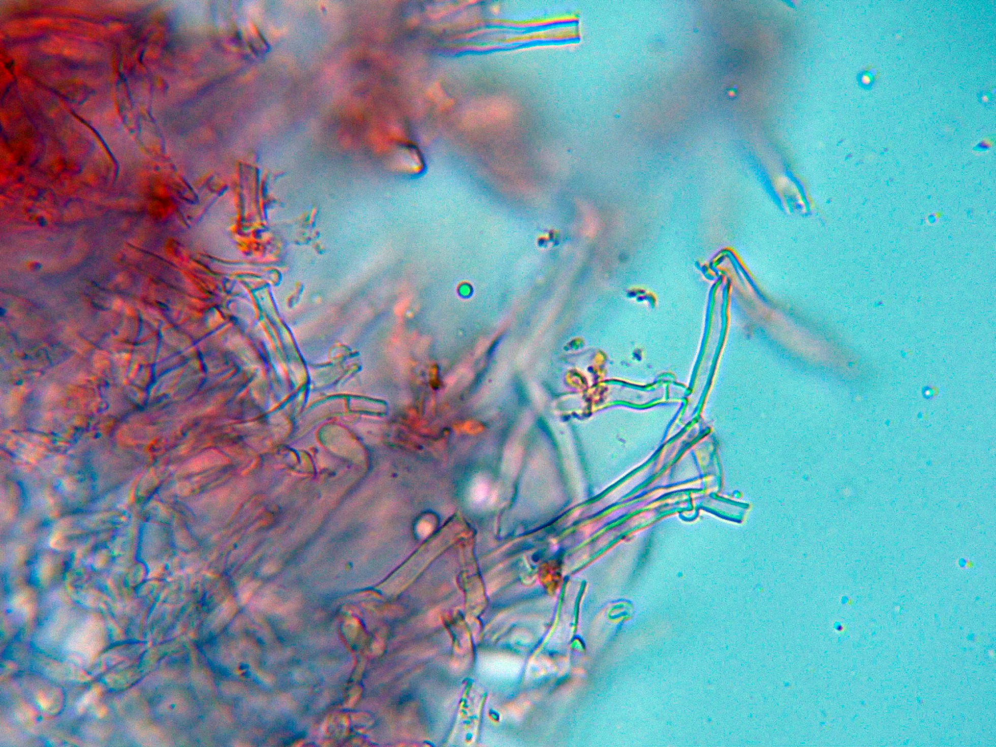 Himenio con dos tipos de cistidios, unos entre capitados y subcapitados, más visibles en reactivo de Melzer y otros entre subulados y aculeados que sobresalen muy por encima del himenio: