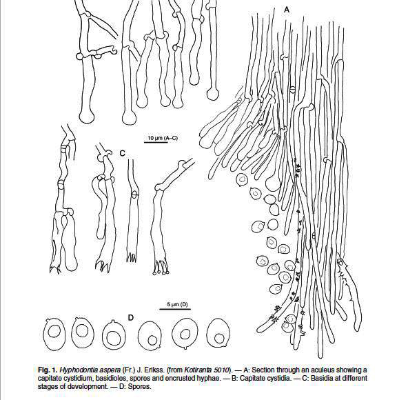 - Xylodon asper (Fr.) Hjortstam & Ryvarden. Microscopía