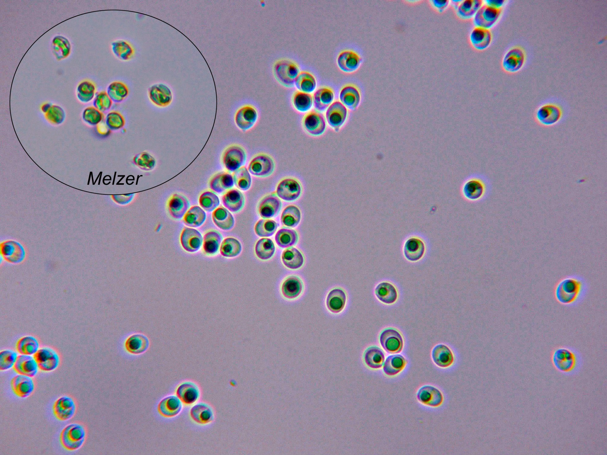 Esporas entre subglobosas y ovoides, de pared fina, con una apícula lateral y una gran gota lípida en su interior, inamiloides al Melzer.
