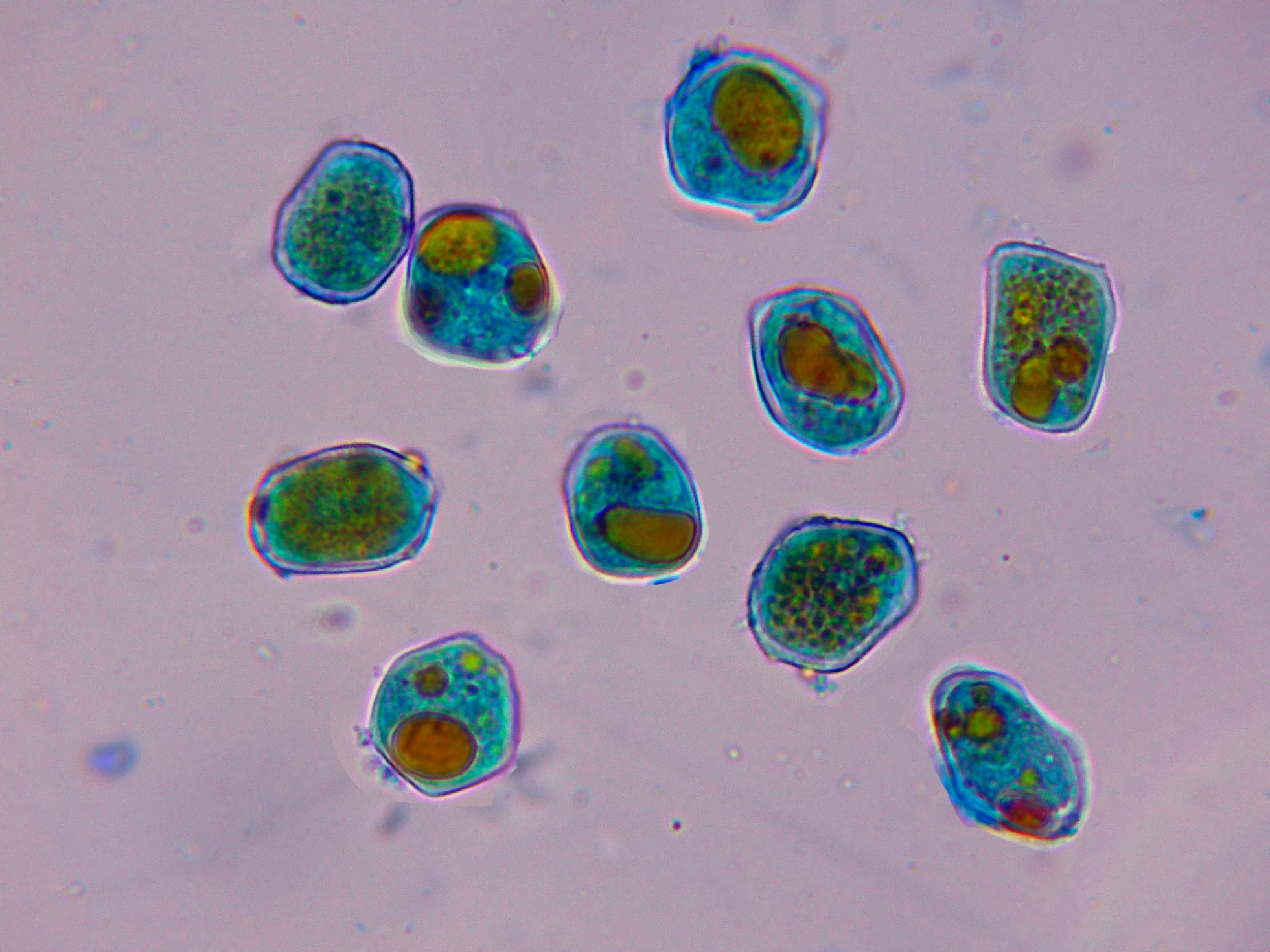 Las eciosporas ya más desarrolladas y en Azul de Cresilo con unas medidas de (17) 17.7 - 20.5 (22.5) × (13.3) 13.5 - 15.8 (18.2) µm.