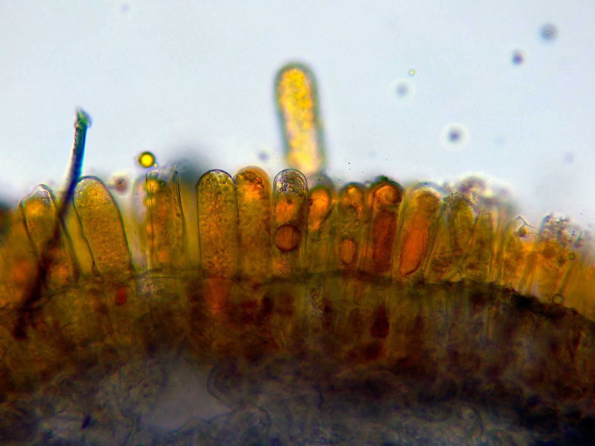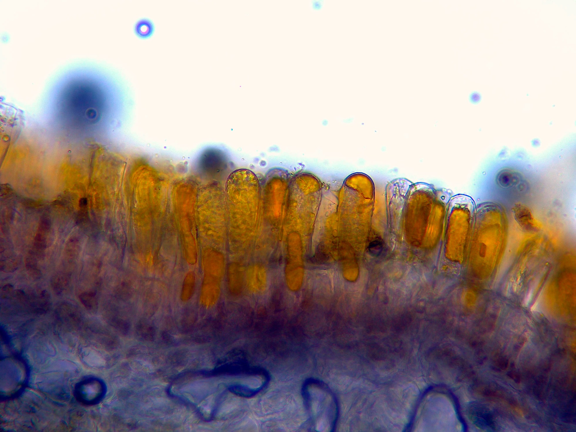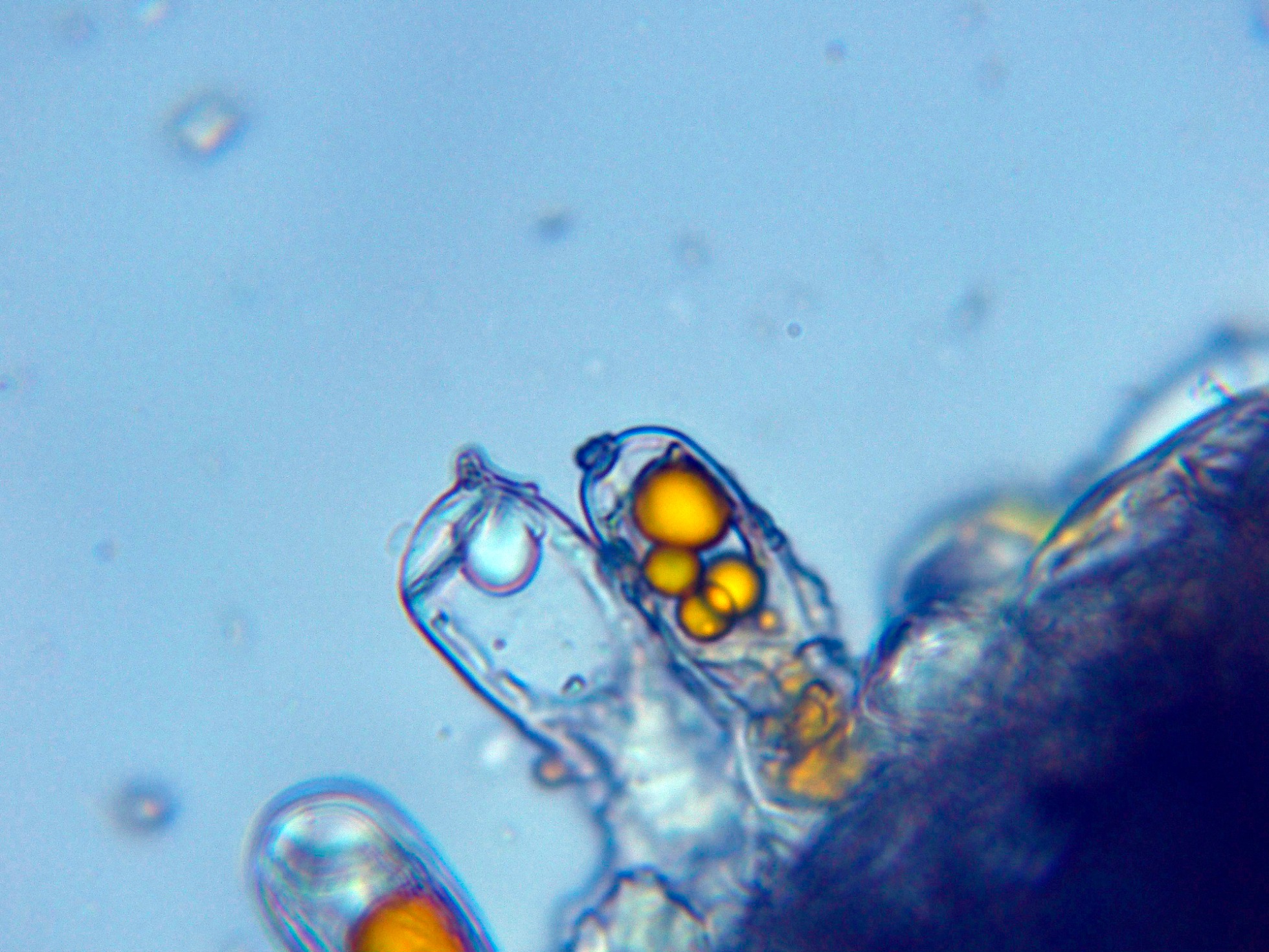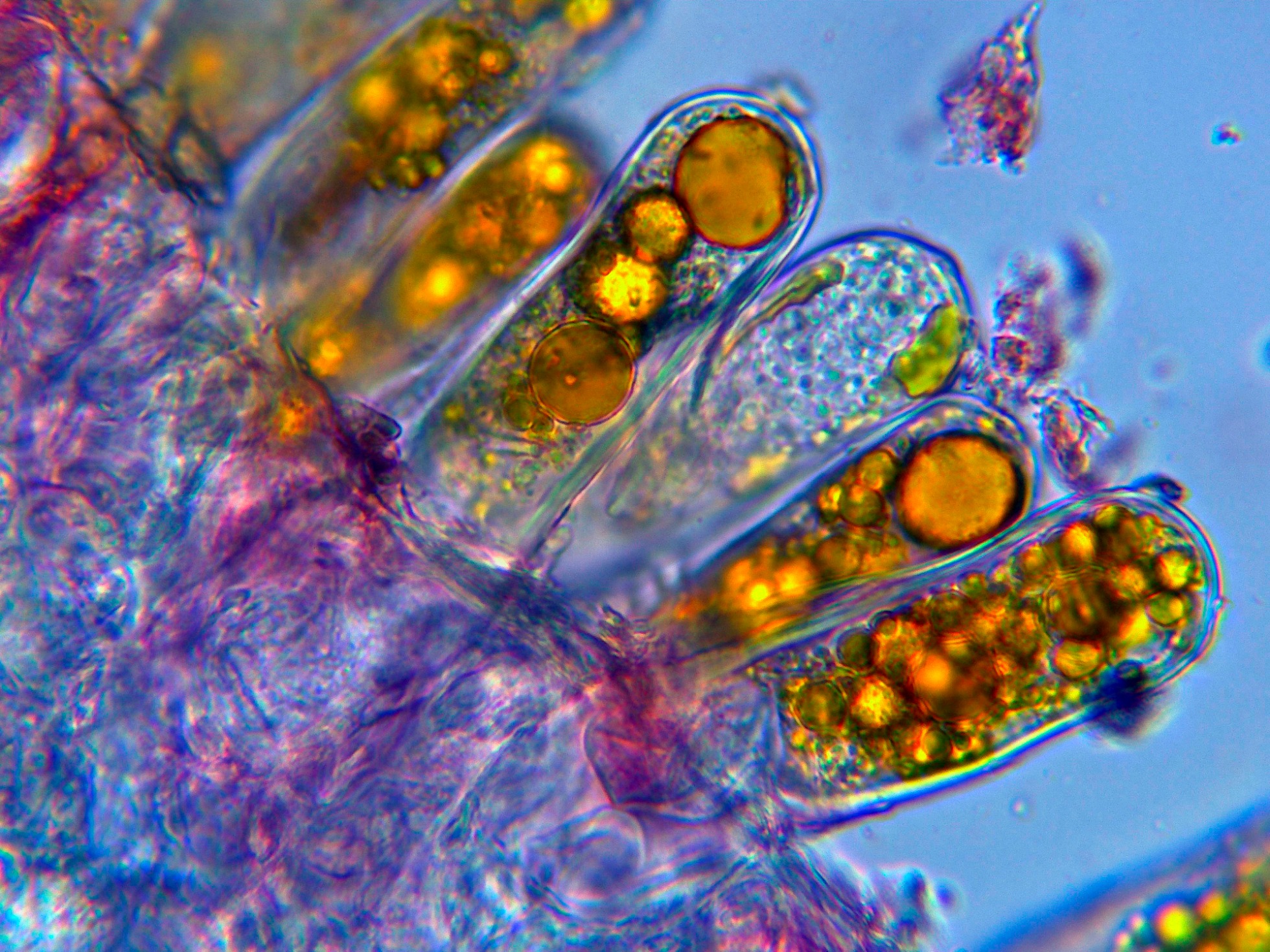 Ascos dispuestos verticalmente con muy numerosas gotas oleaginosas de color dorado que le confieren su color característico.