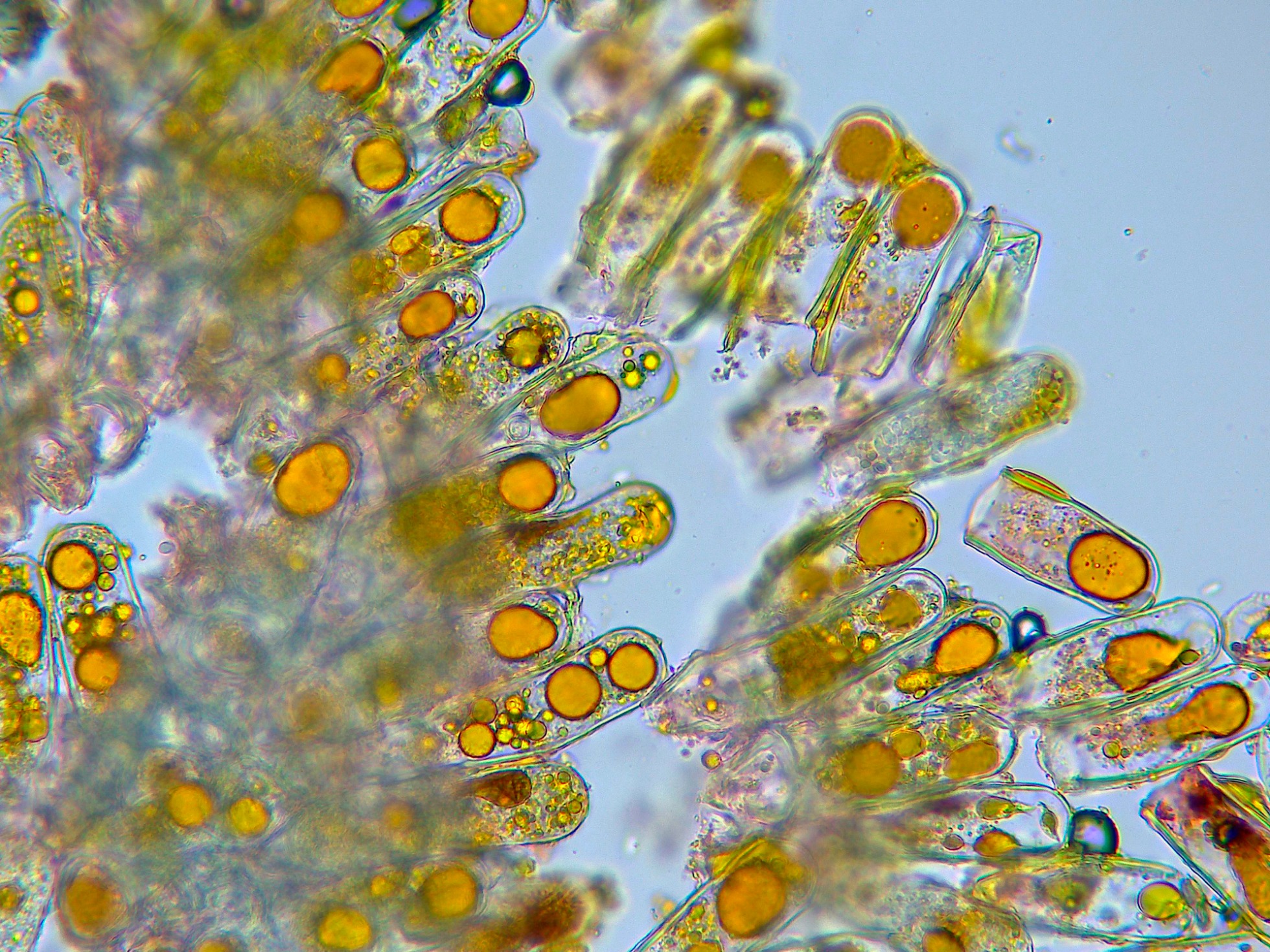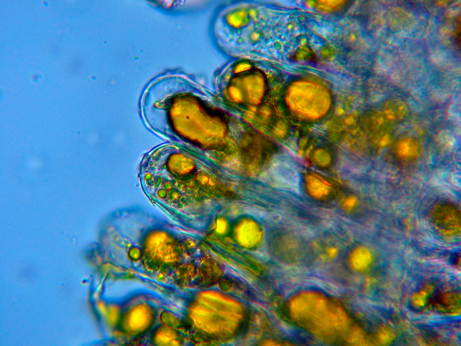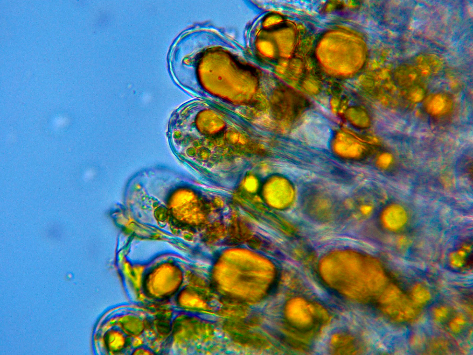 Ascos dispuestos verticalmente con muy numerosas gotas oleaginosas de color dorado que le confieren su color característico.