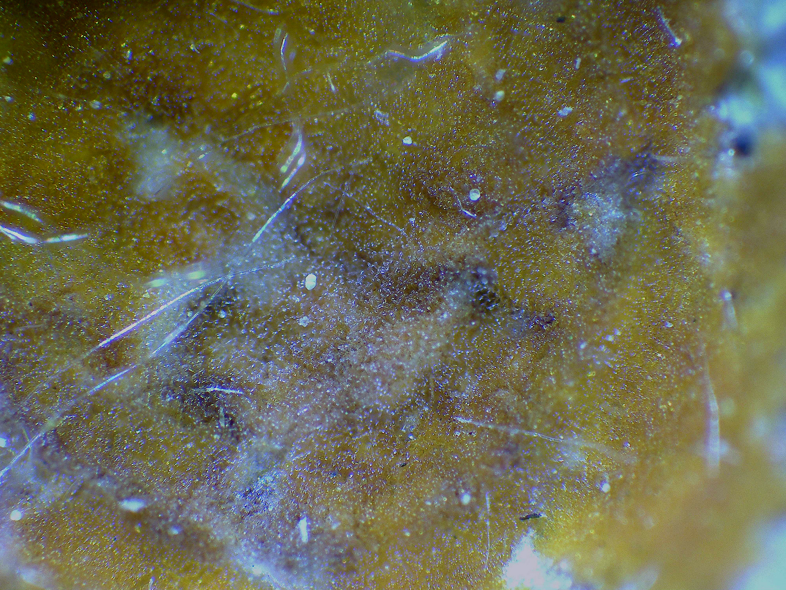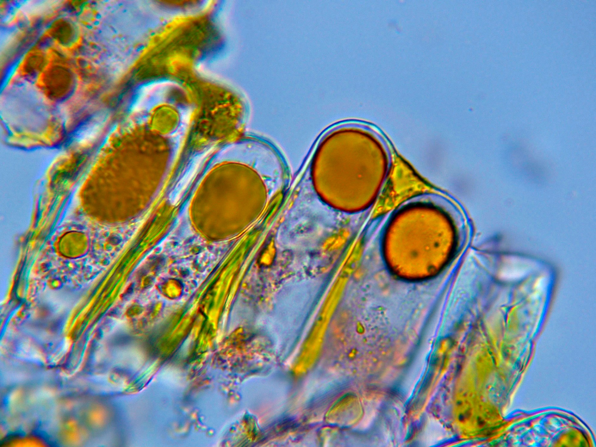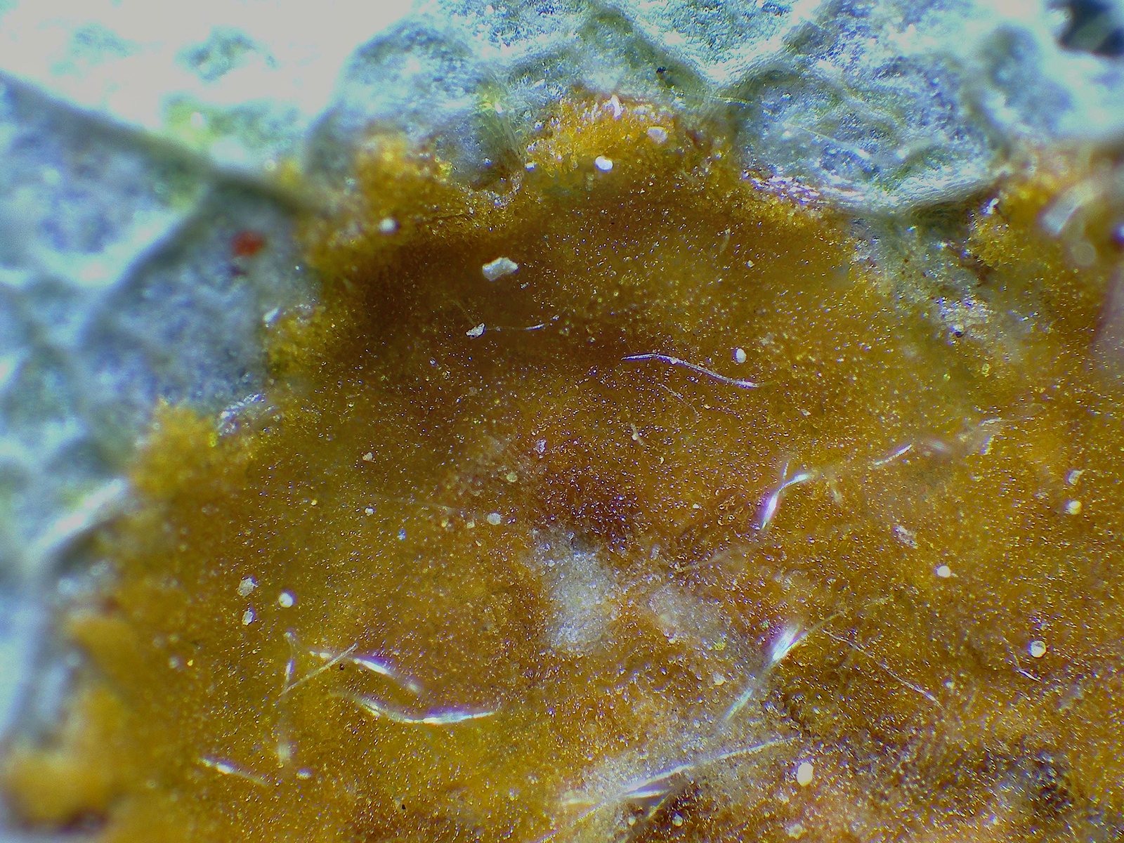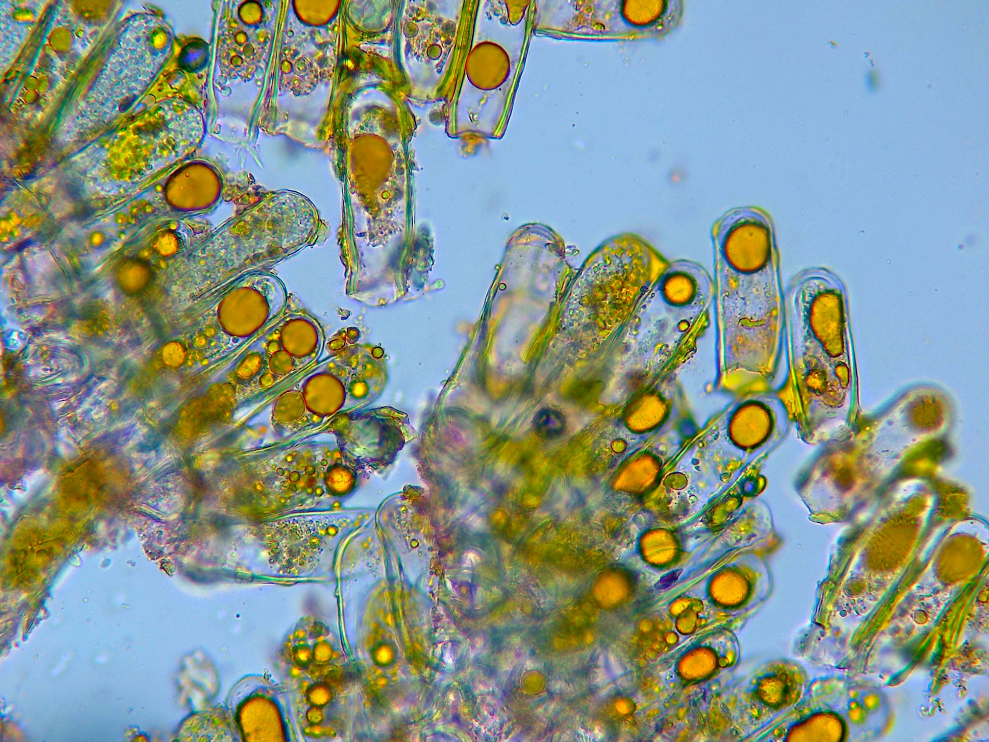Ascos dispuestos verticalmente con muy numerosas gotas oleaginosas de color dorado que le confieren su color característico.