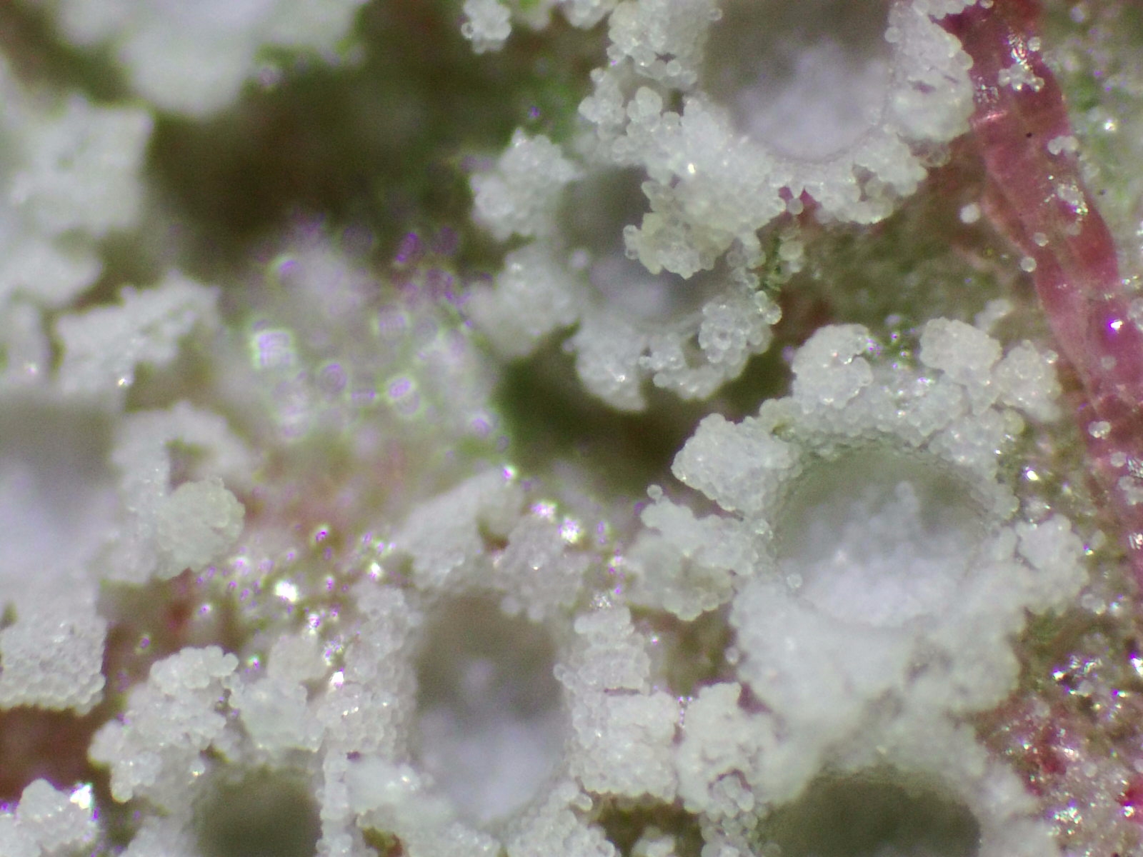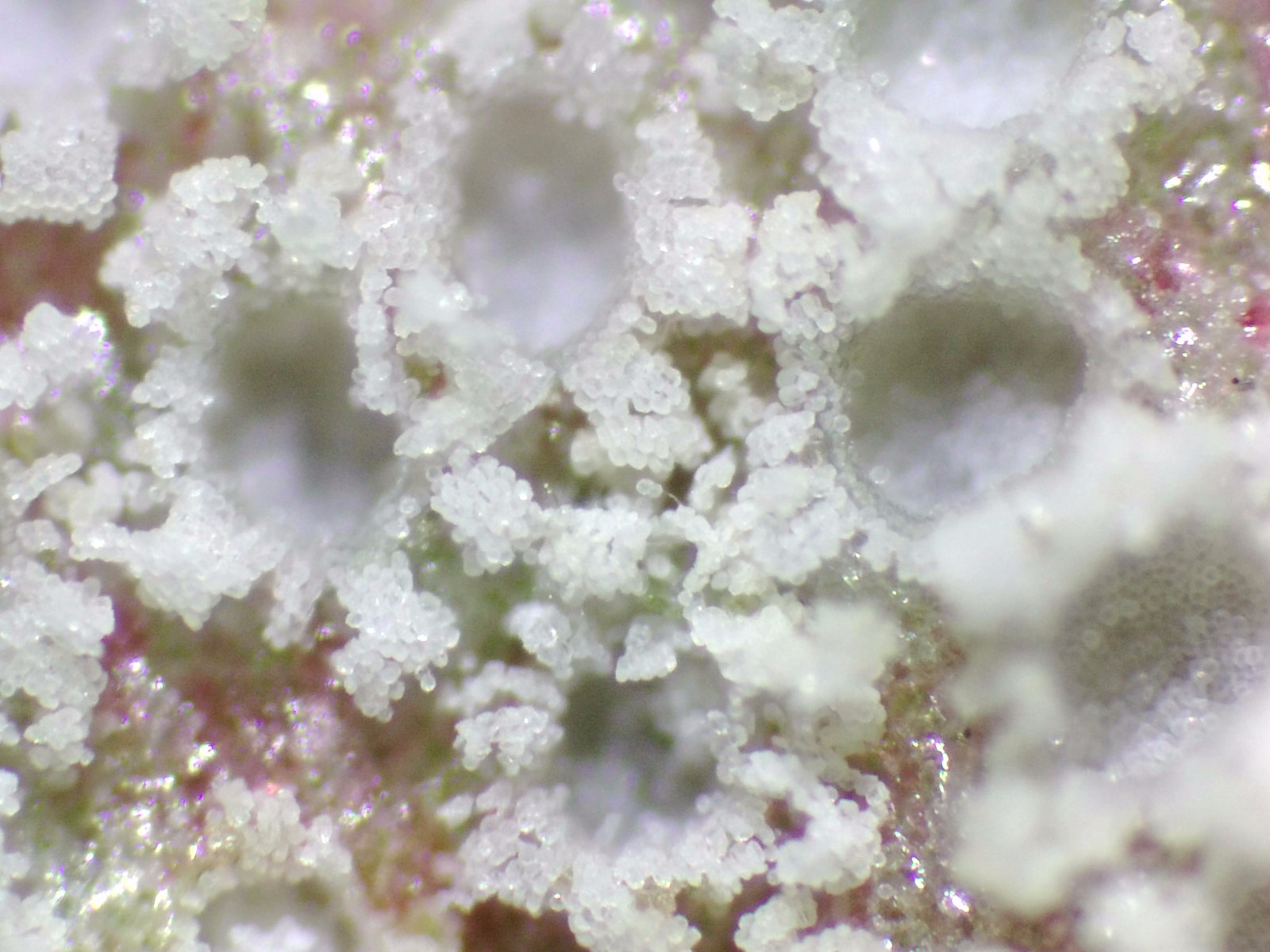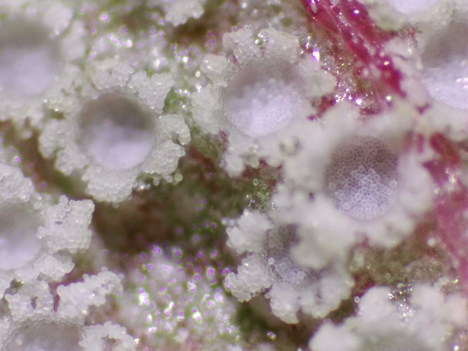 Como se puede apreciar en las fotos, en la base donde han crecido estos hongos han tomado un color púrpura/rojizo y lo mas curioso es el color blanco puro de cada una de estas "coronitas" que se diferencia con relativa rapidez de las demás que siuelen tener tonos amarillentos/anaranjados.