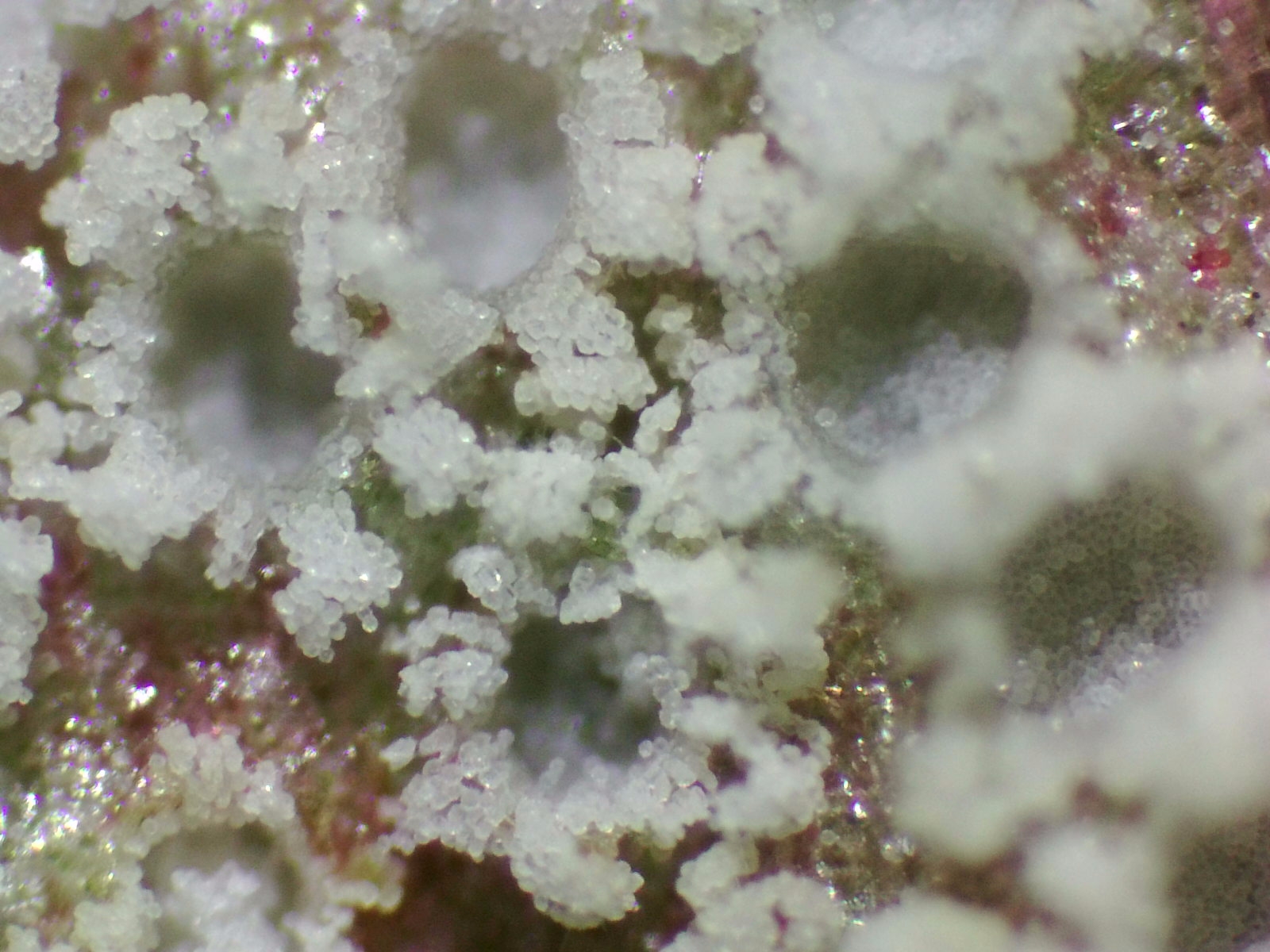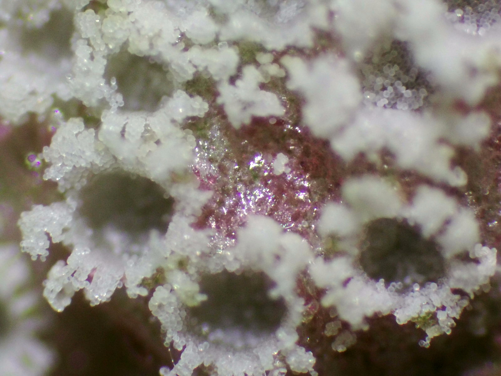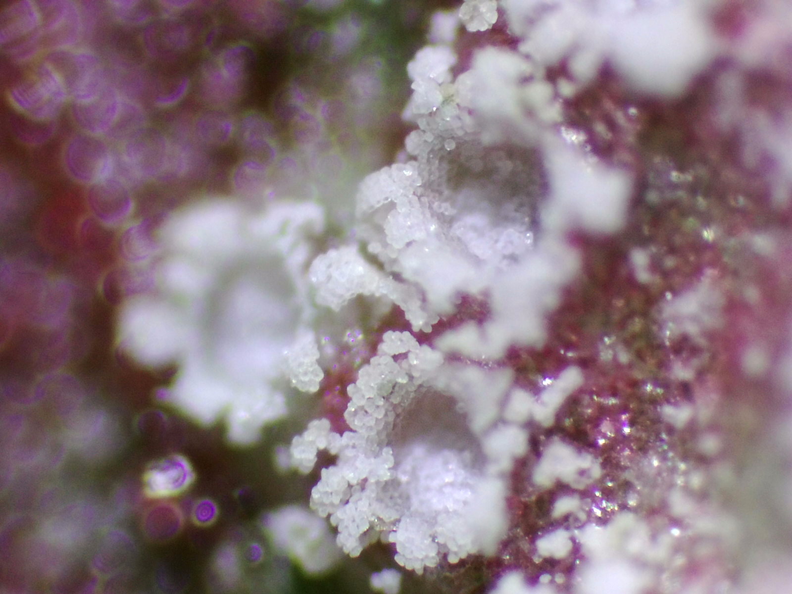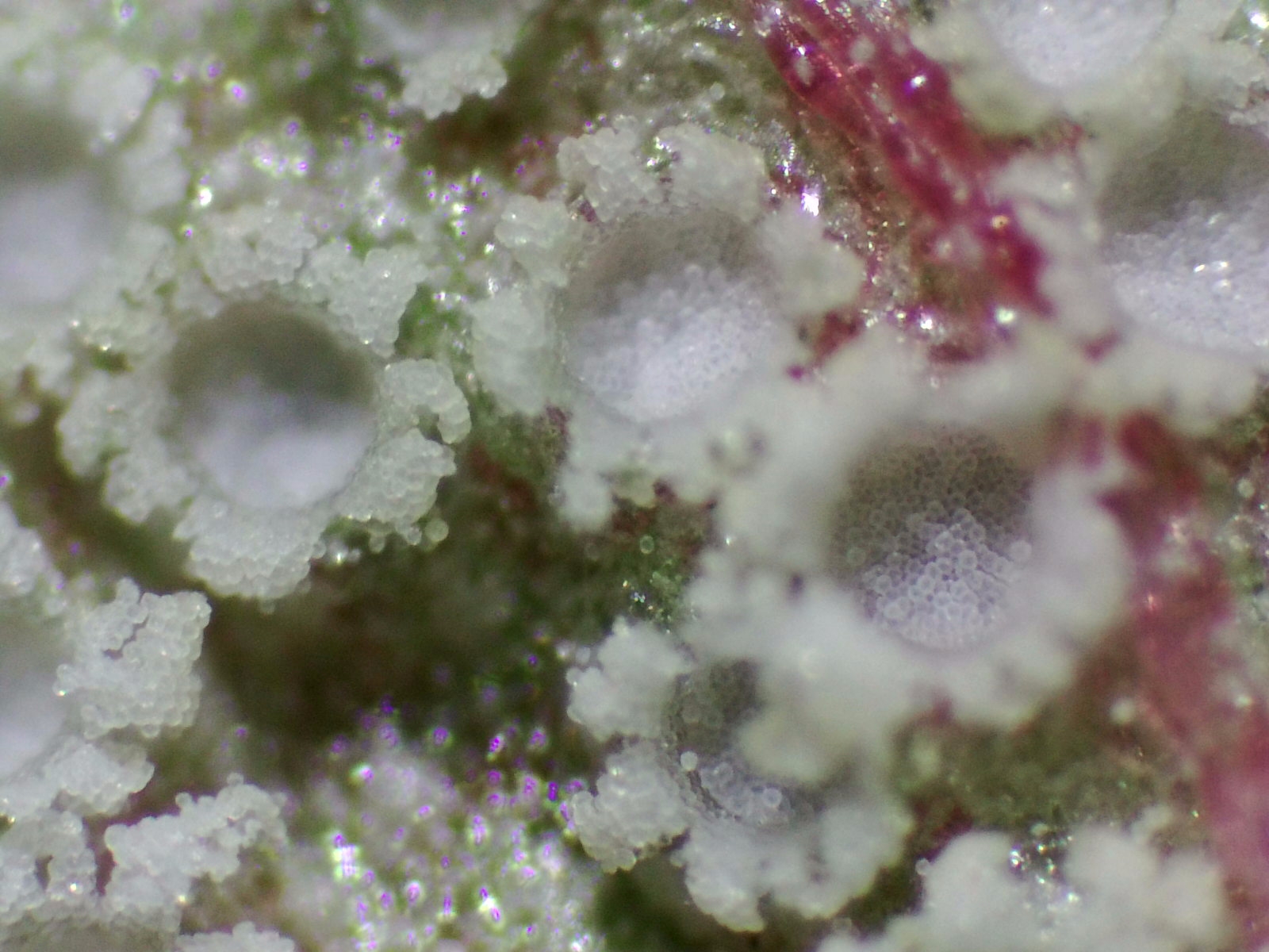 Como se puede apreciar en las fotos, en la base donde han crecido estos hongos han tomado un color púrpura/rojizo y lo mas curioso es el color blanco puro de cada una de estas "coronitas" que se diferencia con relativa rapidez de las demás que siuelen tener tonos amarillentos/anaranjados.