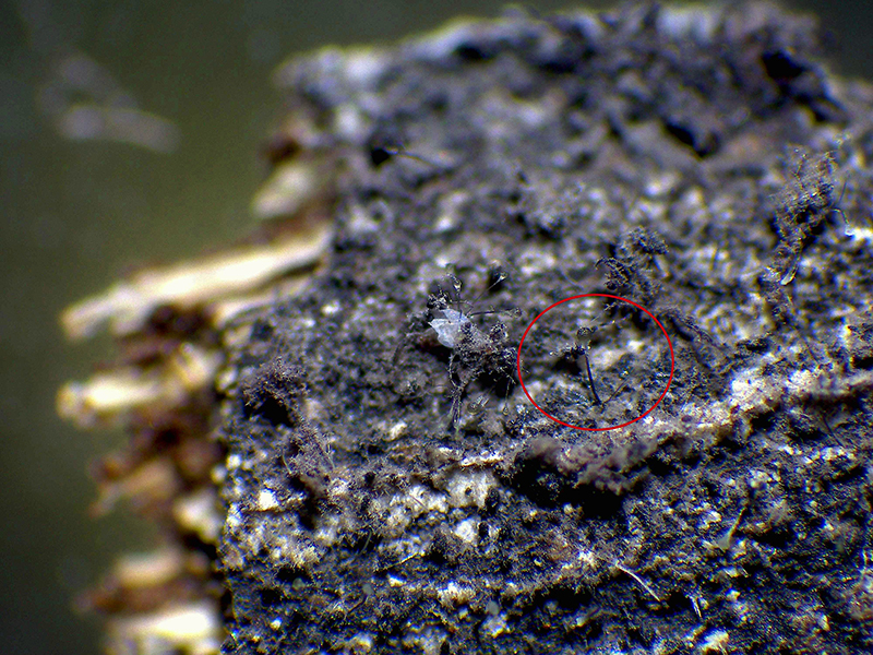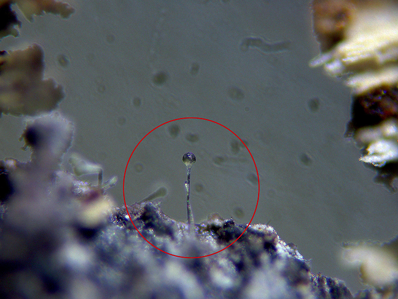 Observaciones: Después de consultar el tema con los expertos, confirmaron mis primeras sospechas de que efectivamente lo más probable es que se tratara de Graphium sp., estos se podrían separar de un posible y bastante parecido Pesotum sp., por las células conidiógenas ya que las especies de Graphium proliferan de forma anelídica y las de Pesotum lo hacen de forma simpodial, este detalle es muy difícil de apreciar con un microscopio óptico, con lo que ante la mínima duda lo mas sensato me parece el dejarlo abierto a estudios en el futuro como Graphium cf.