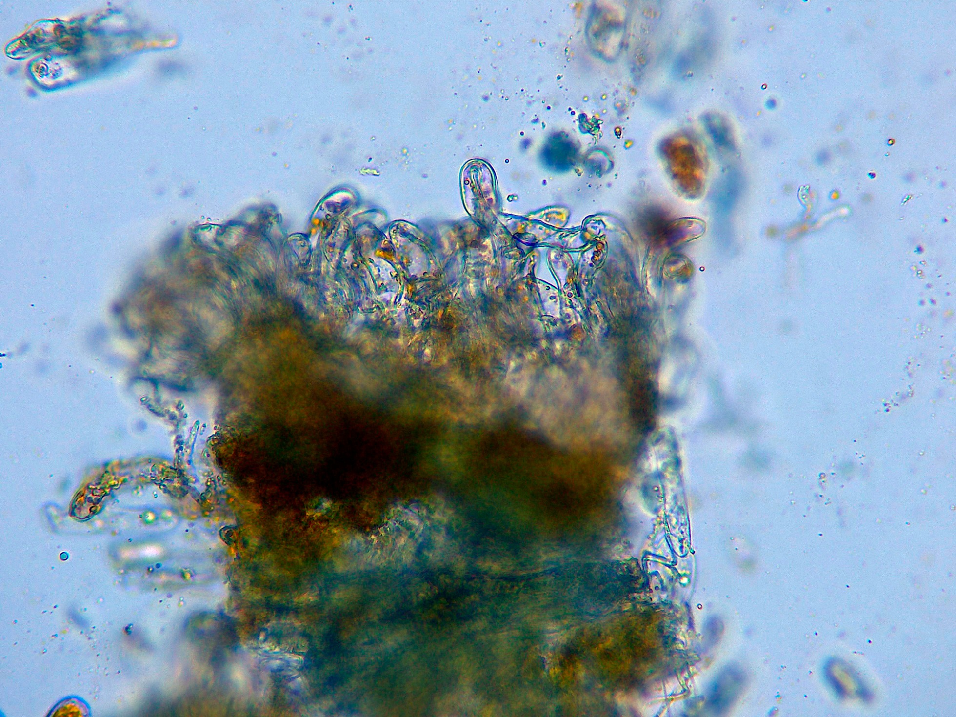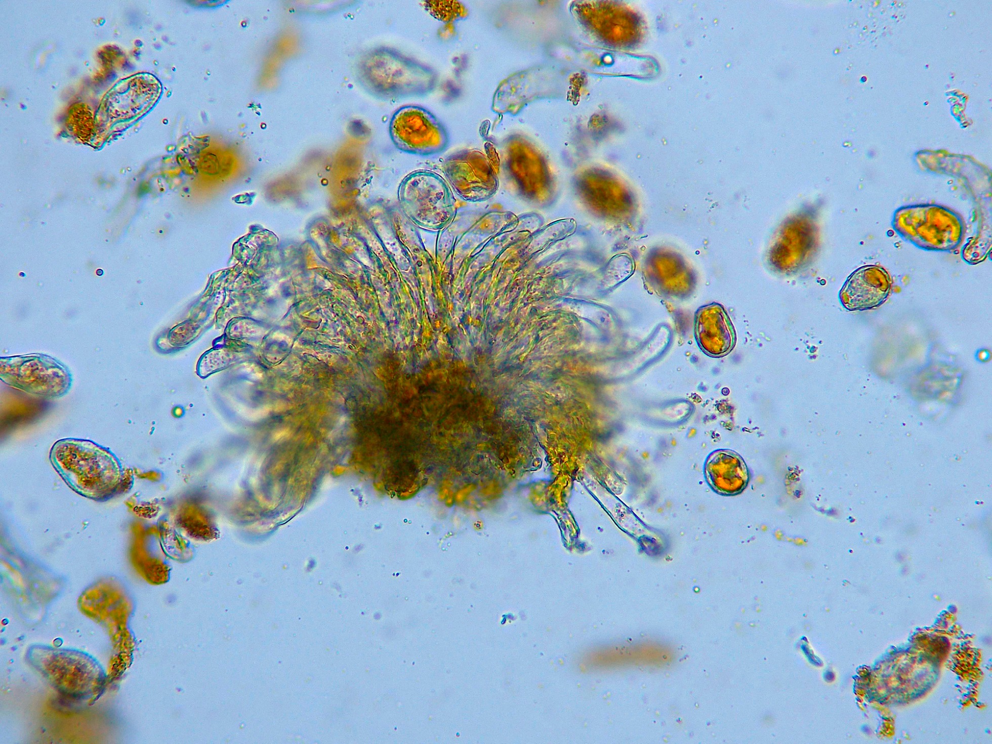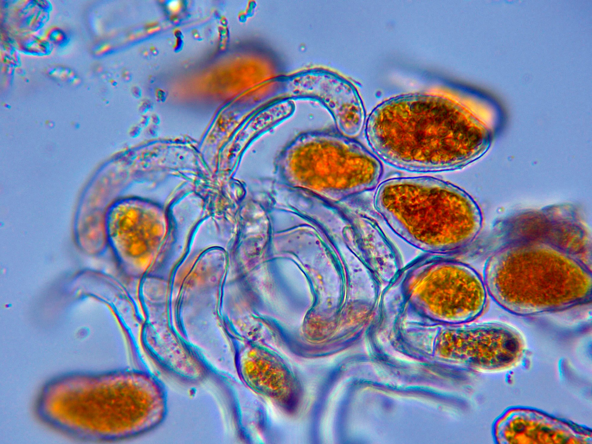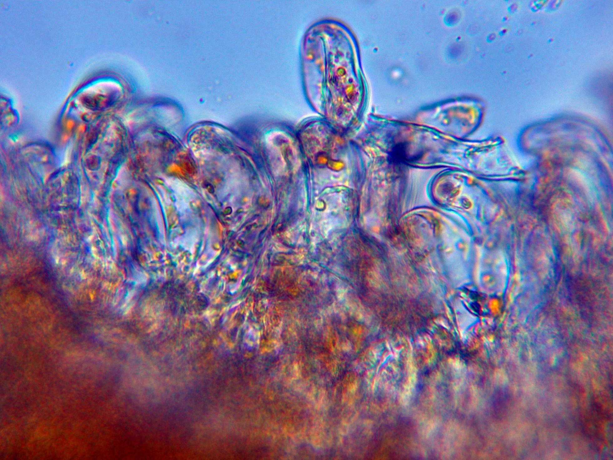 Paráfisis cilíndricas, solo algunas muy ligeramente ensanchadas en el ápice y con contenido de pequeñas gotas lípidas muy pigmentadas en su interior.