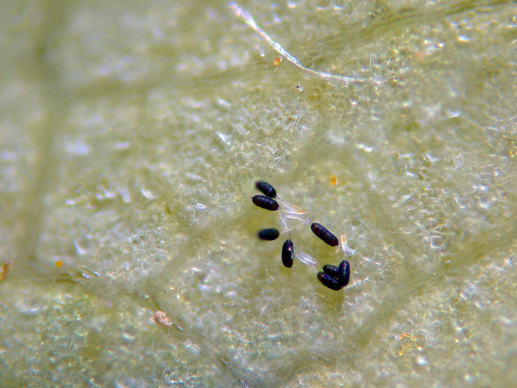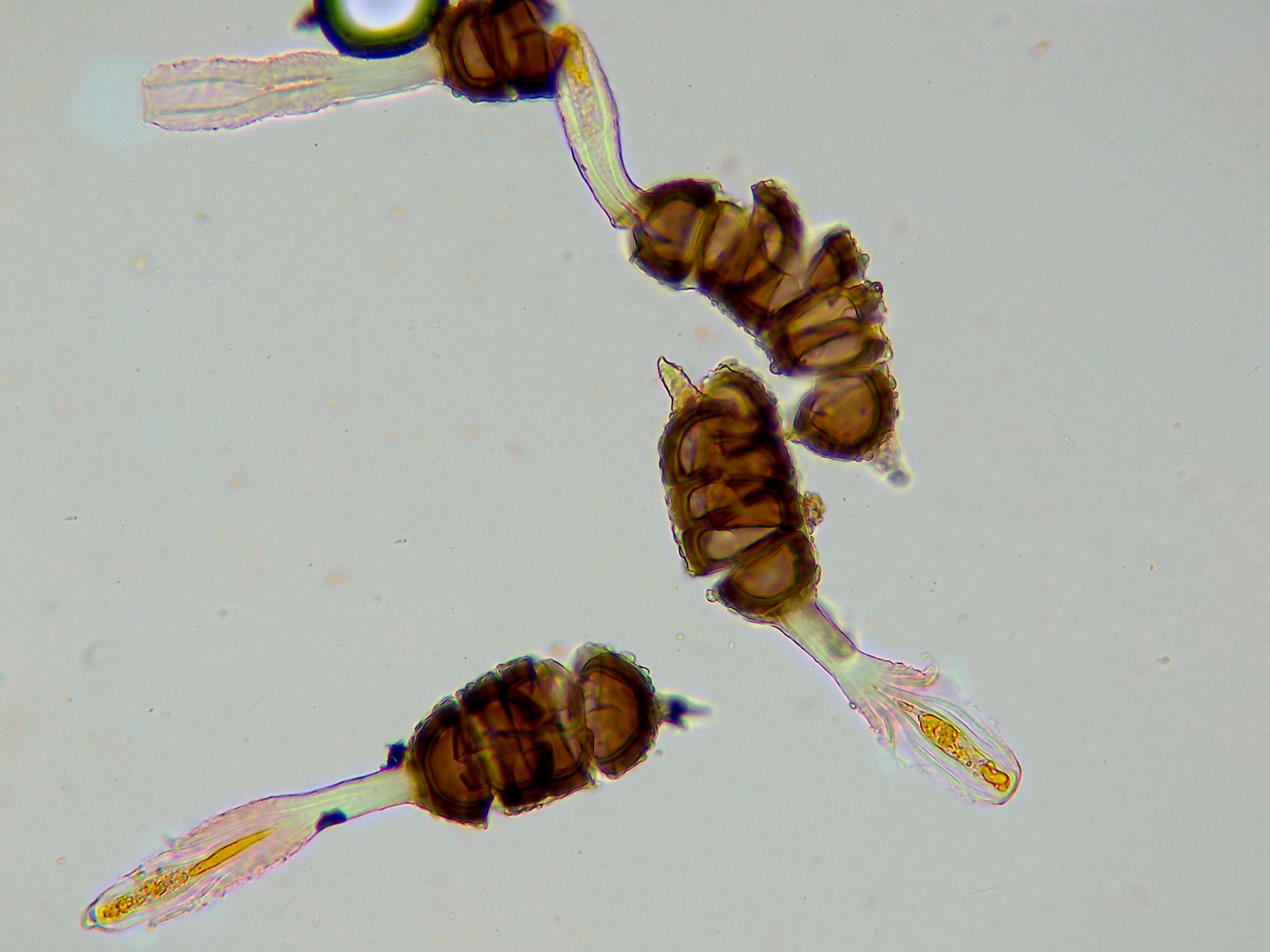 Al aplicar presión sobre el cubre las teliosporas tienden a resquebrajarse, aunque en estas condiciones se puede apreciar mucho mejor tanto el pedicelo como la papila apical, datos muy importantes a nivel taxonómico.