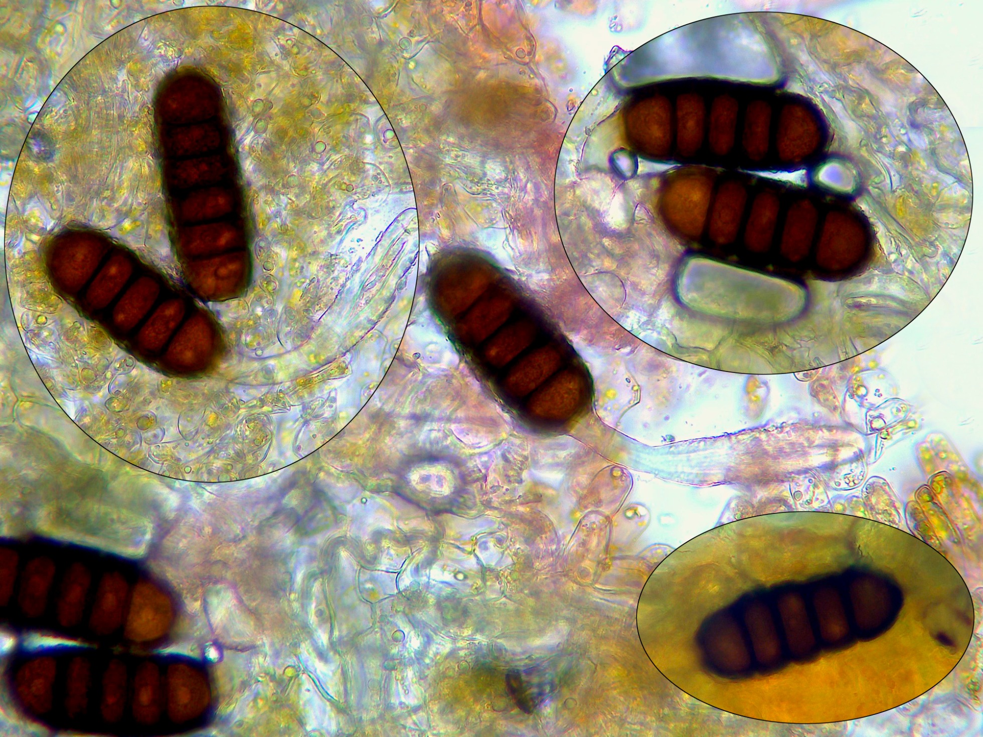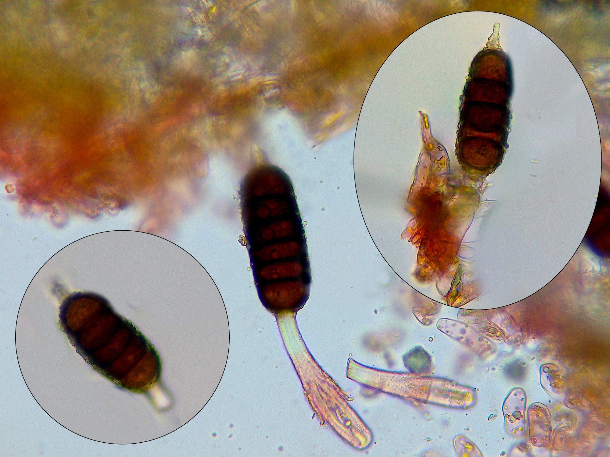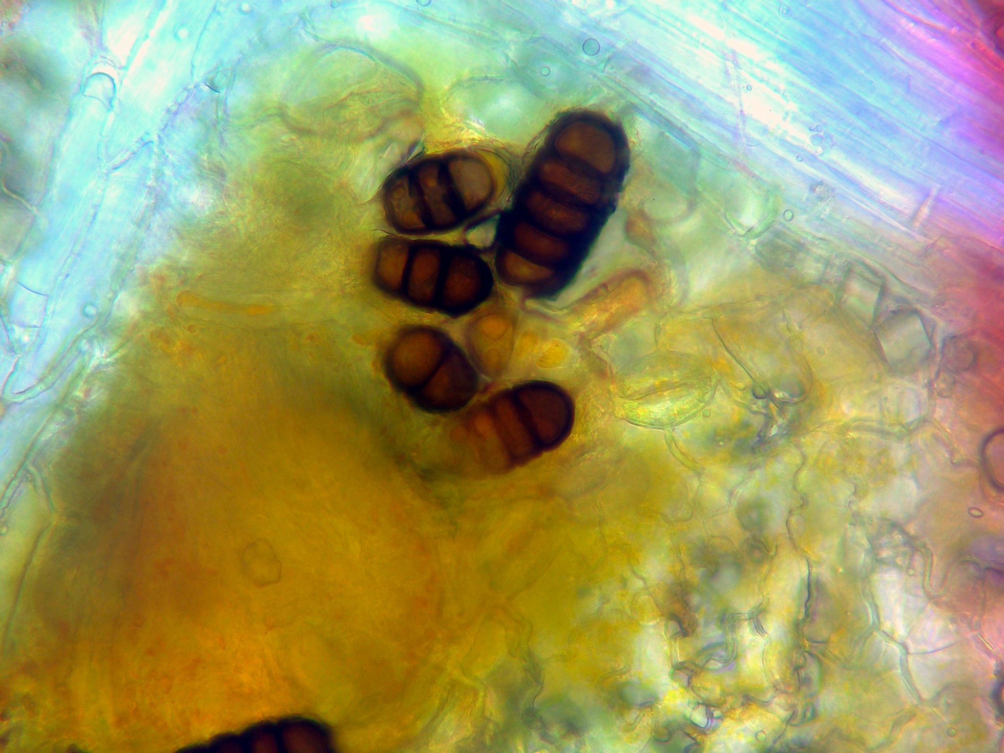 Estas teliosporas con 3 a 5 septos sin constreñimiento en los mismos, y unas medidas descontando el pedicelo y la papila apical de (71) 72.6 - 85.6 (91.1) × (26) 28.1 - 34.1 (37.8) µm.