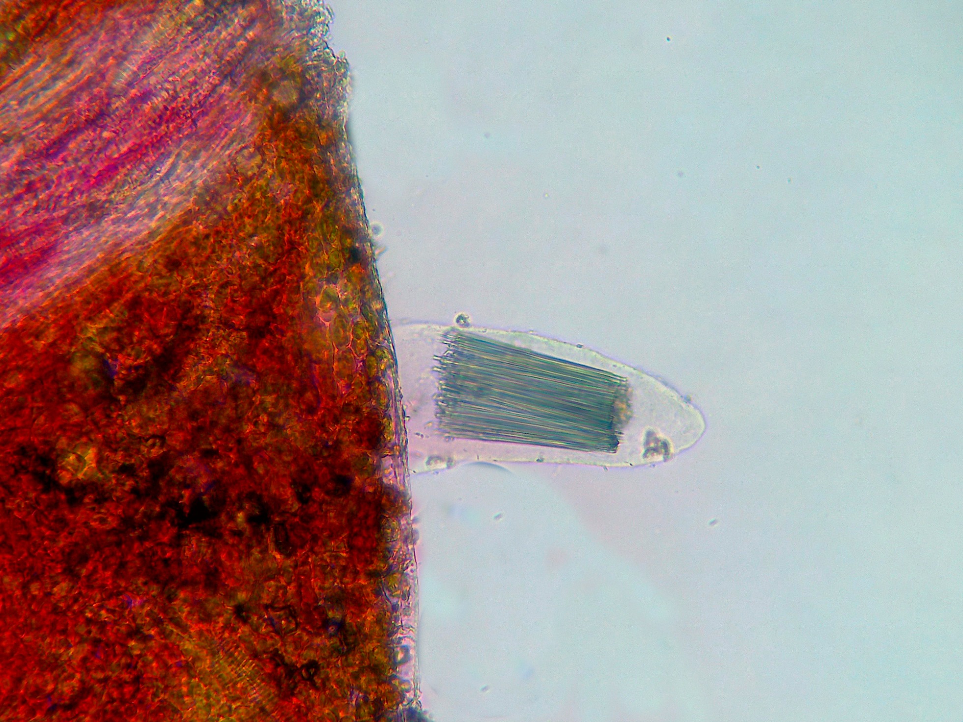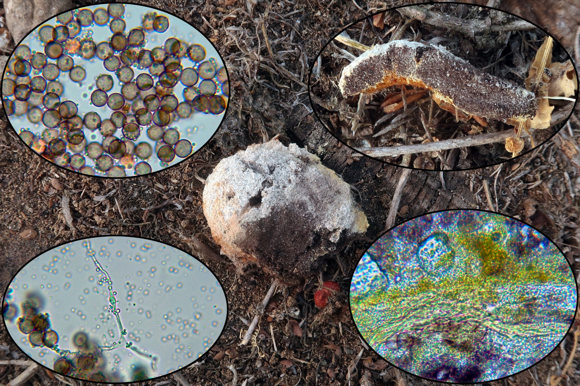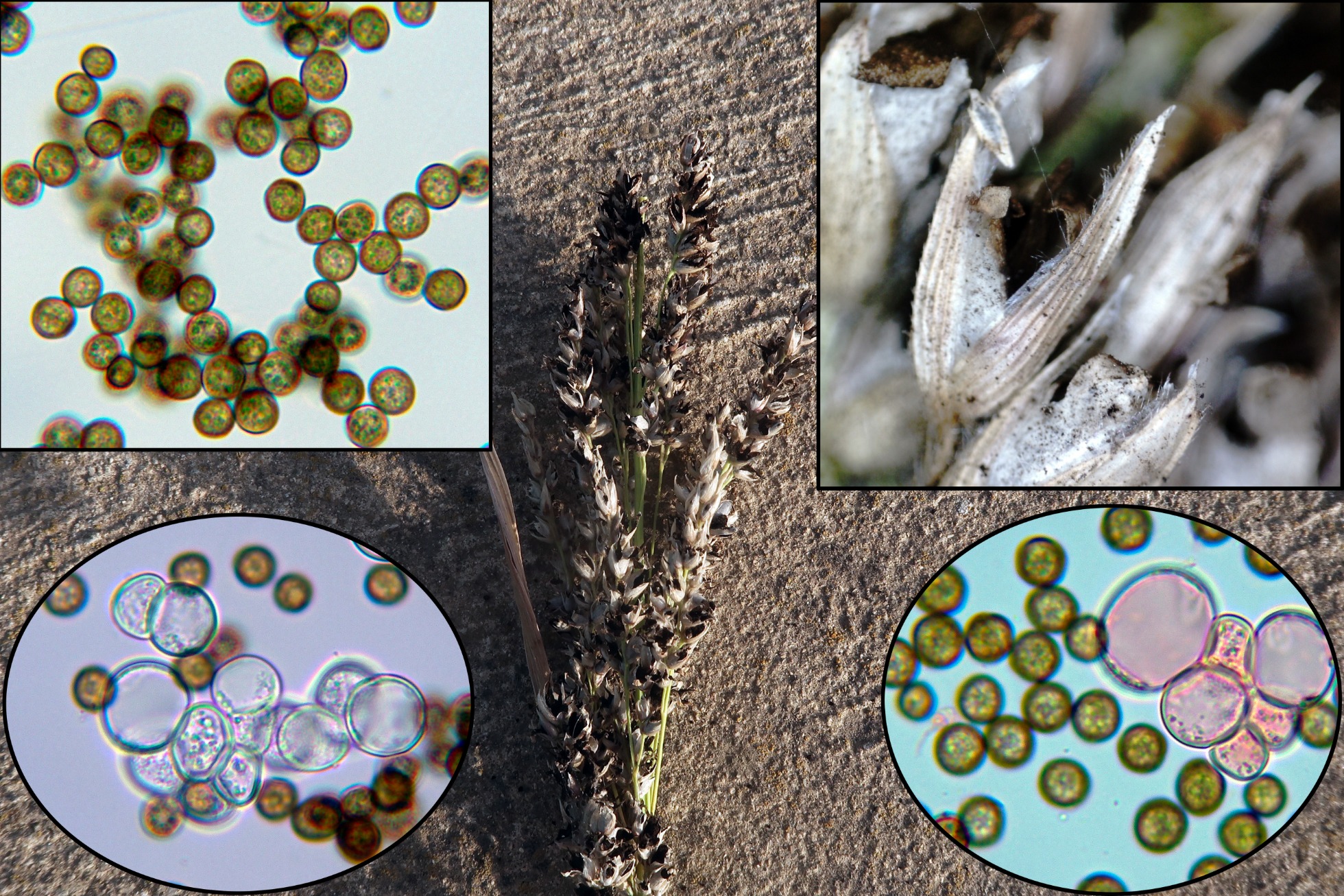 Parasitando por completo una espiga de Sorghum halepense, una Ustilaginaceae, con una membrana frágil y evanescente, el Sporisorium cruentum.