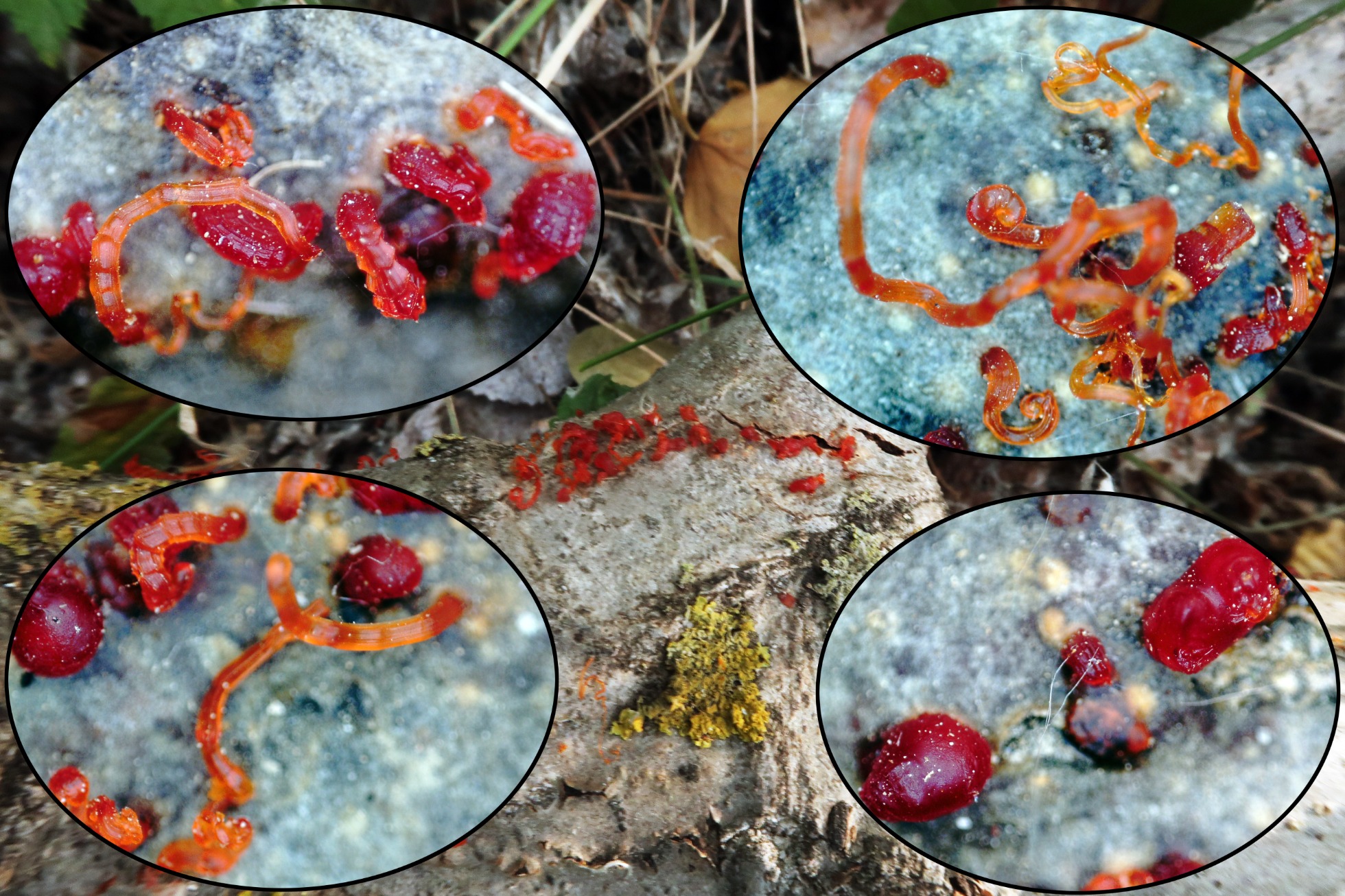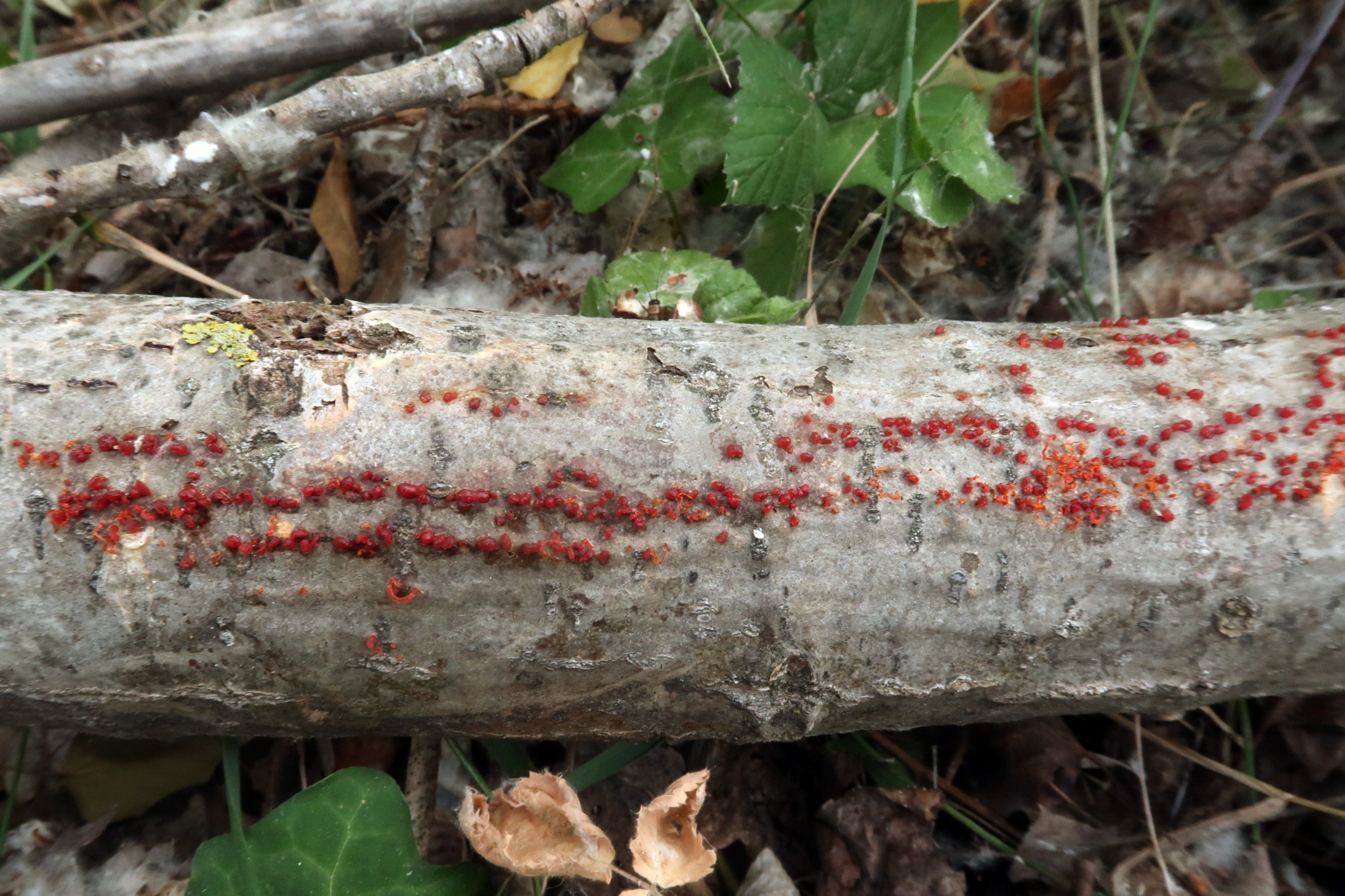 De forma abundante aunque solo sobre un tronco tumbado, la vistosa Cytospora chrysosperma.