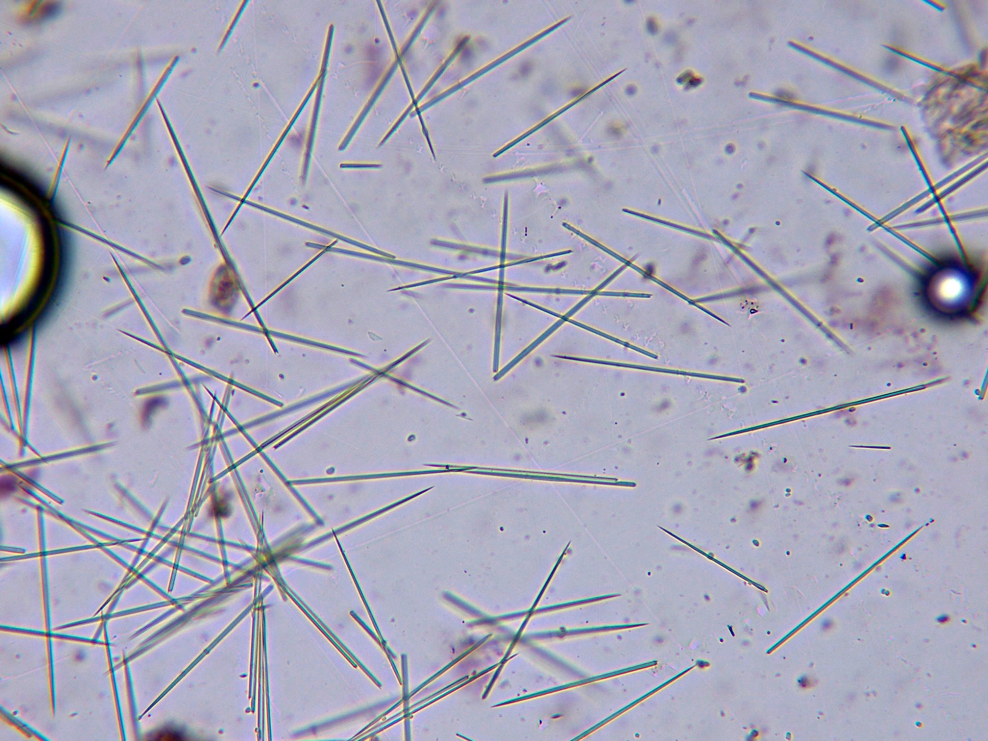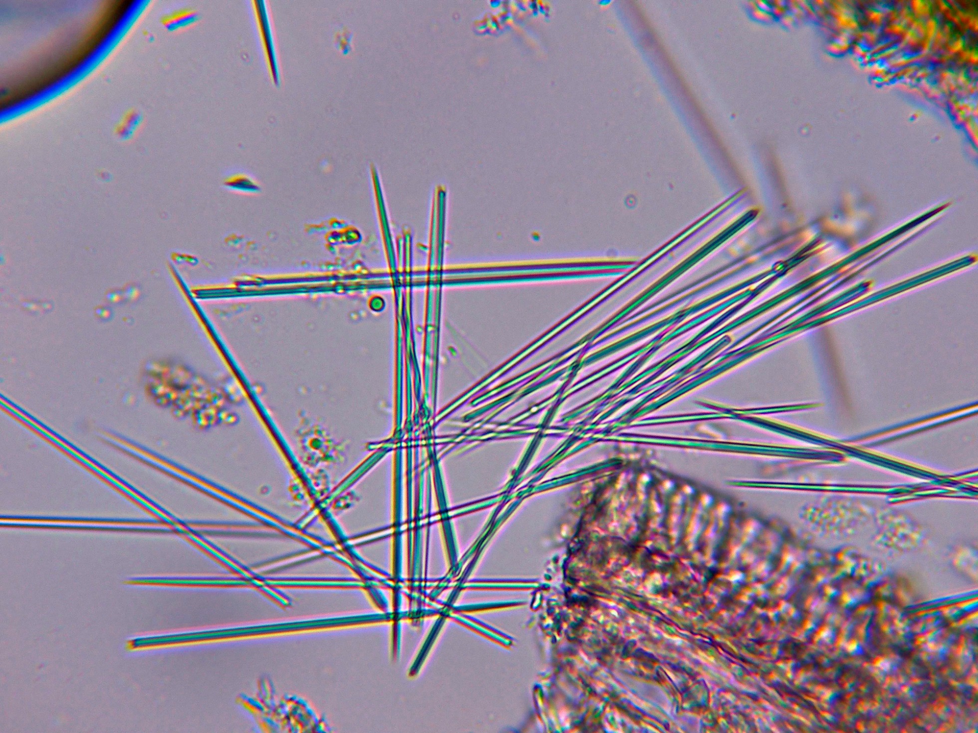 Curiosamente en las muestras aparecieron unos cristales de manera muy abundante, estos cristales procedían de unas bolsas que se corresponderían a células vegetales, dejo una imágen: