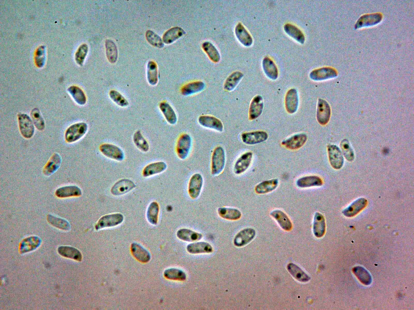 Observaciones: El el trabajo de Ryvarden tanto la Antrodia hyalina como la Antrodia pulvinascens se citan sobre los mismos huéspedes (Populus y Sálix), las medidas esporales citadas por el mismo autor son de 5-9 x 2-3 μm, para la Antrodia hyalina y de 6-8 x 2.5-3.2 μm, para la Antrodia pulvinascens, las cortas medidas de las esporas en cuanto a longitud en el presente estudio. unido a una ligera mayor anchura de las mismas hacen que considere como opción más probable la de Antrodia pulvinascens o ya en todo caso una Antrodia muy cercana a esta última..