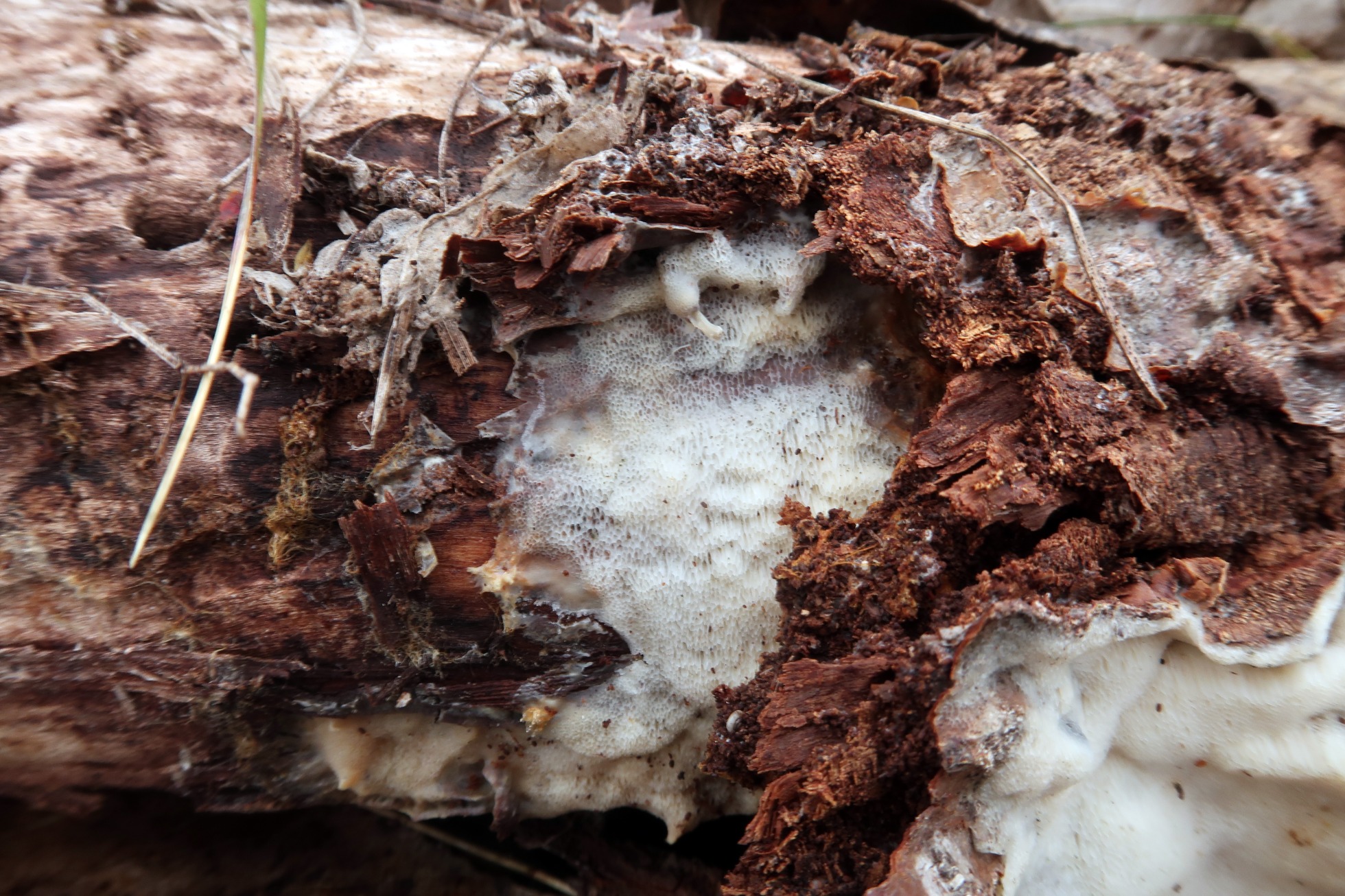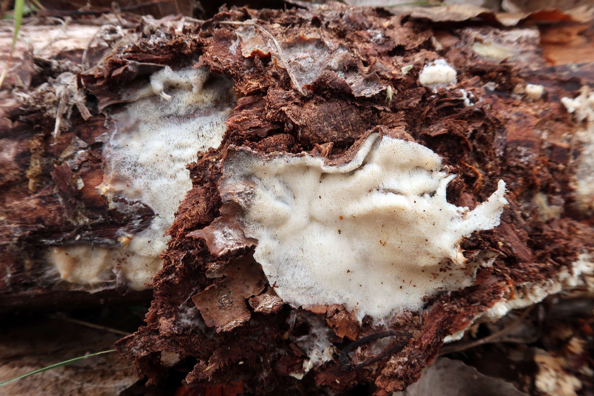 Un Corticial poroide fotografiado el 13 de Marzo en soto fluvial sobre un tronco tumbado en un punto donde predominaban los Populus y Alnus.