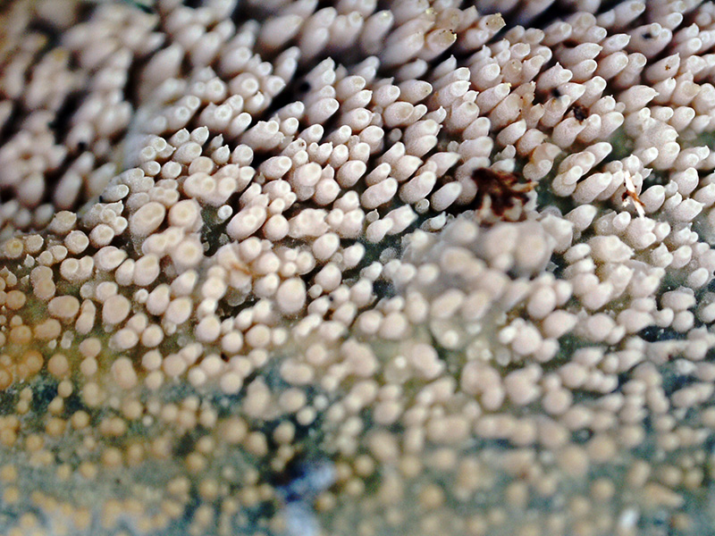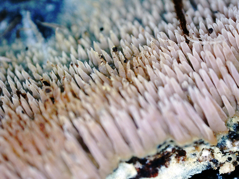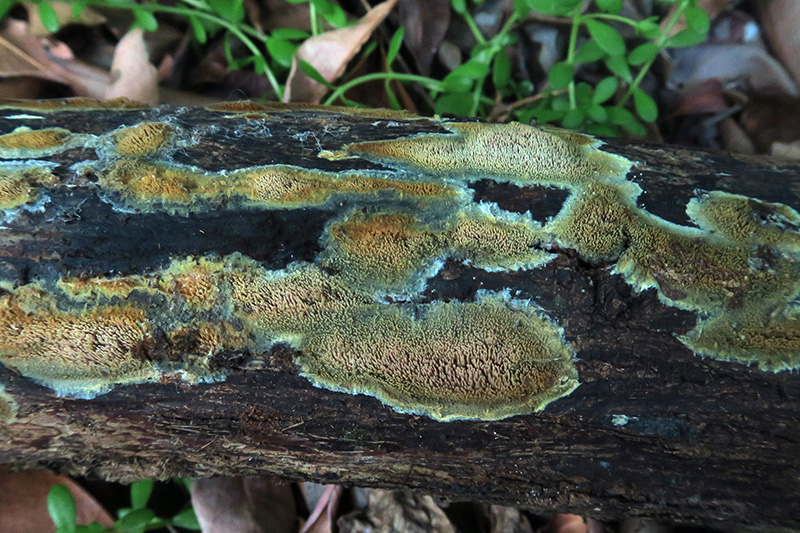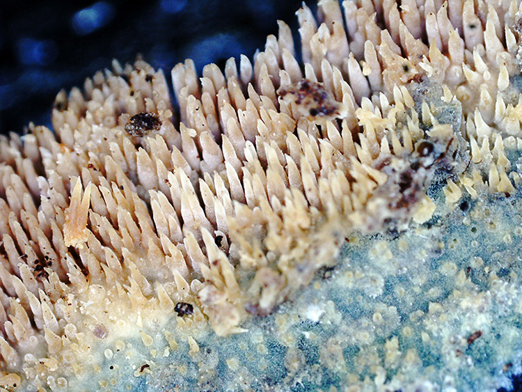 Un Corticial hydnoide fotografiado el pasado 23 de Febrero en la República Dominicana, sobre la superficie de un tronco muy húmedo de árbol tropical indeterminado en una zona pantanosa. Dada la dificultad que entrañaba su identificación, no quedó mas remedio que recurrir al análisis molecular, la secuenciación ITS determinó que se traba con una coincidencia del 99.82% de Mycoaciella efibulata NR_175188.