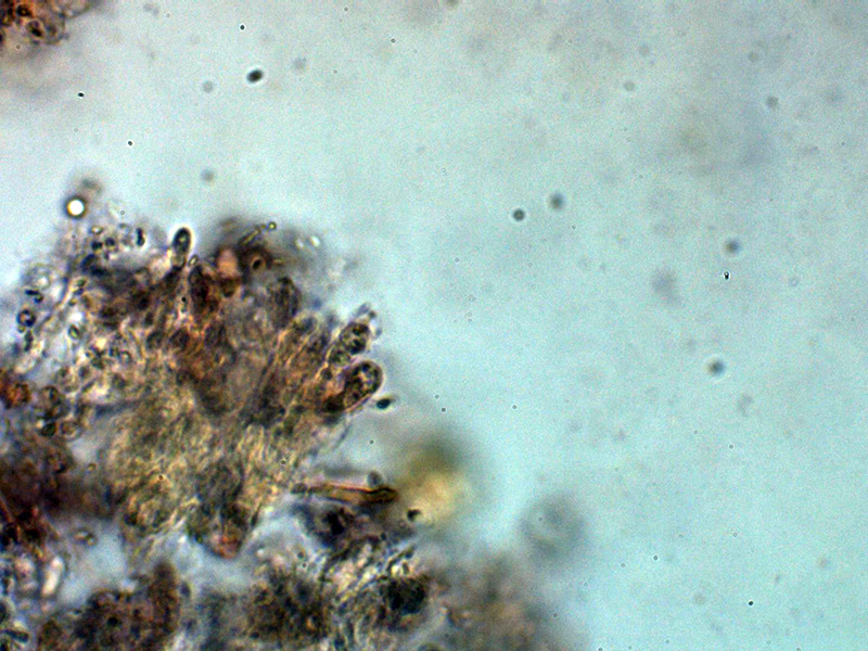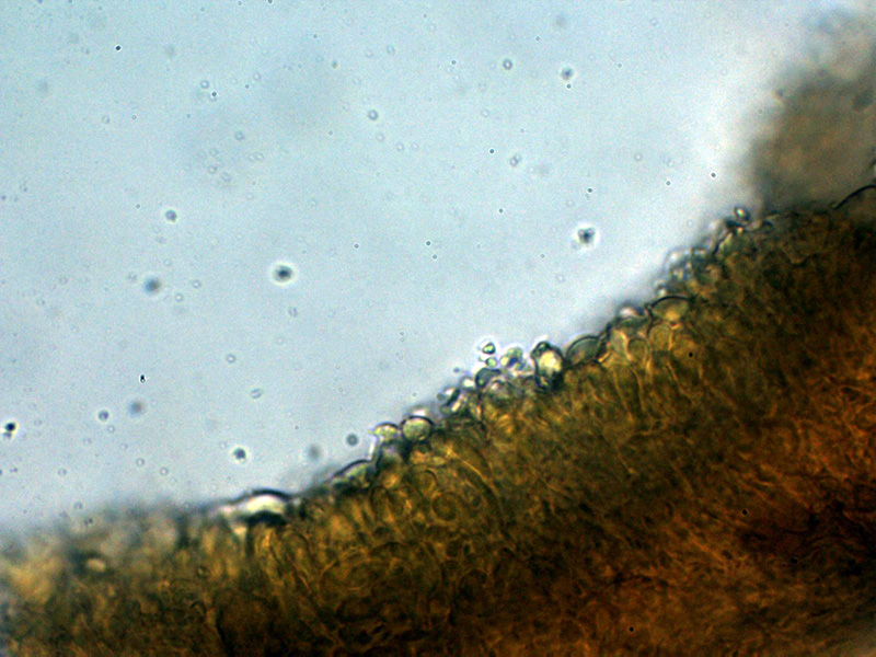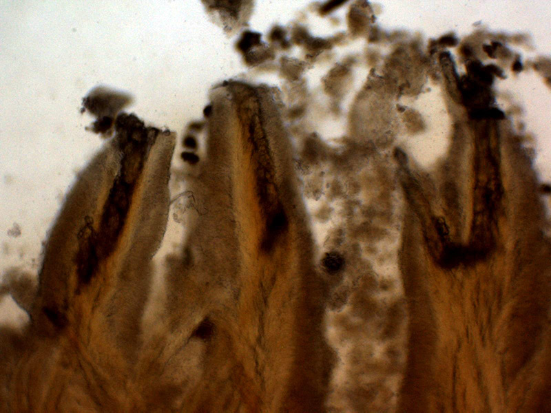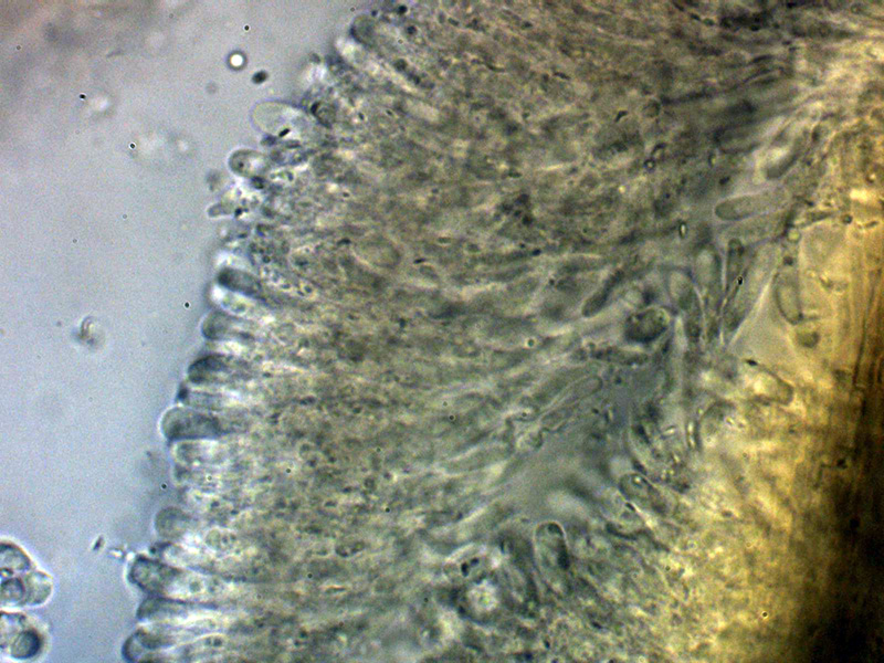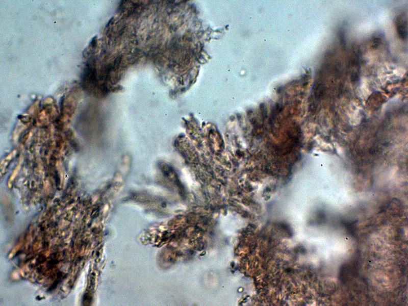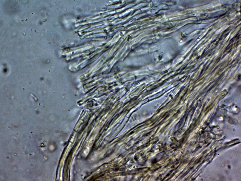 Aunque no se observan en el himenio cistidios diferenciados de los basidios o basidiolos, si hay unas cristalizaciones muy gruesas en el subhimenio a modo de esqueleto que sustentaría los acúleos.