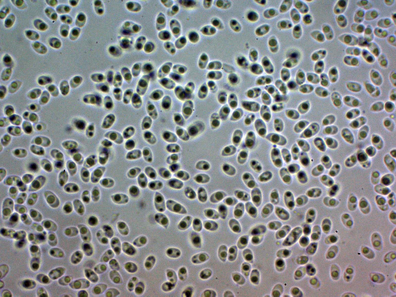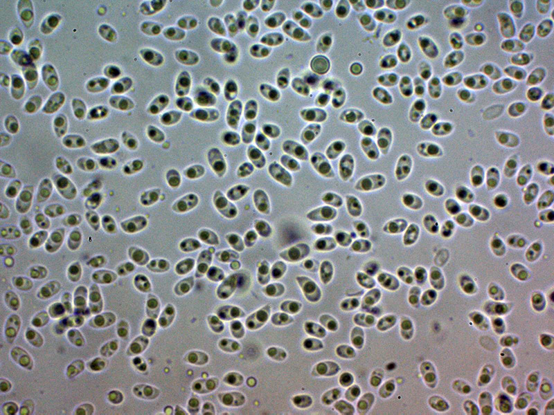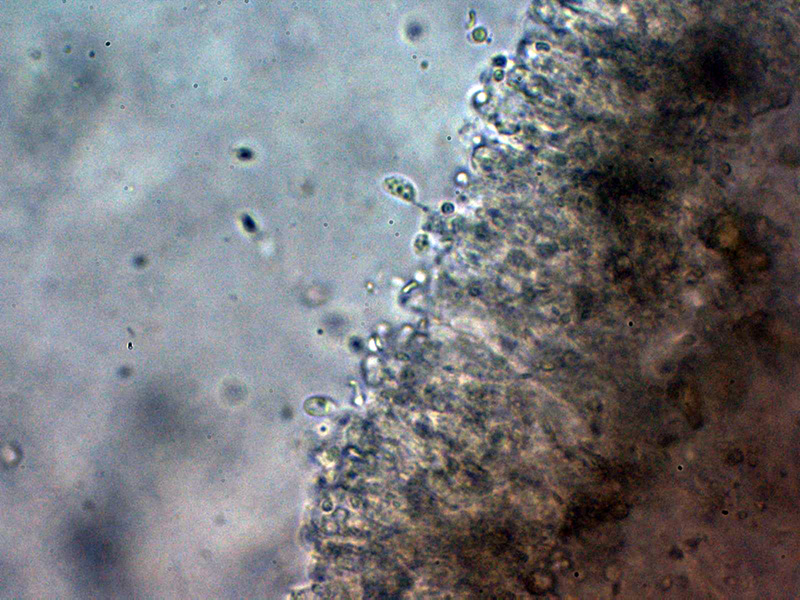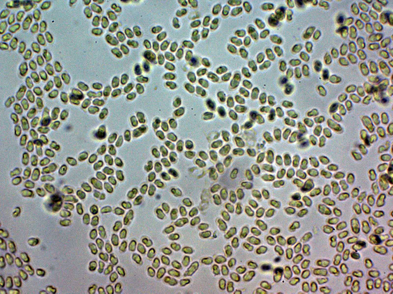Esporas de pared fina, elipsoides con un extremo apuntado, con una o varias gotas lípidas en su interior y con unas medidas en agua de: