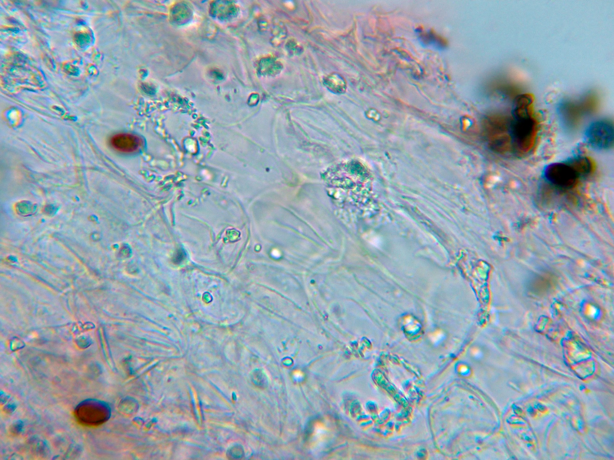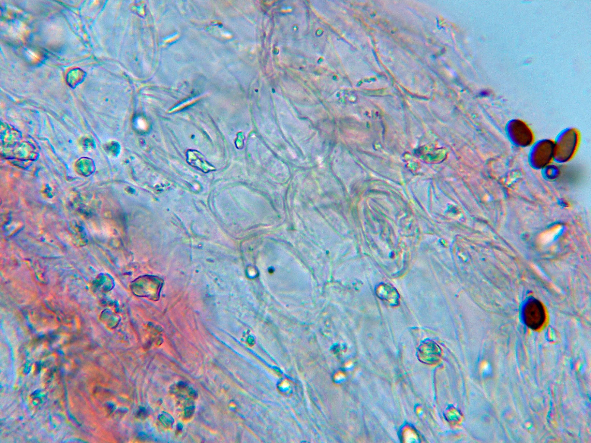Las esporas en Reactivo de Melzer, prácticamente sin reacción alguna:
