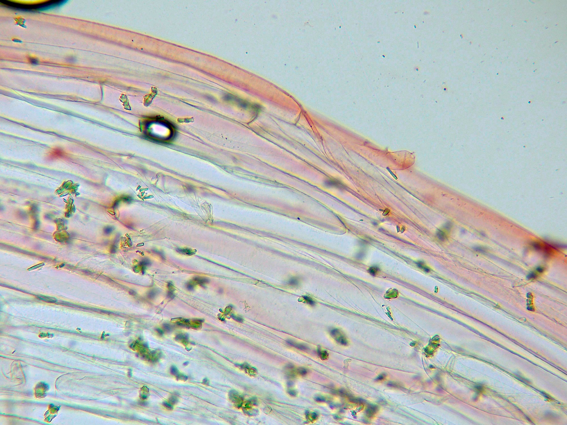 Pleurocistidios dispersos con una morfología parecida a los queilocistidios, los pleurocistidios en Rojo Congo diluído: