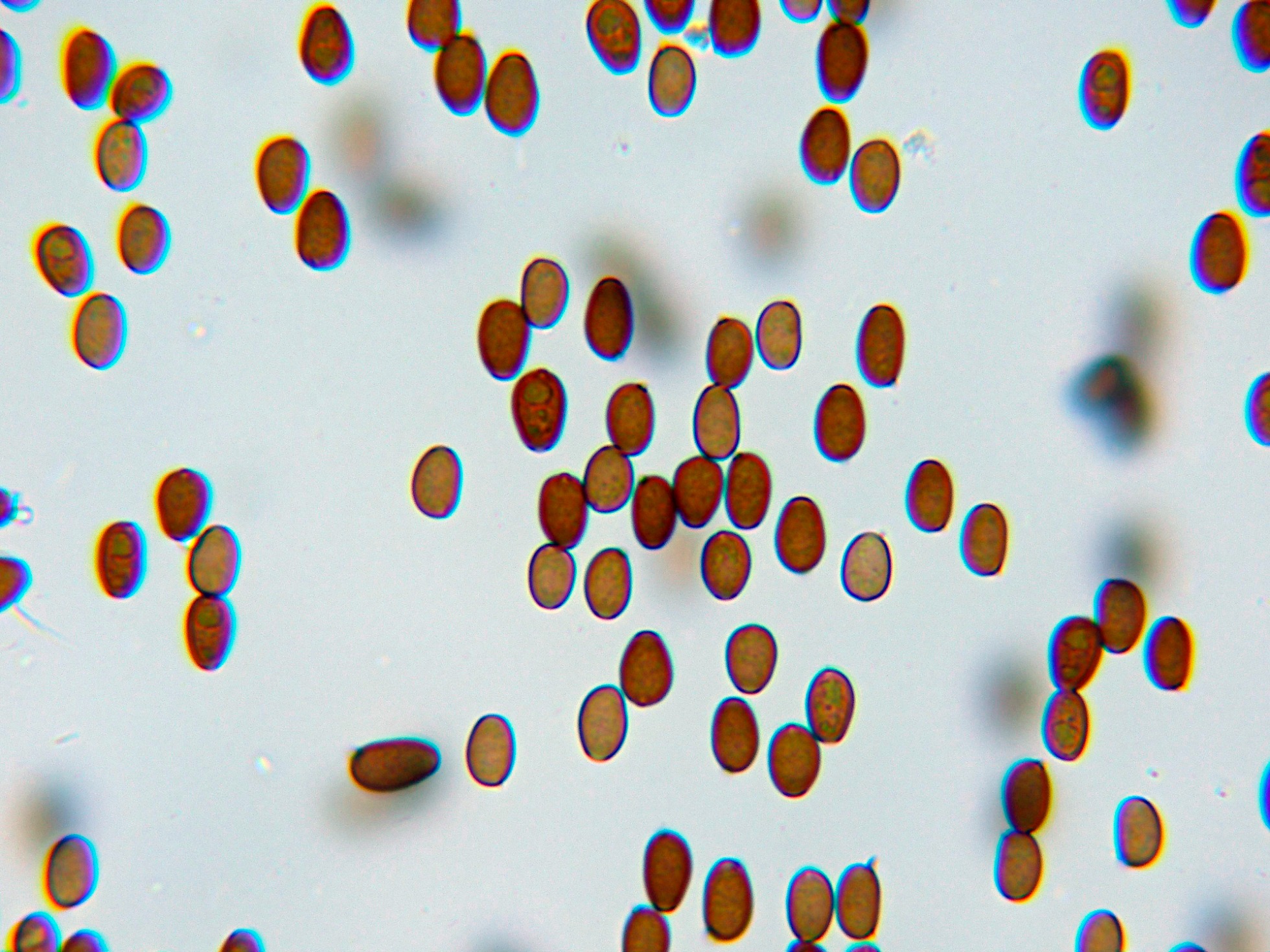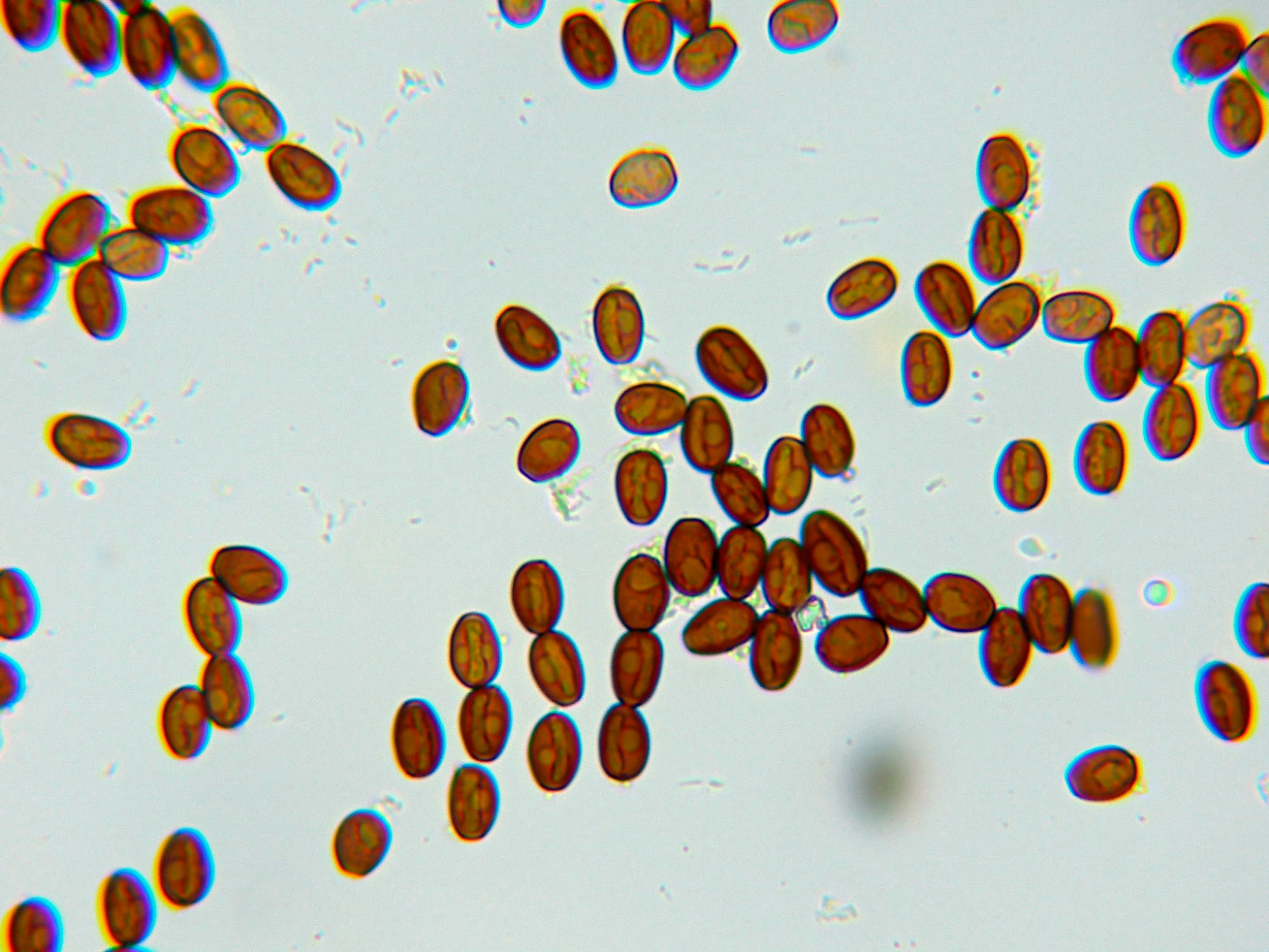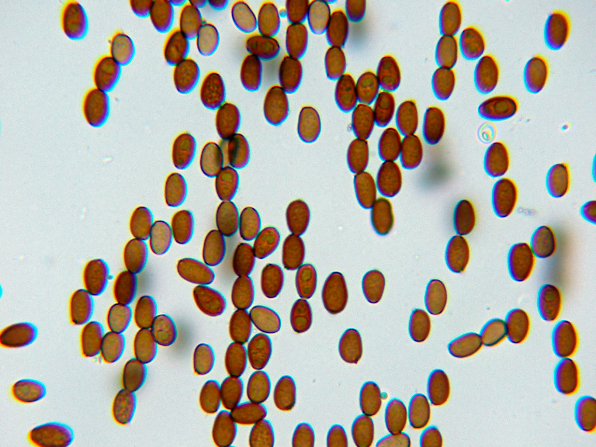 Las esporas en amoníaco, con un oscurecimiento a marrón oscuro: