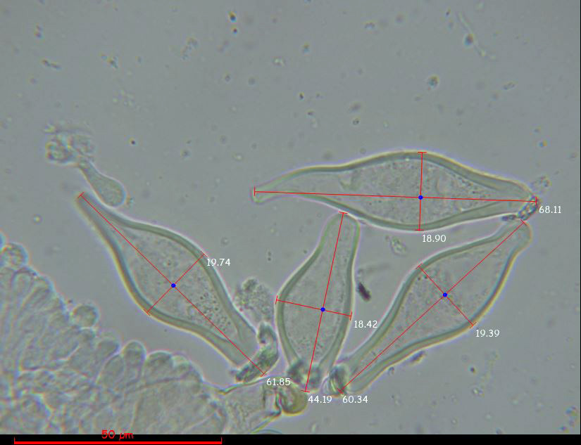 Queilocistidios con unas medidas de (44.2) 48 - 64.9 (69.1) × (12.7) 13.8 - 21.1 (22.4) µm.