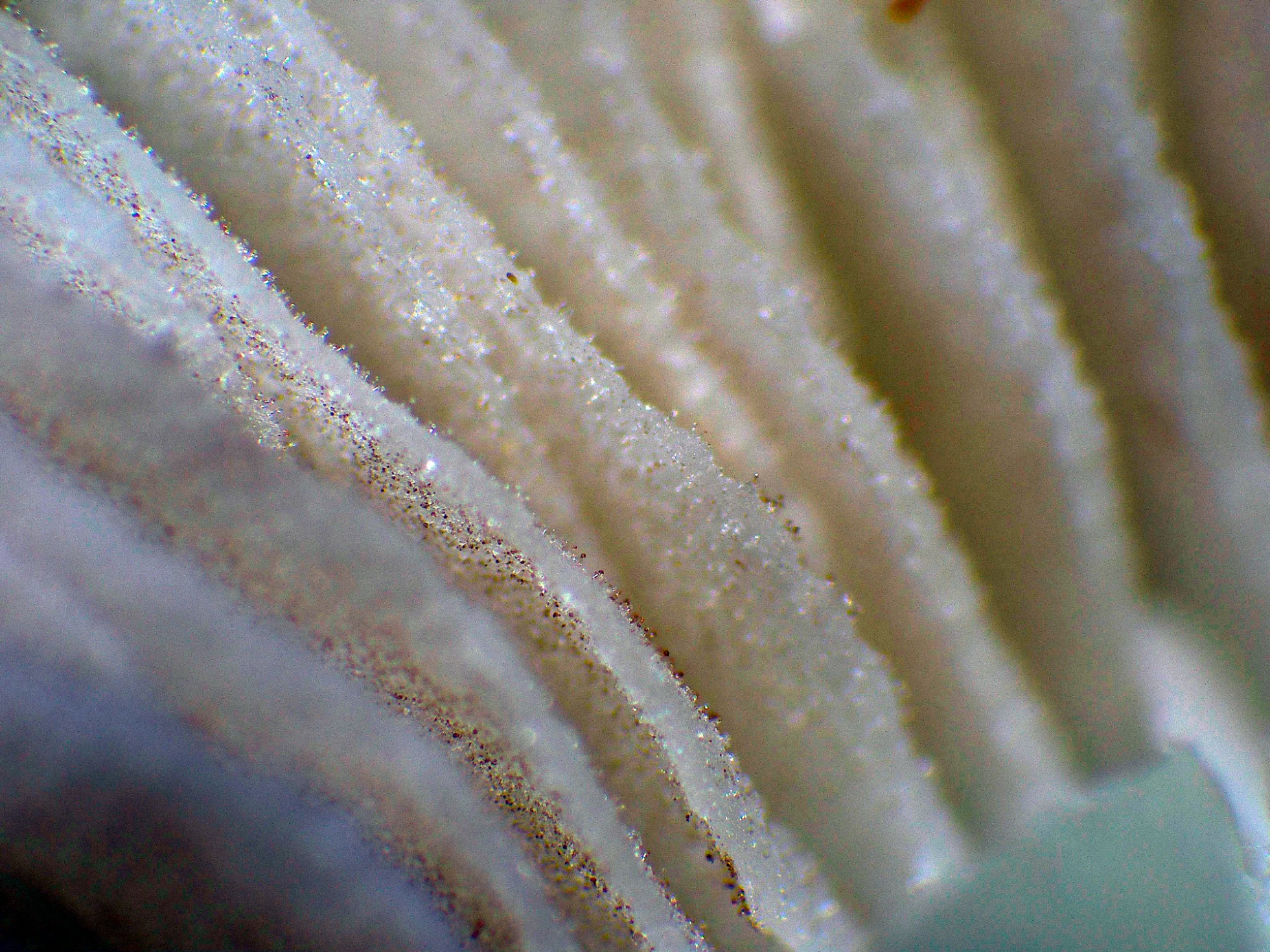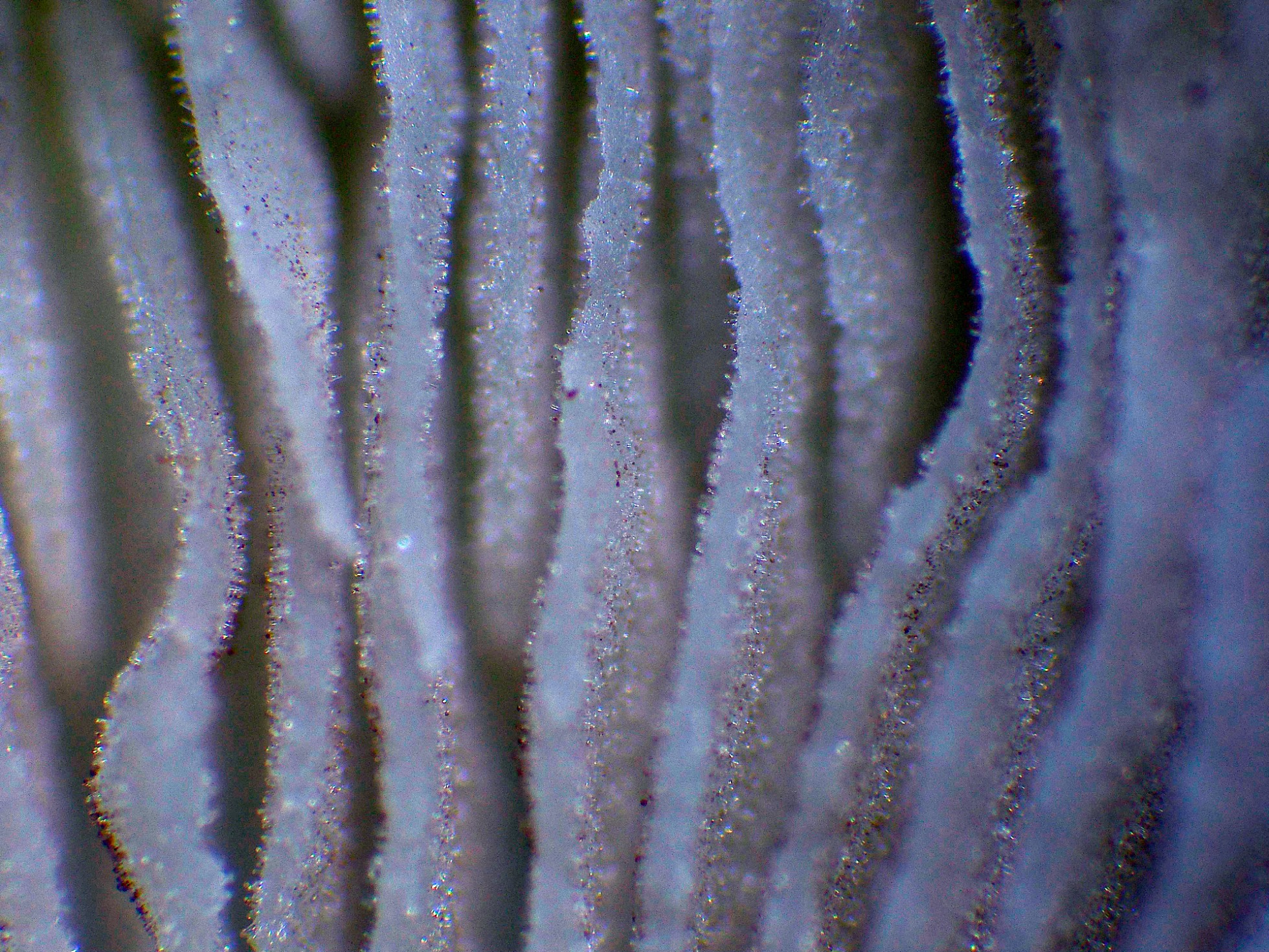 Un par de imágenes de la arista laminar a 40 aumentos, donde se observan pequeños puntos marrones que se corresponden con las esporas: