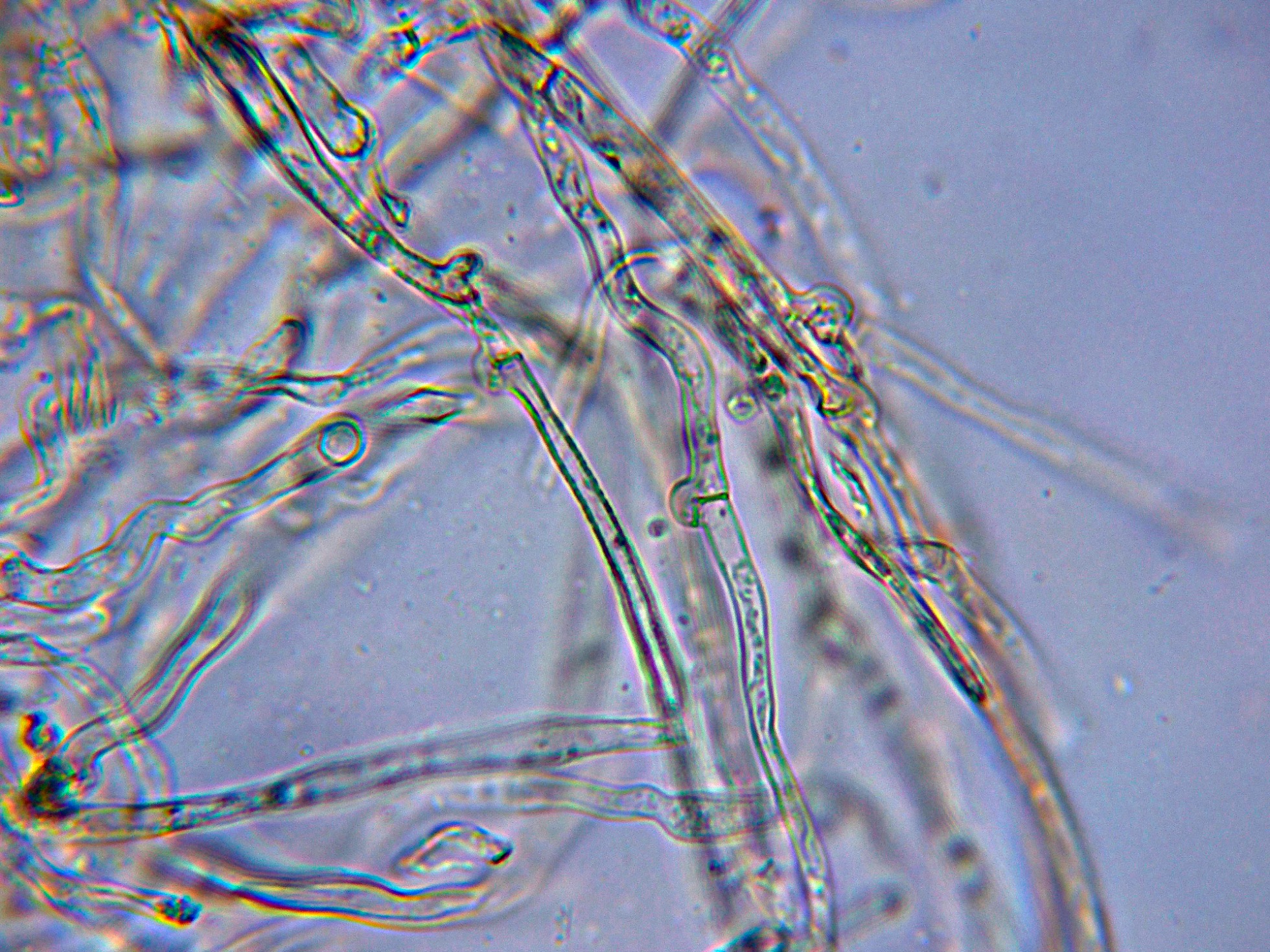 Suprapellis en agua a 1000 aumentos, con hifas fibuladas: