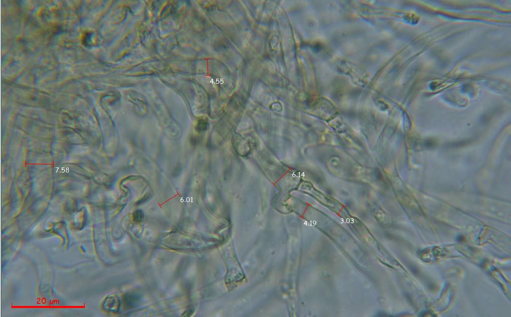 Medidas de la anchura de las hifas de la suprapellis, de entre 3 a 7,6 micras.