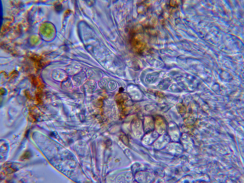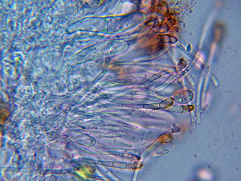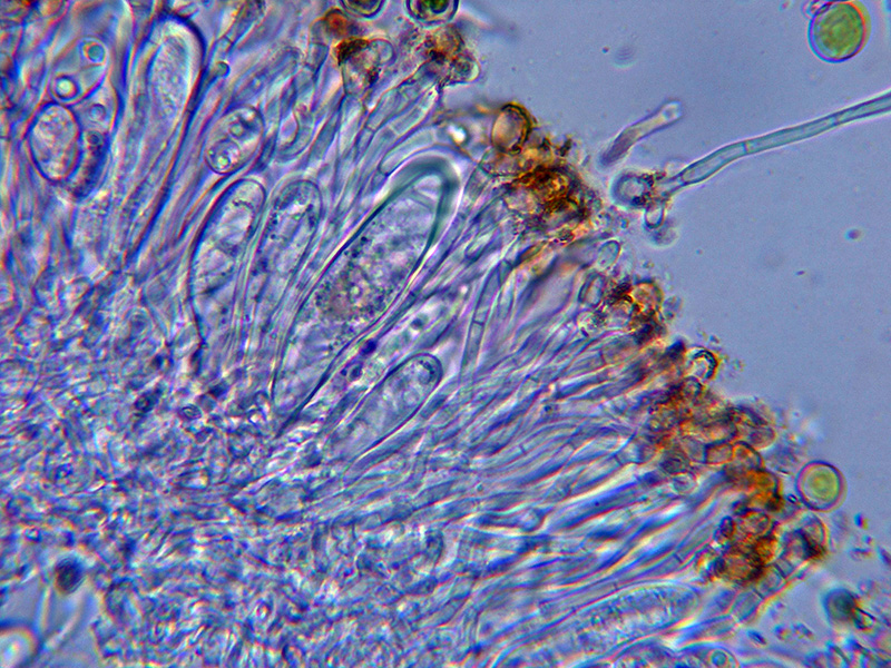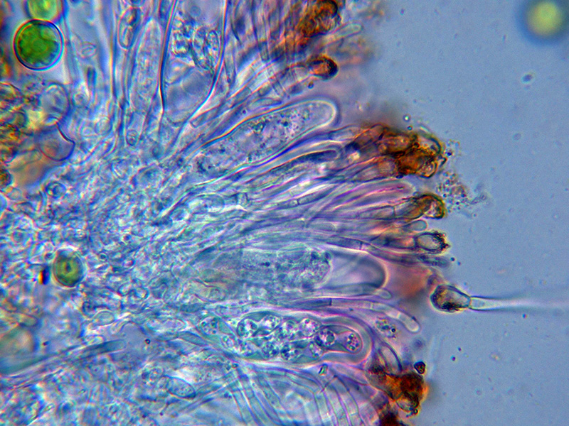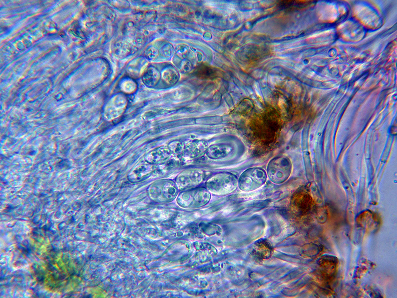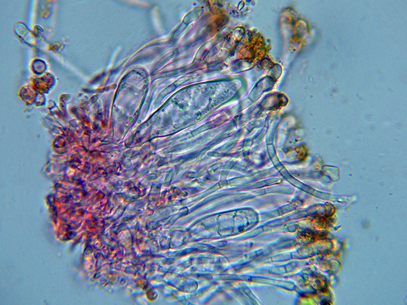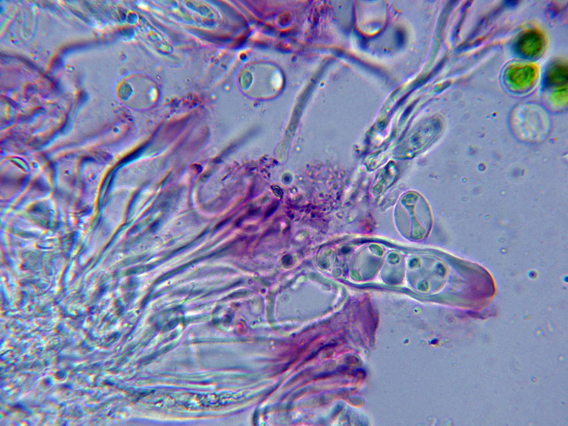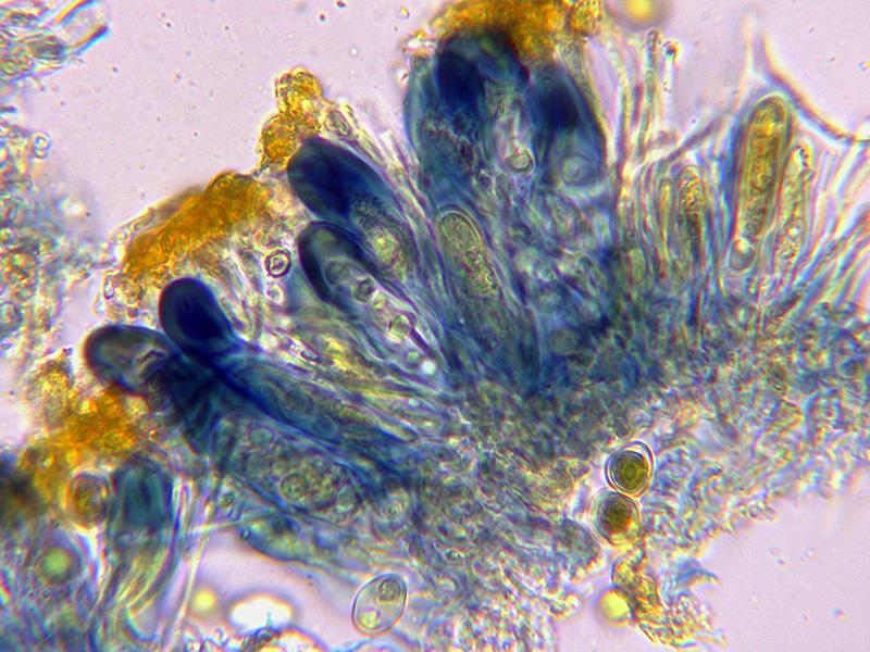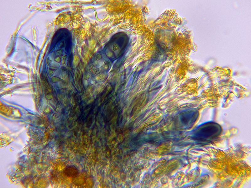 Himenio que al aplicar KOH también adquiere tonos púrpura intensos, especialmente en los ascos.