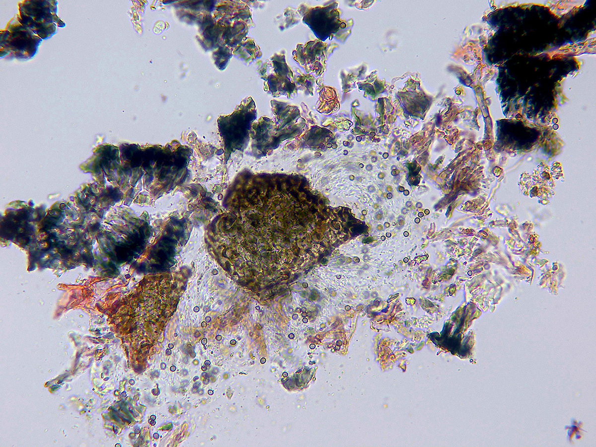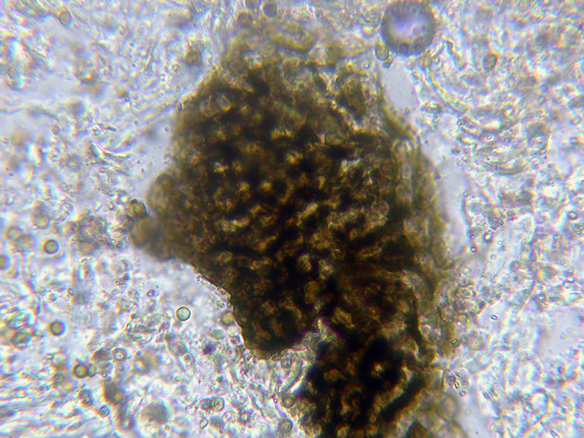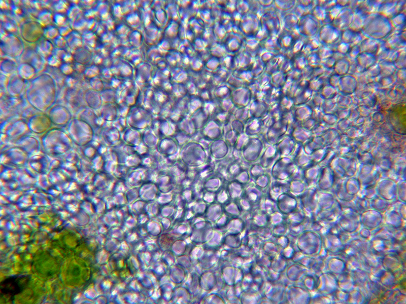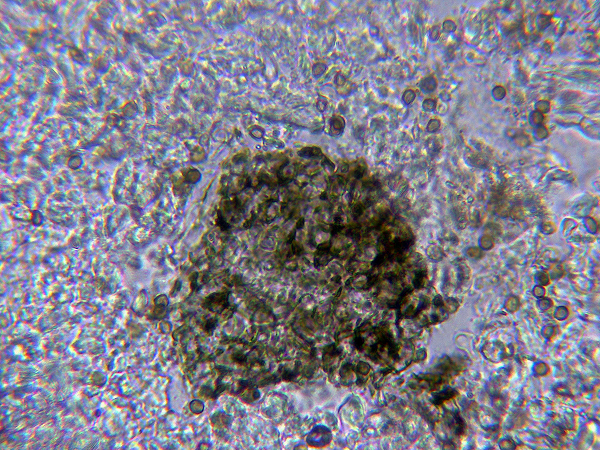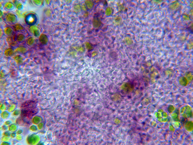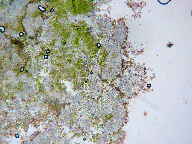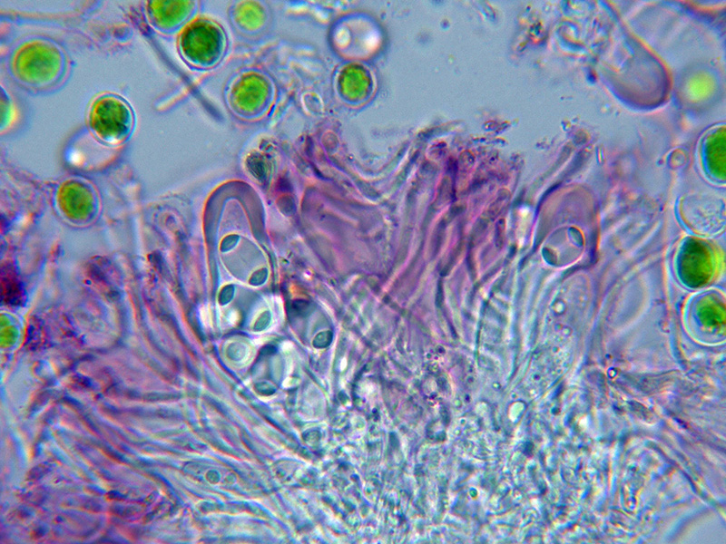 Excípulo formado por hifas globosas de pequeño tamaño que se tiñen de púrpura con la aplicación de KOH al 20%. con una gran cantidad de algas en su base.