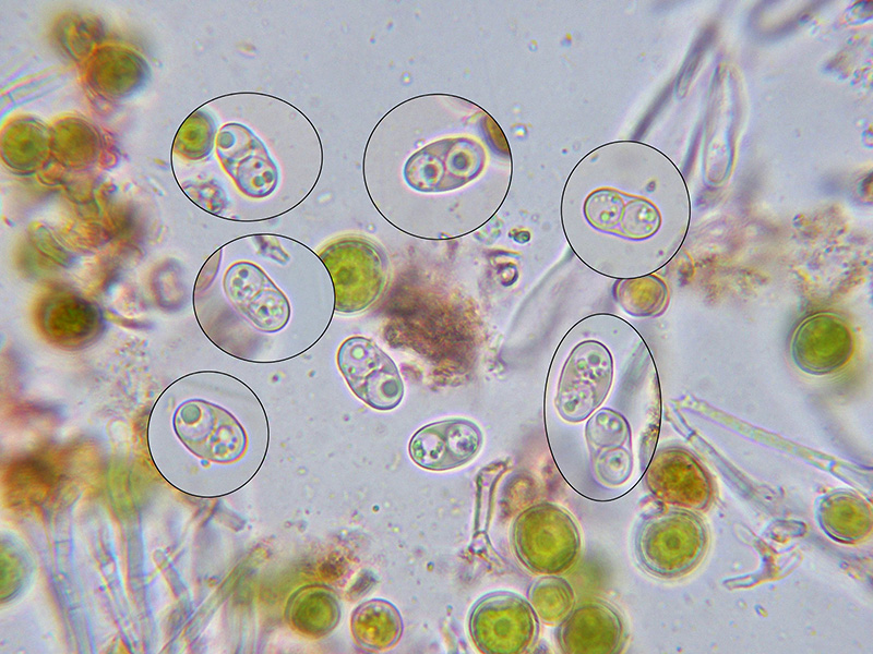 Ascos ostospóricos, que producen ascosporas elipsoidales, de pared fina, bigutuladas y con unas medidas de: