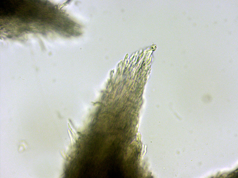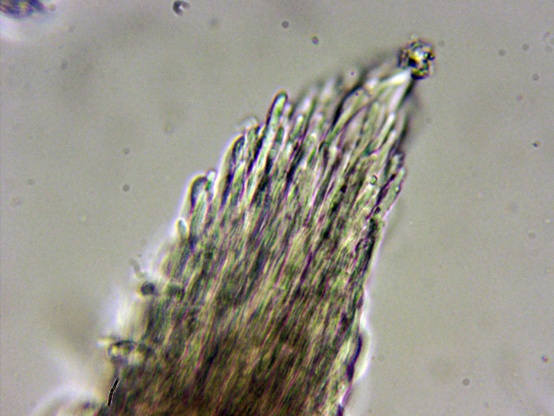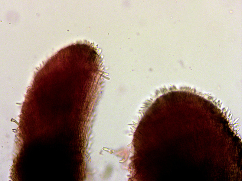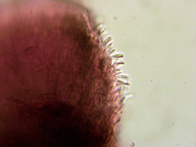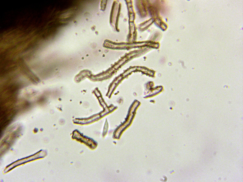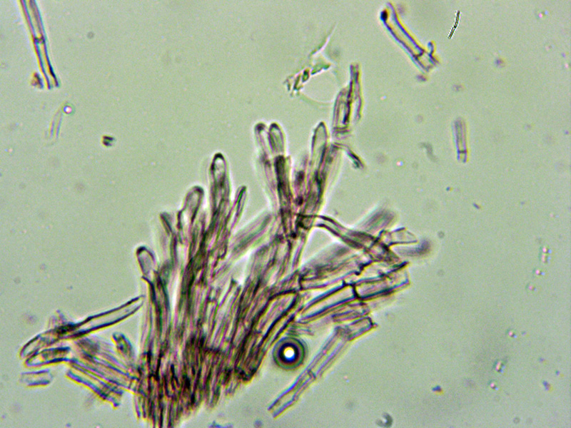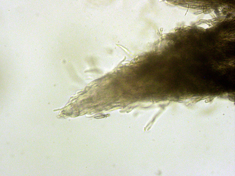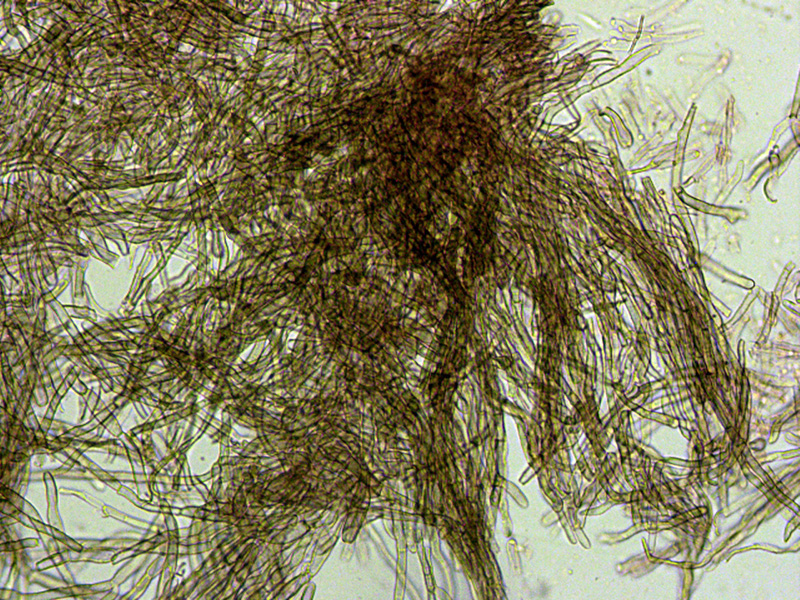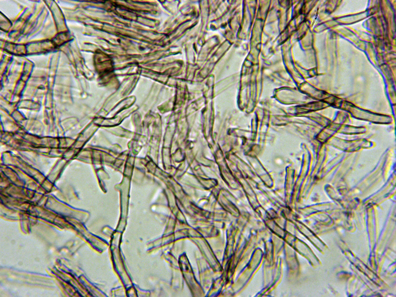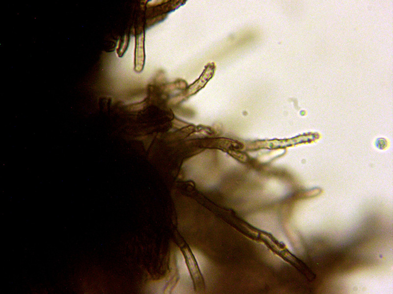Hifas de la base algo más anchas (hasta 3,8 µm.), con tenue pigmento marrón en su interior y algunas incrustaciones en su superficie.