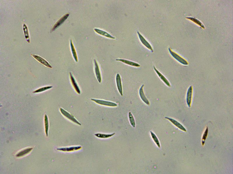 Conidios fusiformes, más apuntados en uno de los extremos, algunos de ellos ligeramente alantoides, con unas medidas de: