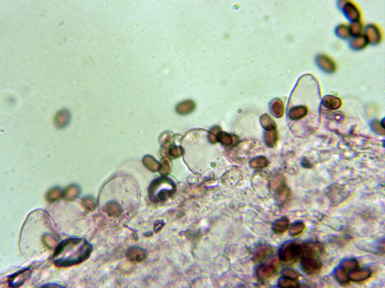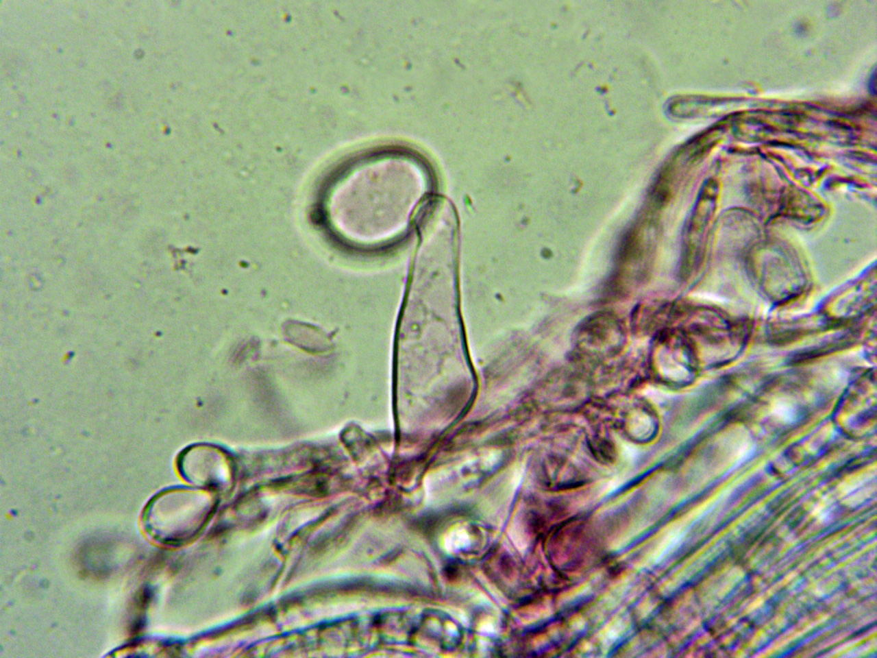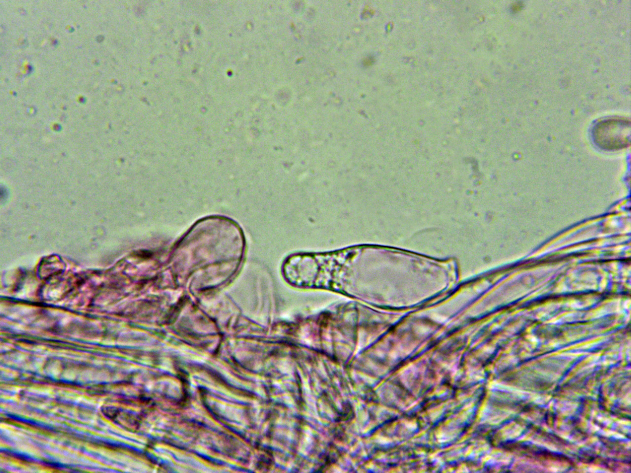 Abundantes hifas terminales en la arista laminar de un solo tipo, a modo de queilocistidios, entre esféricos, piriformes a cortamente elipsoides, pedunculados en la base: