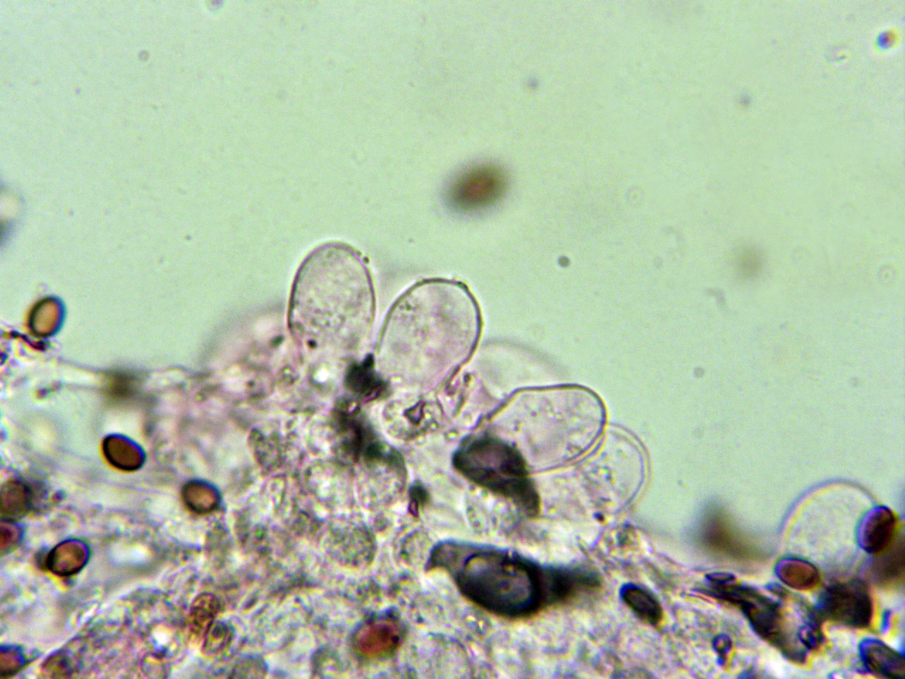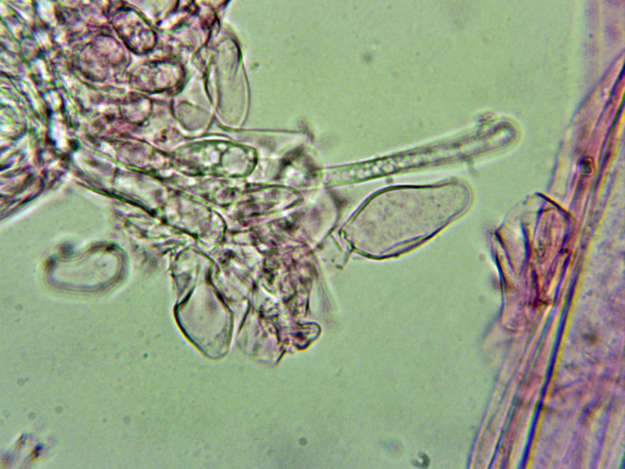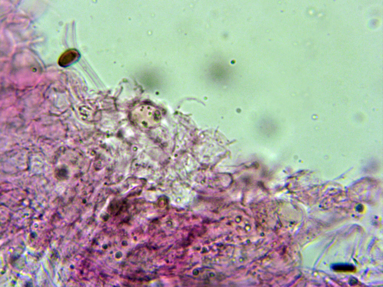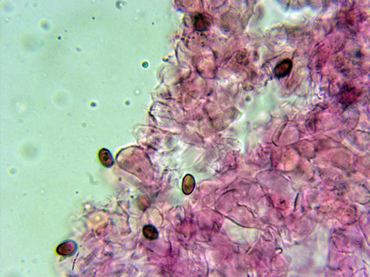 Abundantes hifas terminales en la arista laminar de un solo tipo, a modo de queilocistidios, entre esféricos, piriformes a cortamente elipsoides, pedunculados en la base: