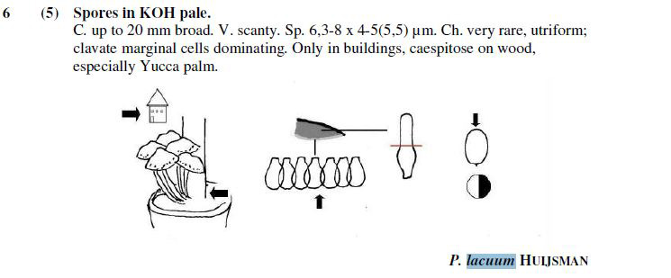 Observaciones: Esta determinación se ha hecho siguiendo las Claves de Andreas Melzer, que sin pleurocistidios, con abundantes células marginales piriformes, esporas medianamente pigmentadas (con una pigmentación similar a la Psathyrella candolleana) y con unas medidas esporales de 6,3-8 x 4-5(5,5) μm. conducen solo a la Psathyrella lacuum propuesta. Dejo una captura de las Claves: