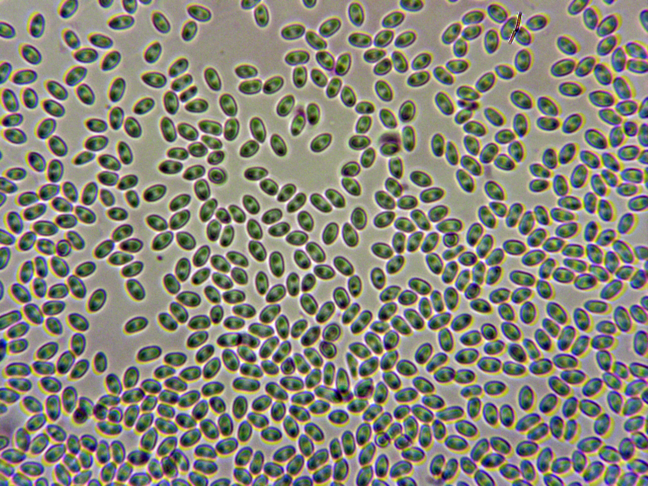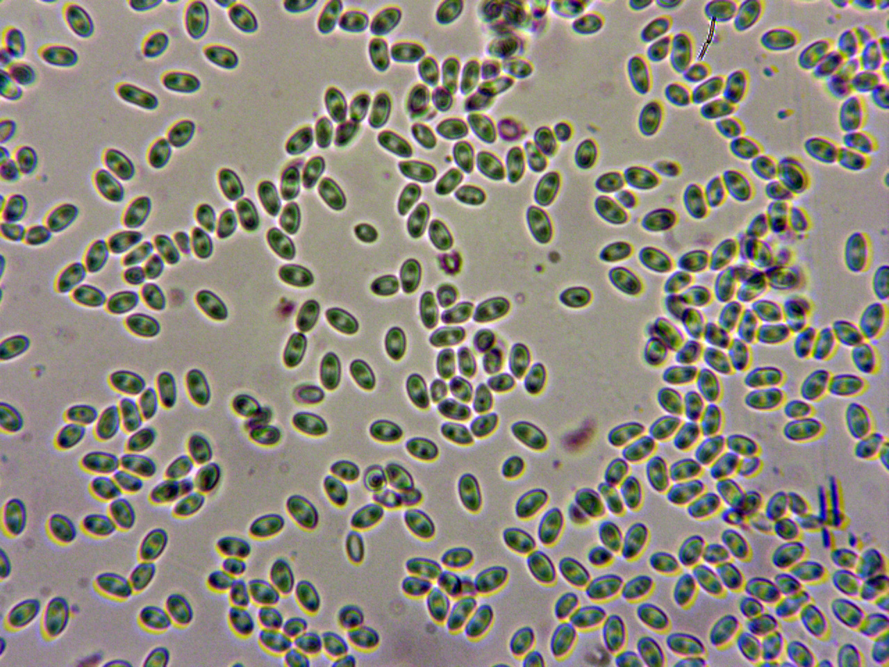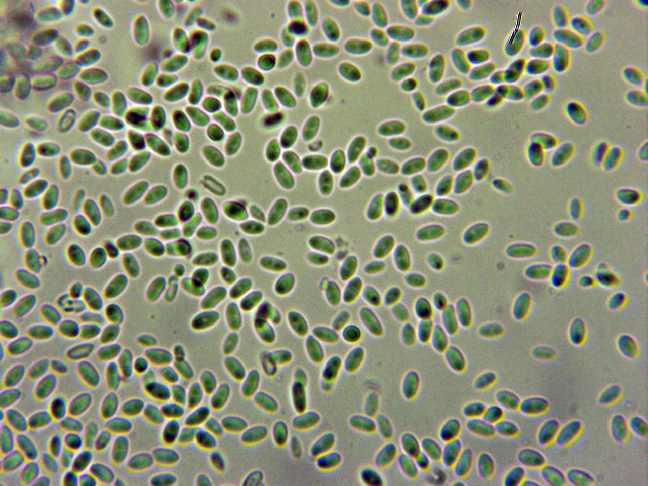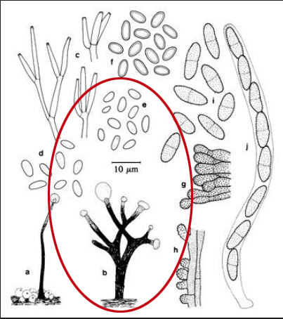 En la imágen se pueden apreciar dos medidas distintas de los conidios, los del círculo al igual que el aspecto macro totalmente acordes con el presente estudio.