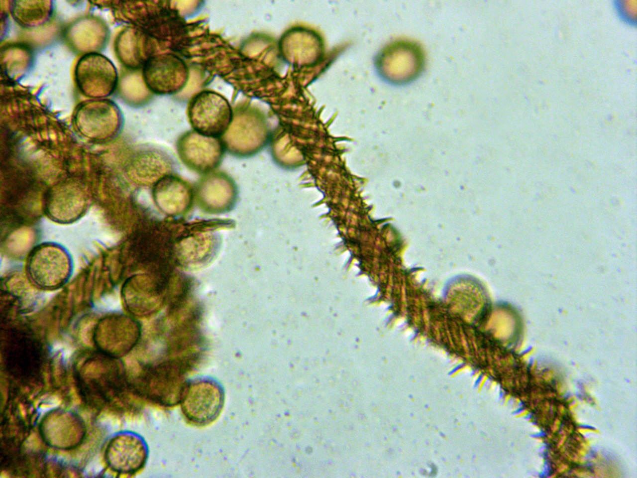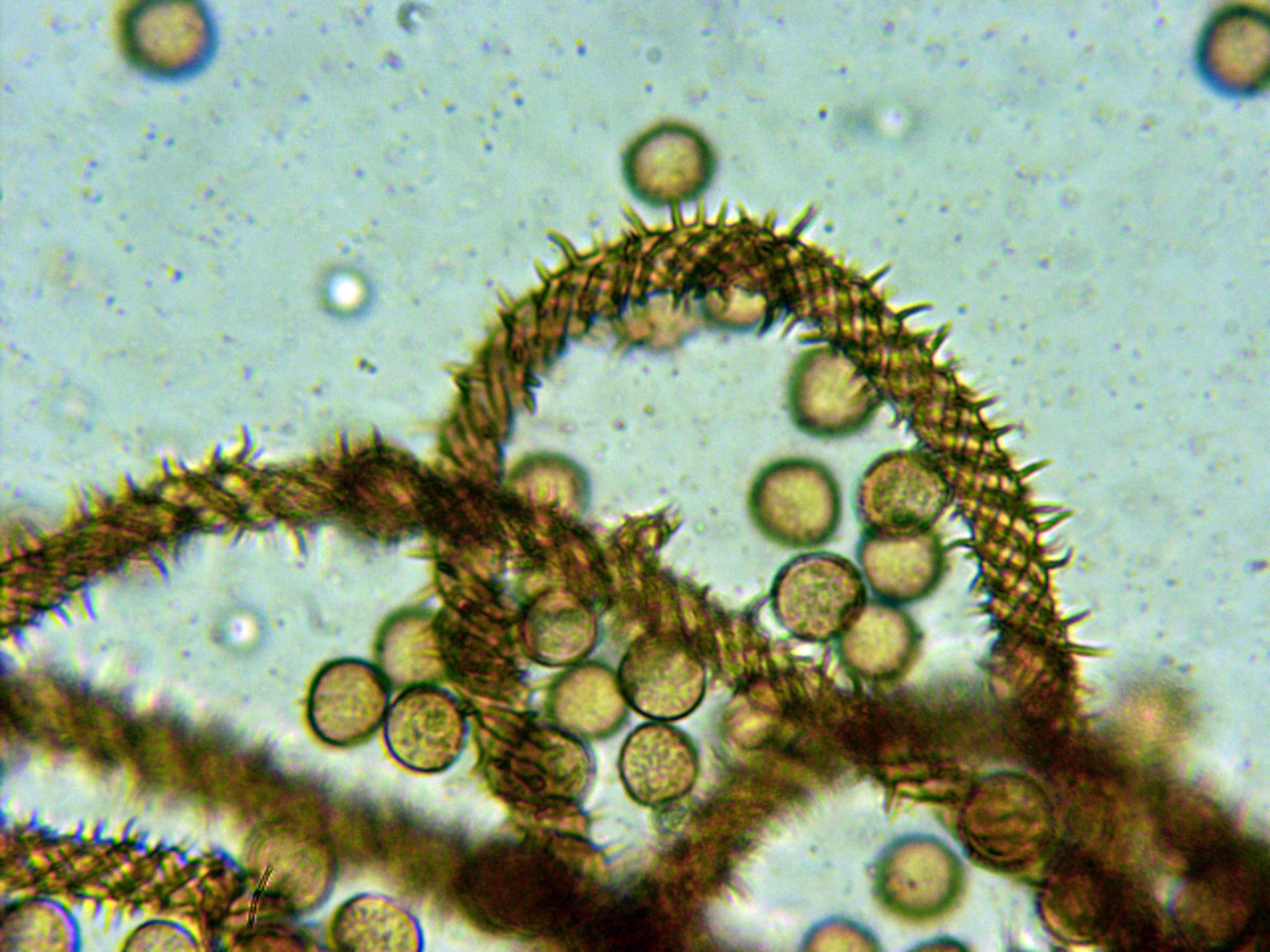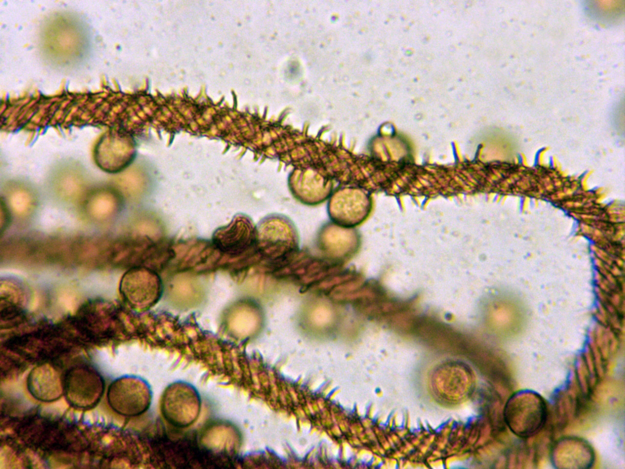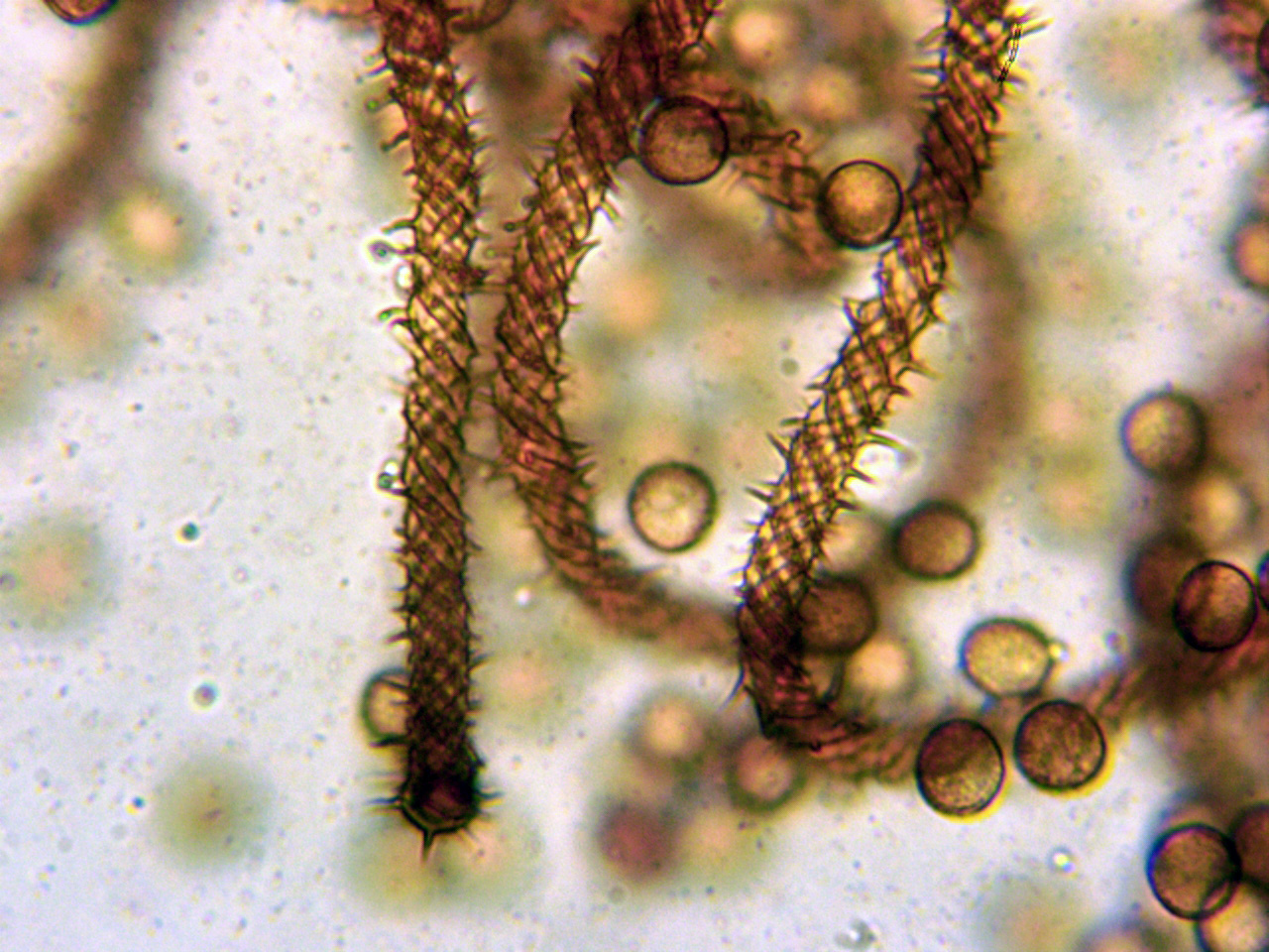 Capilicio con eláteres escasos de color rojo anaranjado con una anchura de entre 5,3 a 5,8 micras sin contar la ornamentación, con espinas muy marcadas y 3 bandas dispuestas en espiral.