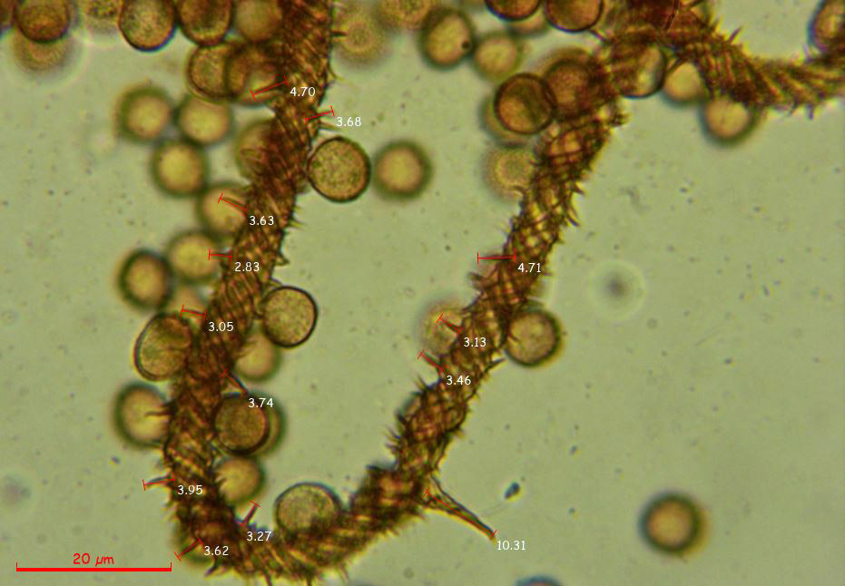 Las espinas del capilicio según bibliografía de entre 3 y 6 micras, aunque pude observar alguna aislada que superaba las 10 micras.